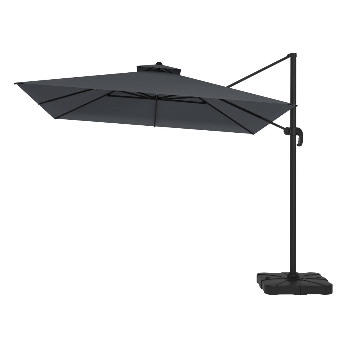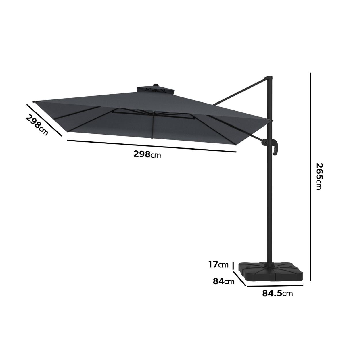 Features we love 3 x 3m robust parasol with weighted base and; cover. Canopy offers plenty of shade from direct sunlight and; heat. Cantilever design top vents and; water-resistant fabric Height adjustable and 360⁰ rotation. Folds down for easy storage and manoeuvrability All about me. Make a stylish addition to your garden with this cantilever parasol. The canopy can be rotated 360⁰ with the foot peddle plus it can be tilted and height adjusted thanks to the crank mechanism so you can enjoy the outdoors whilst keeping yourself protected. Built with a sturdy frame structure it'll make a durable addition to your garden this summer. Plus with water-resistant fabric it'll withstand a light rain shower. The weighted base that is included can be filled with water giving your parasol even more stability. Enhance the life of your garden furniture-. This product has been designed to be used outdoors. While the internal structure is weatherproof we recommend that you fold it down and store it indoors to enhance its longevity. Why not invest in one of our garden stores to help keep the fabric (canopy/cover) parts dry and prevent any mould or mildew from forming. Need to know. Dimensions. H280 x W298 x D298cm Base dimensions. H17 x W84.5 x D84cm Colour. Dark grey (parasol) and black (base) Finish. Metal and upholstery Material. Steel aluminium and thick polyester fabric For use. Outdoors Weighted base. Yes Unfilled base weight. 16kg Water filled base weight. 100kg Assembly required. Yes What's in the box? 1 x Parasol1 x Parasol base1 x Parasol cover View Assembly Instructions »..