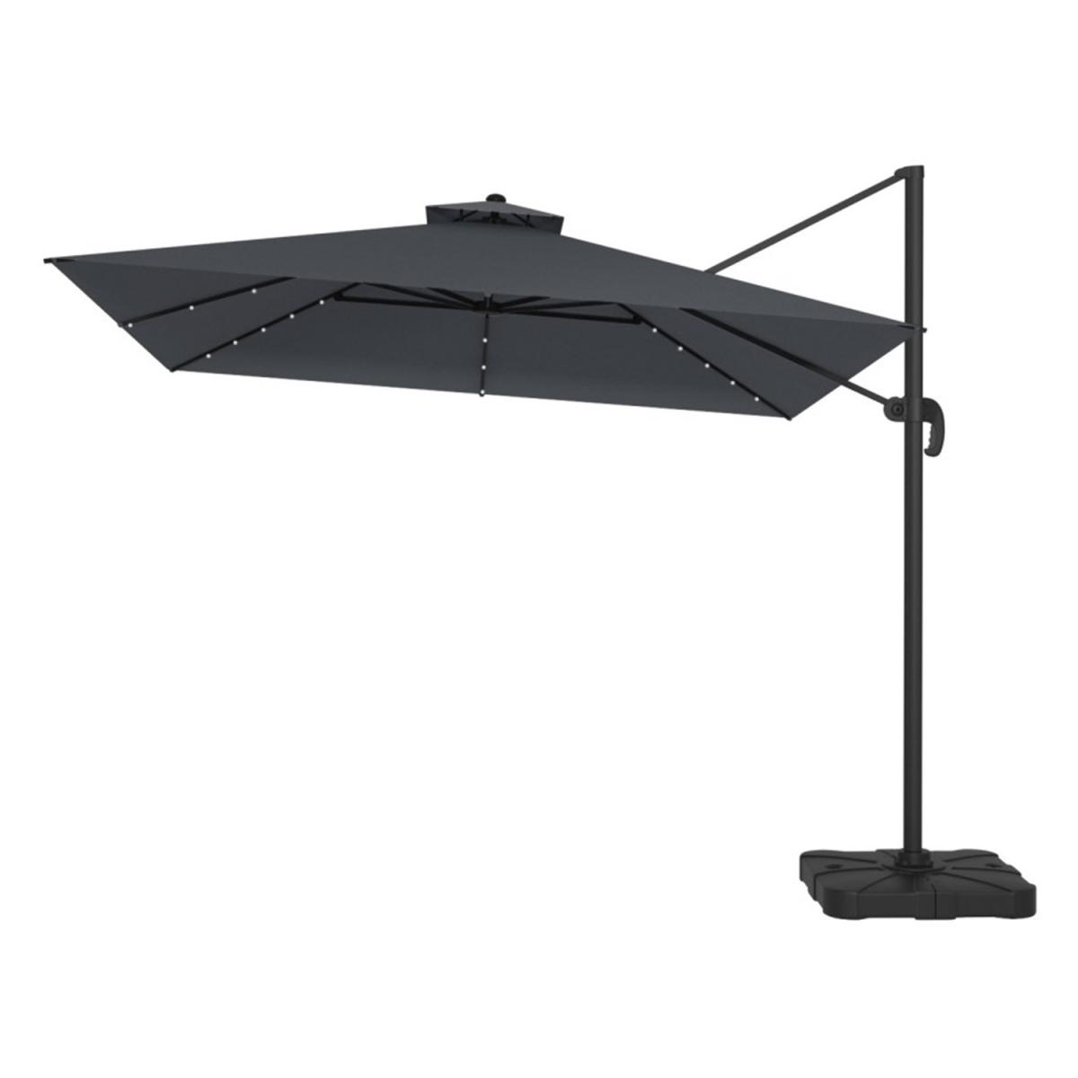 Features we love Approx. 3 x 3m parasol with weighted base and; cover8 ribs construction with 32 solar powered LED lights. Canopy offers plenty of shade from direct sunlight and; heat. Cantilever design top vents and; water-resistant fabric Height adjustable AND 360⁰ rotation All about me. It's time to light up your garden with this stylish parasol. It features solar-powered LED lighting so no electricity is required. Take cover during the day thanks to its vast coverage; come dusk switch on the lights and enjoy the outdoors for even longer. Plus with water-resistant fabric it'll withstand a light shower. With a sturdy frame structure and a canopy that can be rotated 360⁰ with the foot peddle tilted and height adjusted thanks to the crank mechanism it'll make a durable and versatile addition to your garden this summer. Plus the weighted base that is included can be filled with water giving your parasol even more stability. Enhance the life of your garden furniture-. This product has been designed to be used outdoors. While the internal structure is weatherproof we recommend that you fold it down and store it indoors to enhance its longevity. Why not invest in one of our garden stores to help keep the fabric (canopy/cover) parts dry and prevent any mould or mildew from forming. Need to know. Dimensions. H280 x W298 x D298cm Base dimensions. H17 x W84.5 x D84cm Colour. Dark grey (parasol) and black (base) Finish. Metal and upholstery Material. Steel aluminium and thick polyester fabric For use. Outdoors Weighted base. Yes Unfilled base weight. 16kg Water filled base weight. 100kg Assembly required. Yes What's in the box? 1 x Parasol1 x Parasol base1 x Parasol cover View Assembly Instructions »..