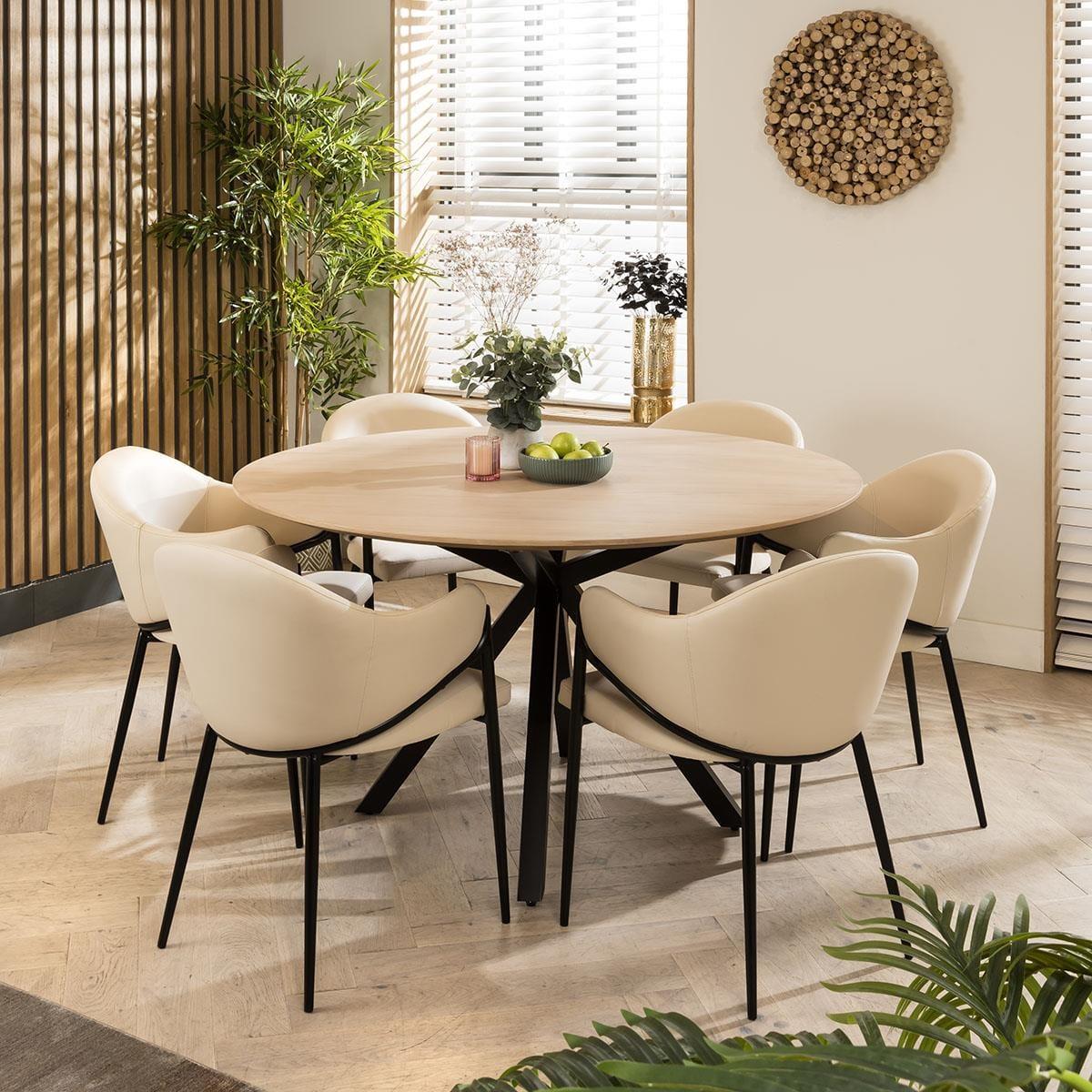 Our Ashley dining chair is stylish and comfortable featuring a carver design with arms and a wrap around backrest. The black powder coated metal frame adds durability, while the cream clay faux leather upholstery is easy to maintain. This modern dining chair is perfect for adding modern elegance to any dining space. The carver style chair features arms, providing you with extra support and comfort during those long dinner conversations. The wrap around backrest not only adds a modern and sleek look to the chair, but also ensures that you can sit back and relax in complete comfort. One of the standout features of this dining chair is its unique frame design. The frame is made from black powder coated metal, giving it a sturdy and durable construction that will last for years to come. The black color adds a touch of sophistication to the overall design, making it a versatile piece that can easily blend in with any existing decor. The seat and backrest of this dining chair are upholstered in cream clay faux leather, adding a touch of luxury to your dining experience. Not only does the faux leather look and feel like the real thing, but it is also incredibly easy to clean. Simply wipe away any spills or stains with a damp cloth, and your chair will look as good as new. With its combination of style, comfort, and easy maintenance, this dining chair is the perfect addition to any dining room or kitchen. W53cm D55cm H81cm Seat Height Set of 4 Dining Chairs