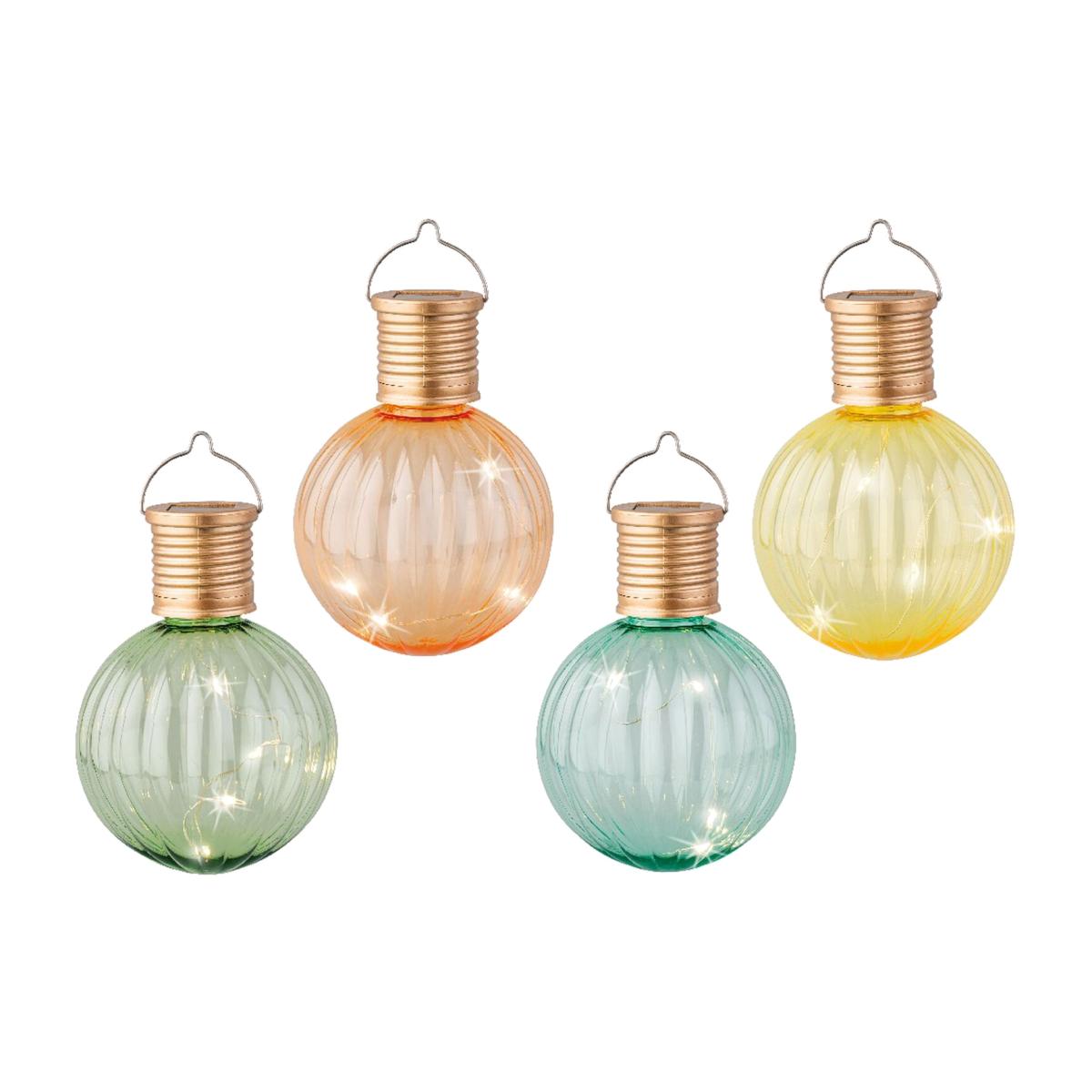 Create a charming and welcoming atmosphere to your outdoor space with this set of 4 colourful hanging garden solar lights. The lightweight yet durable plastic construction makes them perfect for outdoor use to be enjoyed by all your friends and family. Each hanging light is filled with 5 micro LED wire lights which illuminate with a warm white glow. The globe will give up to 6 hours of active light once charged with its built-in solar panel on the top of the globe. Its solar function once switched on, will automatically light us at dusk without the need for batteries or a plug. An ecofriendly way of lighting up your garden!Measuring 8cm in dimeter and 11cm in height, the coloured plastic globes will add real character and feature to your garden or patio area. With a hanging hook included, simply place the lights on a bracket, a hook, garden wall or fence, pergola or parasol and enjoy once dusk arrives.