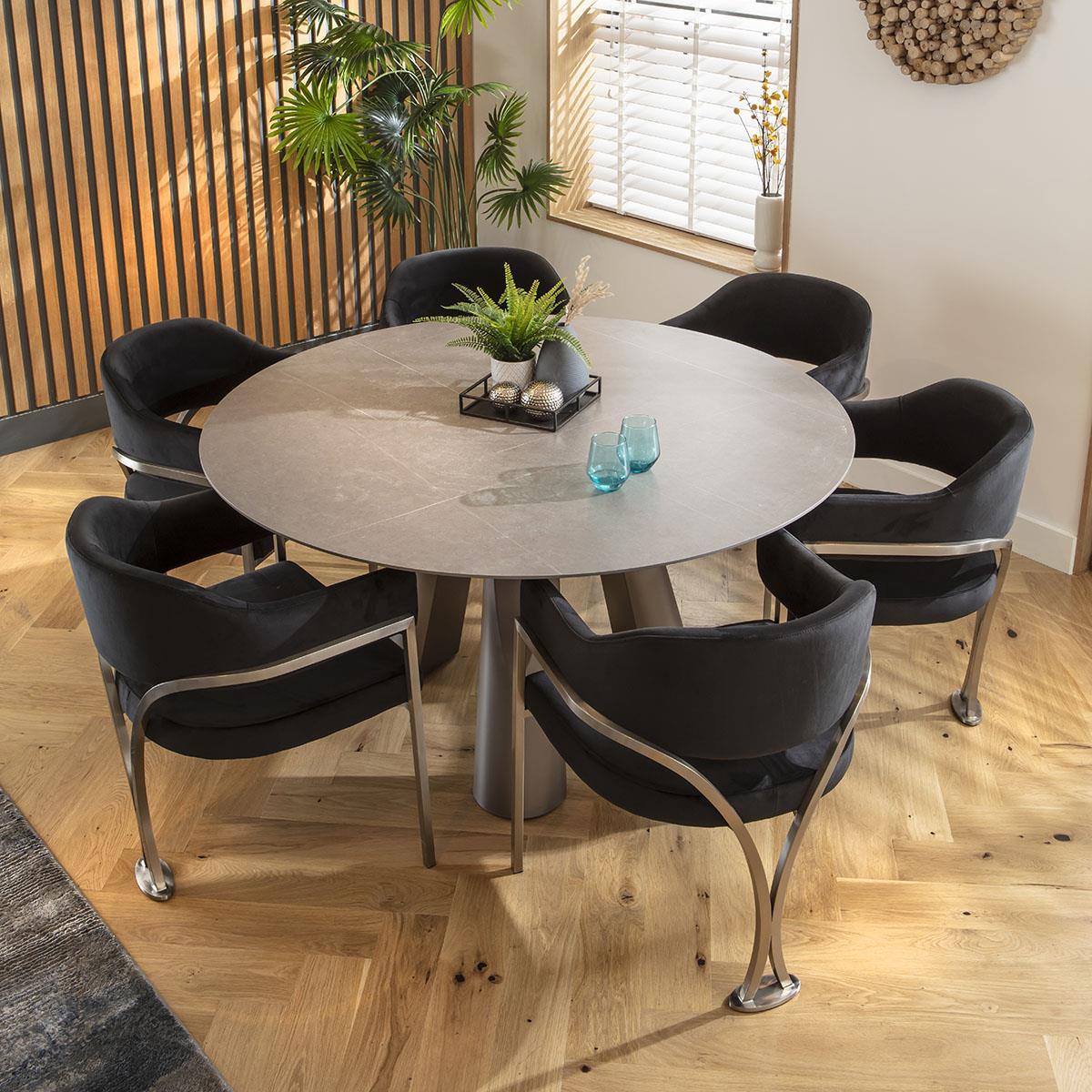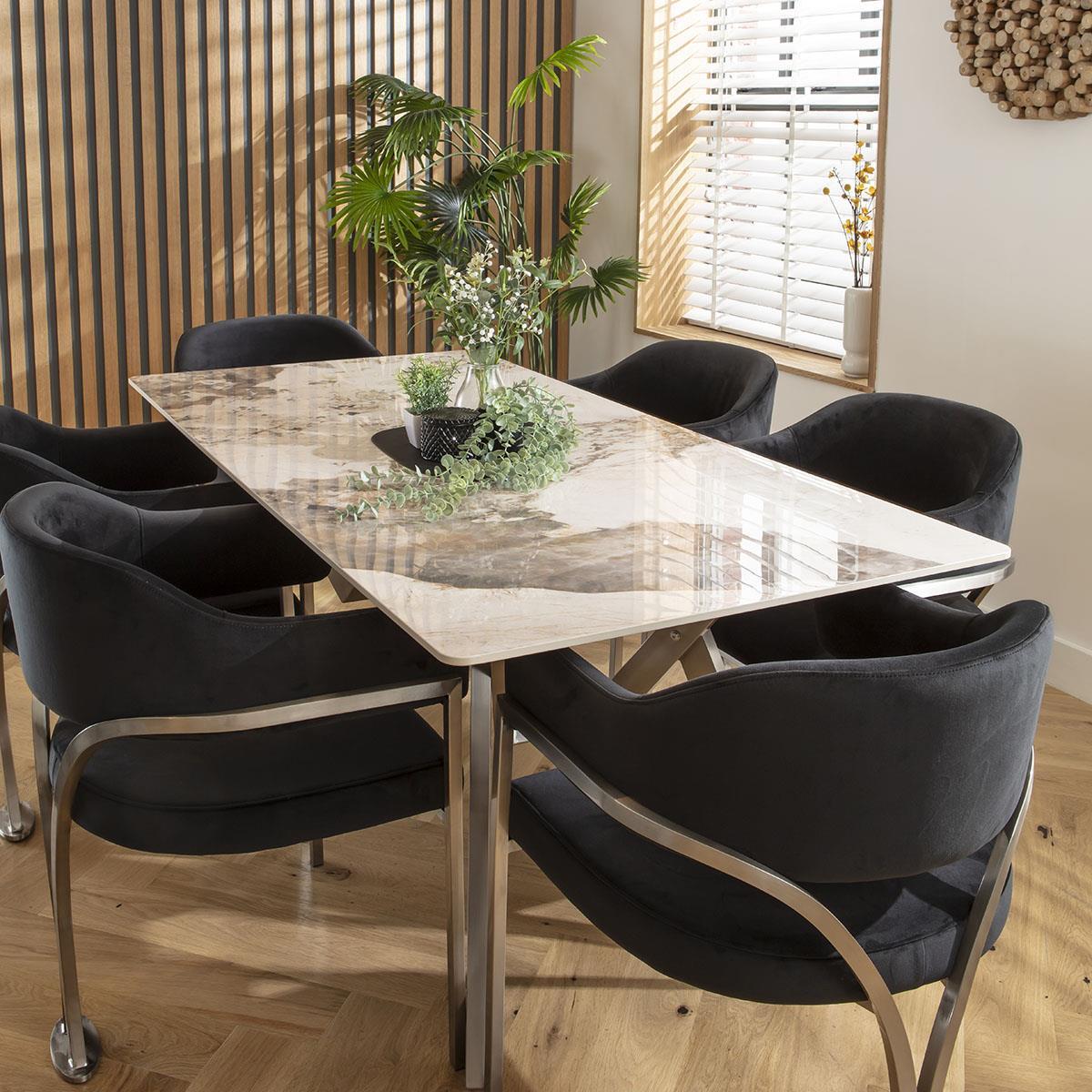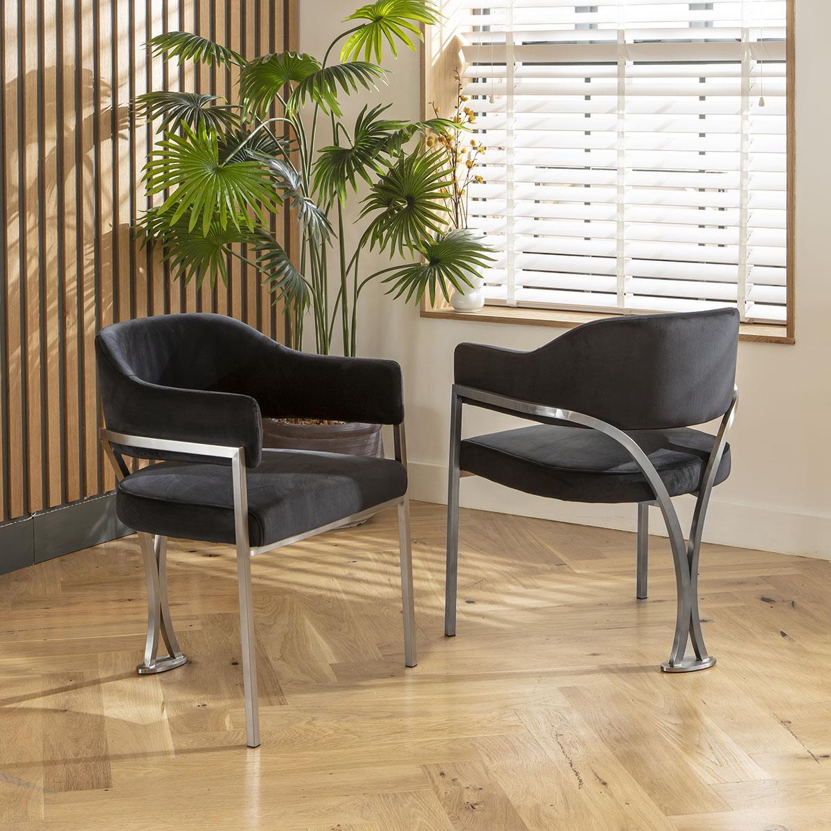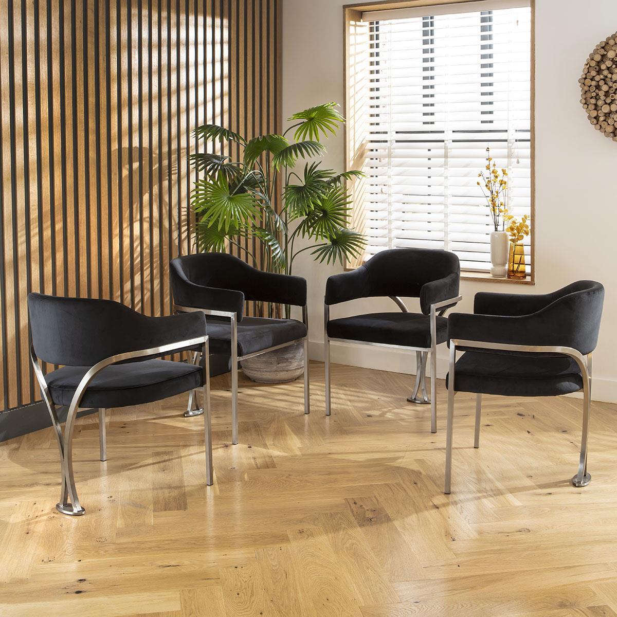 Enhance your dining space with our luxury dining chairs with arms. This set of 4 carver chairs feature a curved, wrap-around backrest and a modern shape, providing both comfort and elegance. The black velvet upholstery and high-quality brushed silver metal frame make them a standout piece in any dining room or kitchen. Experience the perfect blend of style and durability with our Diana dining room chairs. The elegant design of these black dining chairs adds a regal touch to your home. The modern dining chairs feature a high-quality metal frame that wraps around the back, offering robust support and a sleek, brushed silver finish. Indulge in the luxurious comfort of velvet dining chairs. The padded seat uses premium cushioning to ensure maximum comfort during meals. Upholstered in sumptuous black velvet, these kitchen chairs provide a touch of sophistication and opulence, making them ideal for any luxury dining setting. Our velvet chairs are built to last, featuring a sturdy metal frame and legs. The wrap-around design not only adds to the aesthetic appeal but also enhances the stability and strength of the chair. The brushed silver finish complements the black velvet, creating a chic and contemporary look for your dining room chairs. W63cm D57cm H79cm Seat Height 49cm Set of 4 Luxury Black Velvet Dining Room Chair