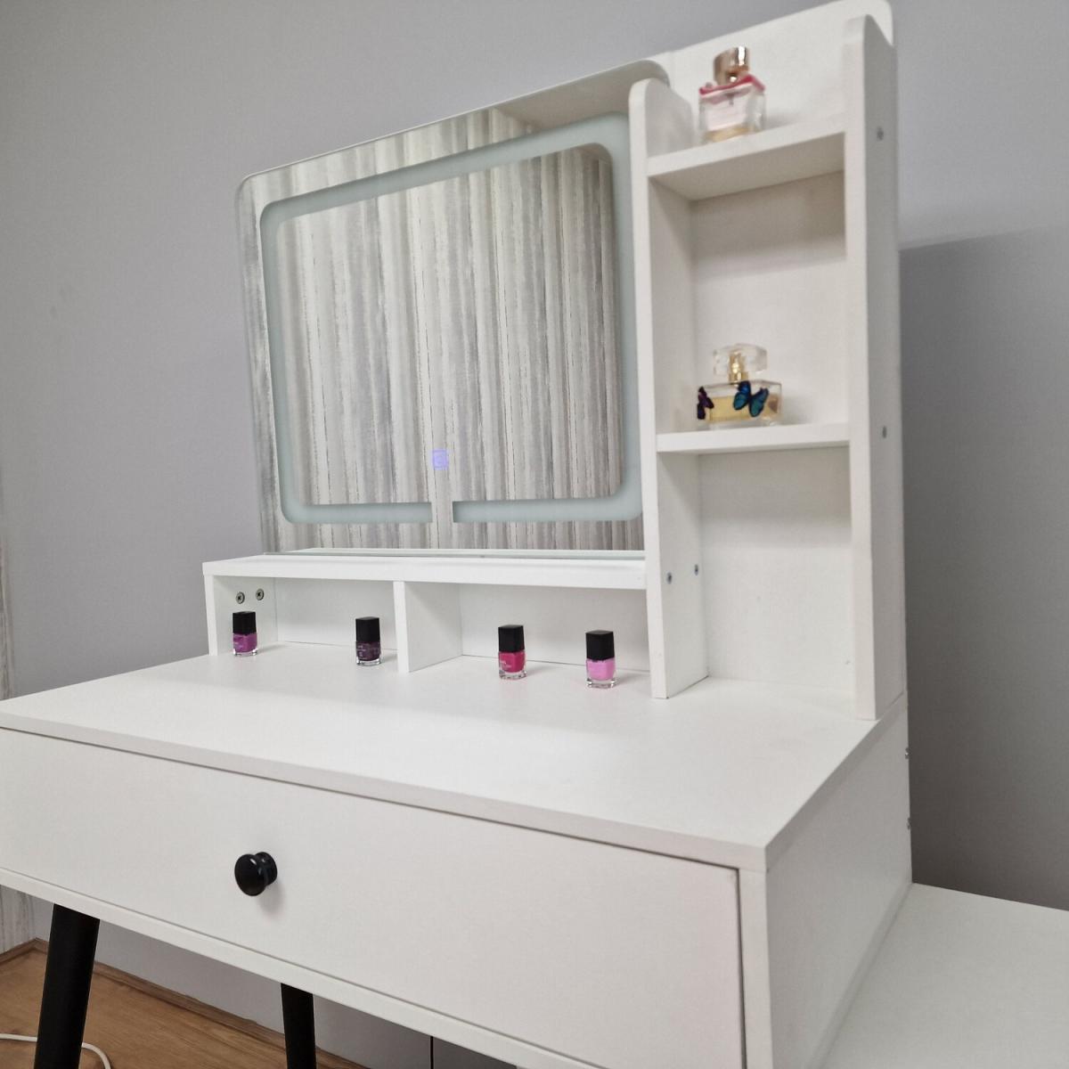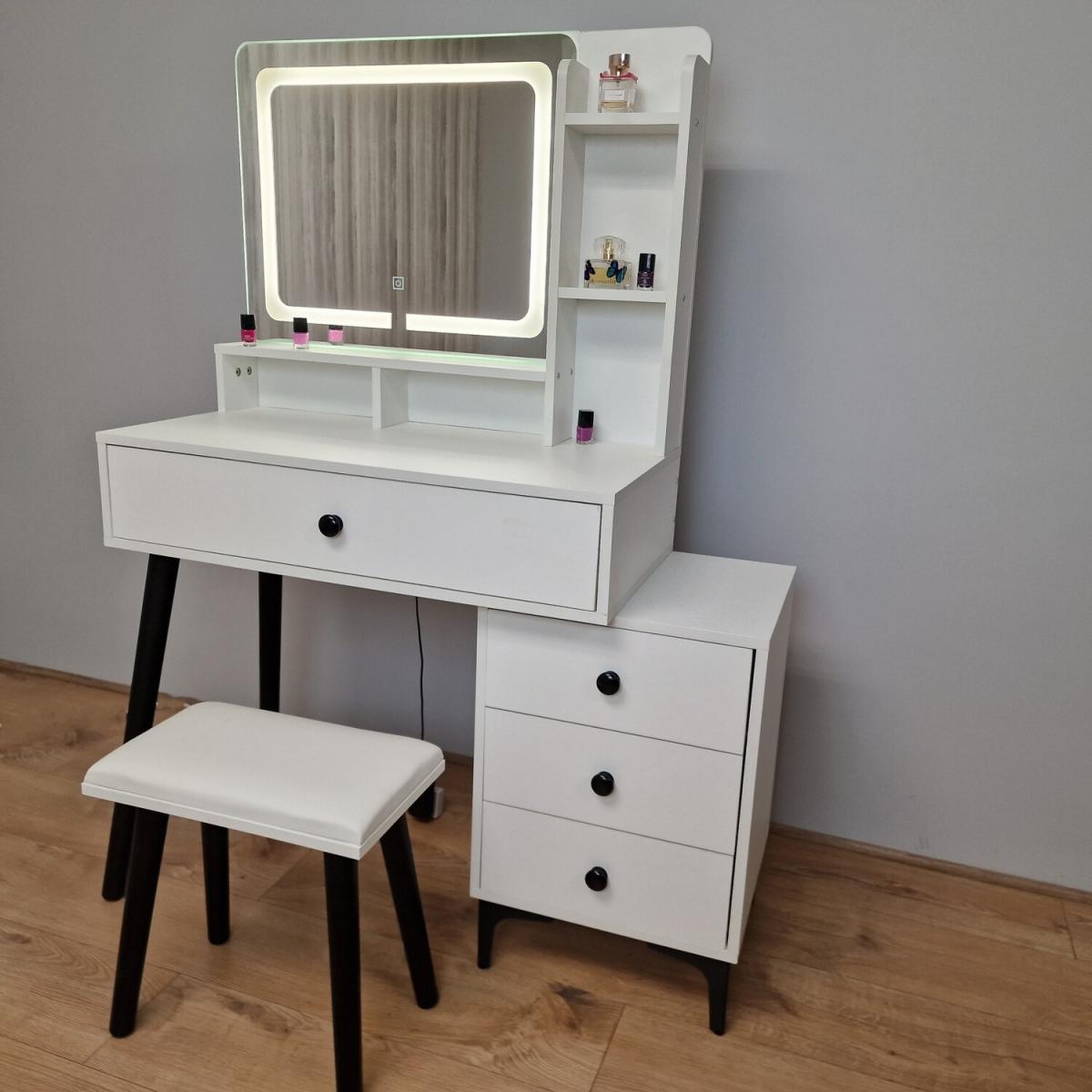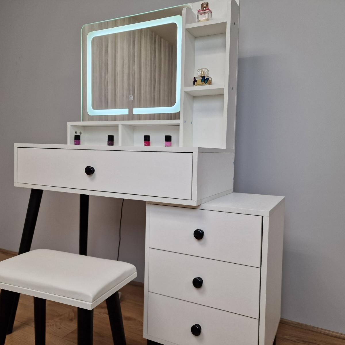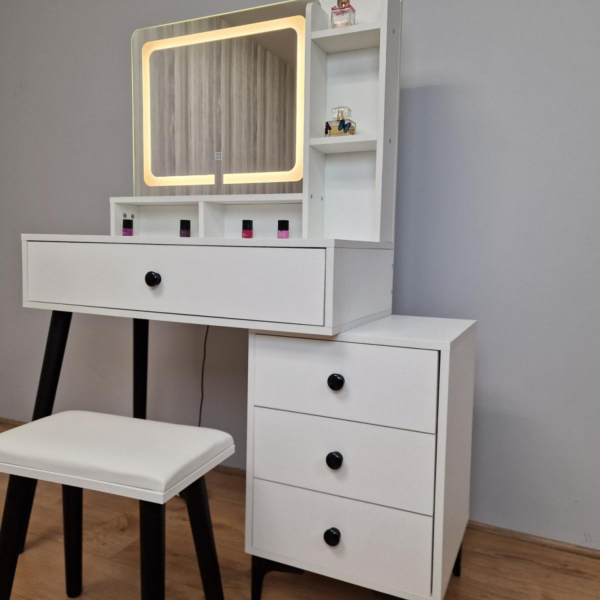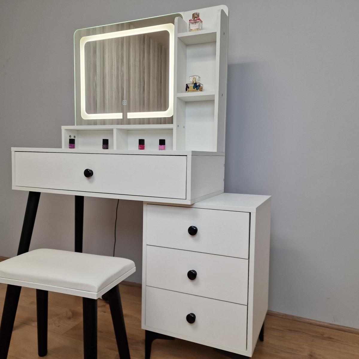Introducing our White Modern Dressing Table a sleek and functional addition to your bedroom. Crafted from high-quality Medium Density Fibreboard (MDF), this dressing table boasts durability with a contemporary white finish. Designed for organization, it features one large drawer and three medium-sized drawers, offering ample storage for your cosmetics, jewellery, and accessories. Keep your beauty space clutter-free. Included with the table is a comfortable matching stool, perfectly sized at L 40 cm, W 23 cm, and H 40 cm for your convenience. The standout feature of this dressing table is its generously sized mirror, measuring 60 cm in width and 49 cm in height. It also comes with integrated LED lighting, allowing you to choose between White, Yellow, and Light Blue lighting options. Adjust the lighting with a simple touch button located at the centre bottom of the mirror, With dimensions of L 100 cm, W 40 cm, and H 139 cm, it fits well in smaller spaces without sacrificing functionality. Our White Modern Dressing Table is a practical addition to your daily routine, enhancing your grooming and styling experience while adding a touch of elegance to your bedroom decor.