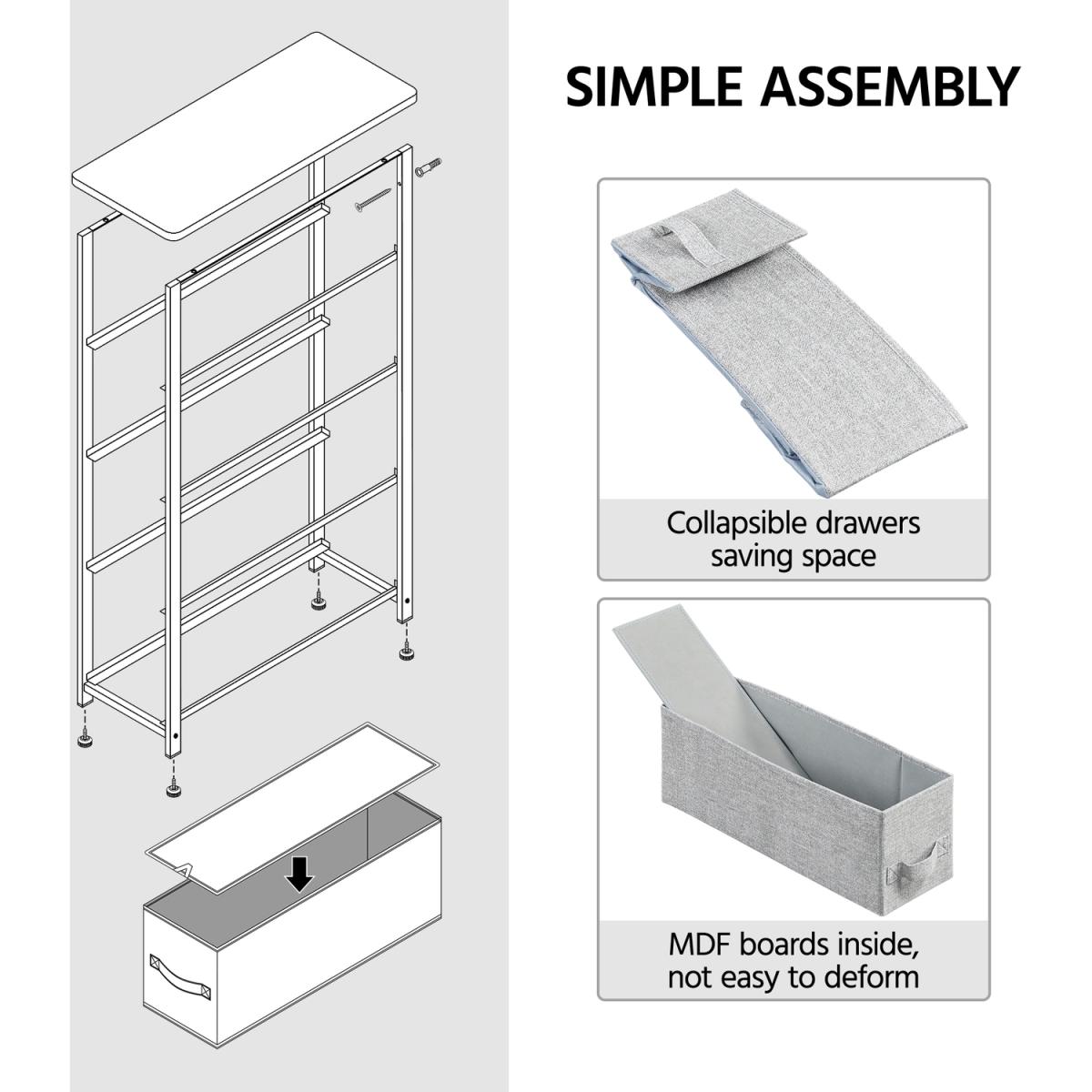 A narrow space could be a perfect storage space with this slim storage tower. The organizer is crafted of premium iron, durable non-woven fabric, and solid MDF boards for your long-term use. The narrow storage tower with 4 drawers could hold a lot of stuff and only takes up a small amount of floor space. The grey look is quite stylish, which is suitable for the bathroom, living room, hallway, kitchen, office, and other small space.