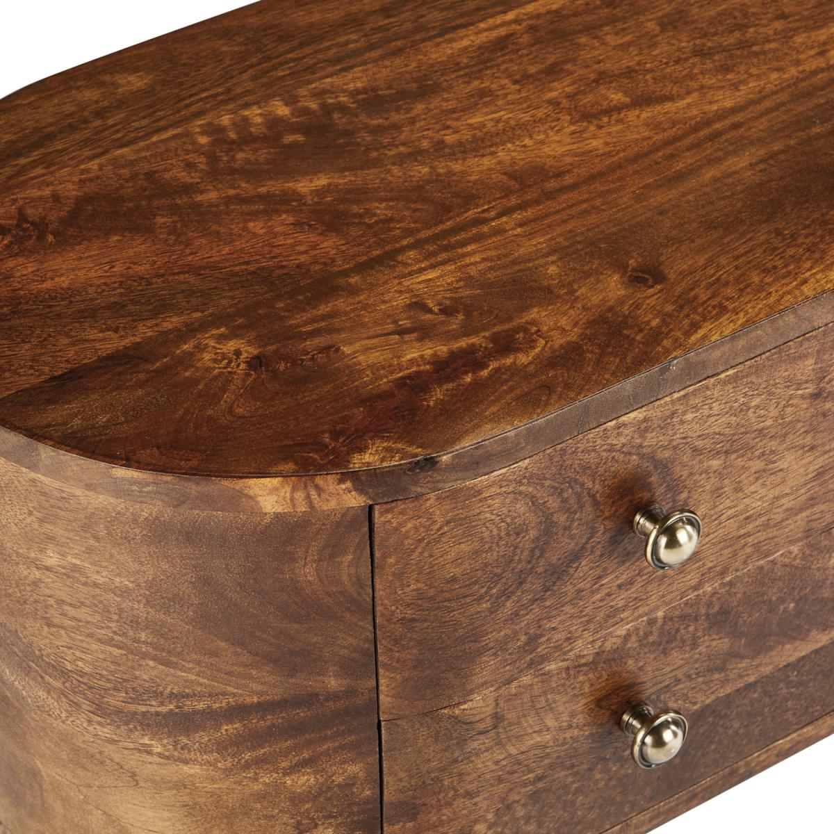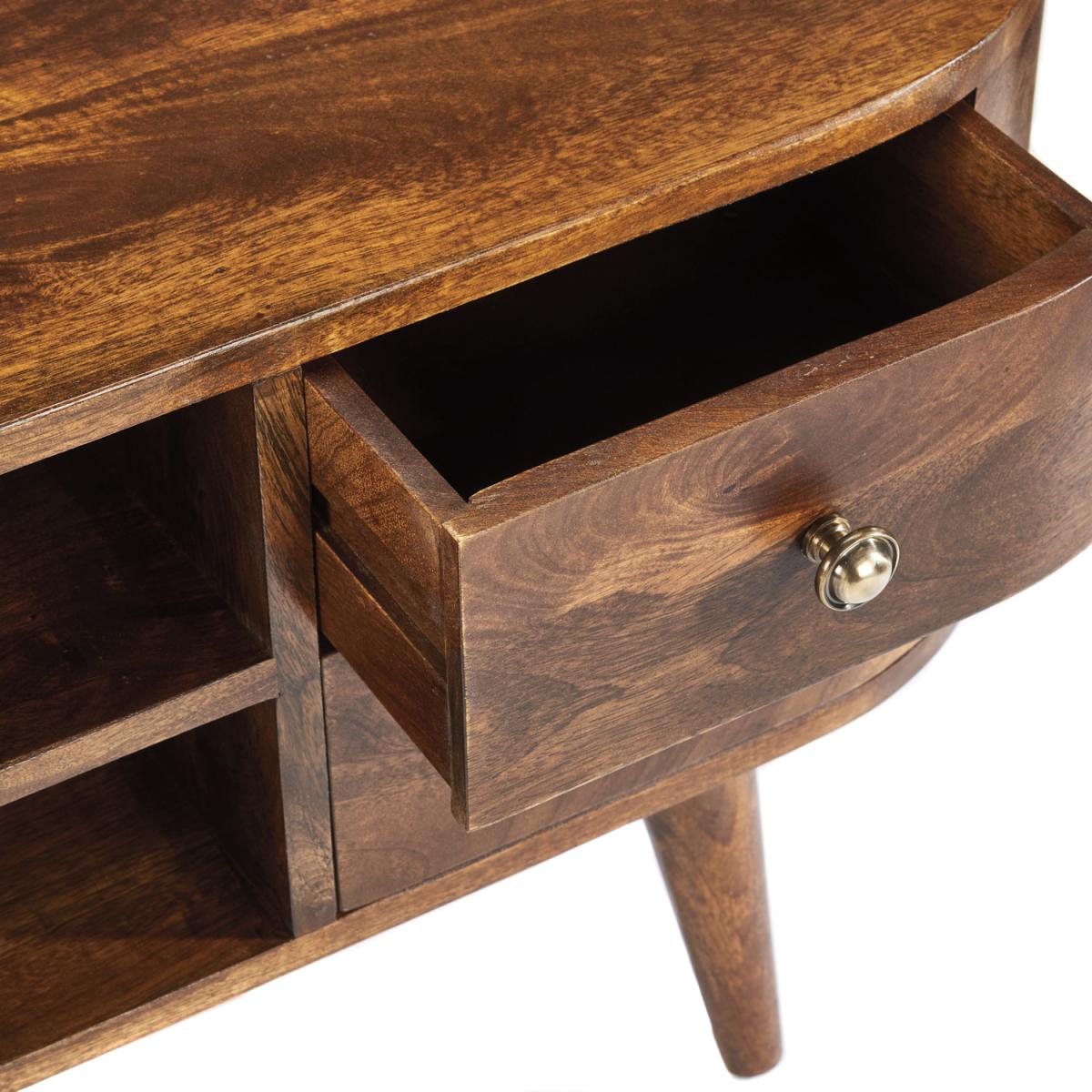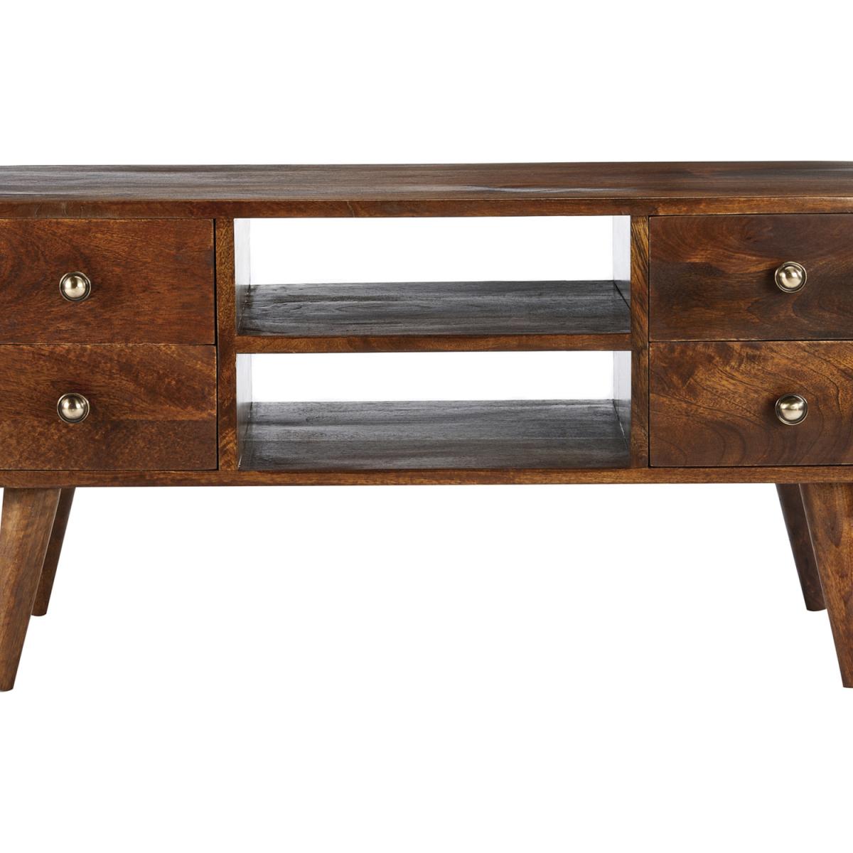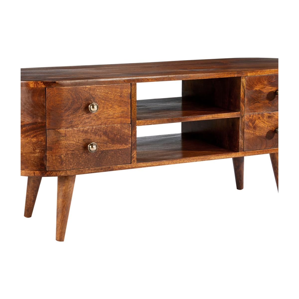 This mid-century style 4 drawer TV unit is made from 100% solid Mango wood (no veneer) and finished in a dark stain and wax with a clear lacquer topcoat. With its rounded sides and hairpin legs the style lends itself to any modern or traditional home. This item will be delivered part assembled with only the legs to attach and it is ready to use.