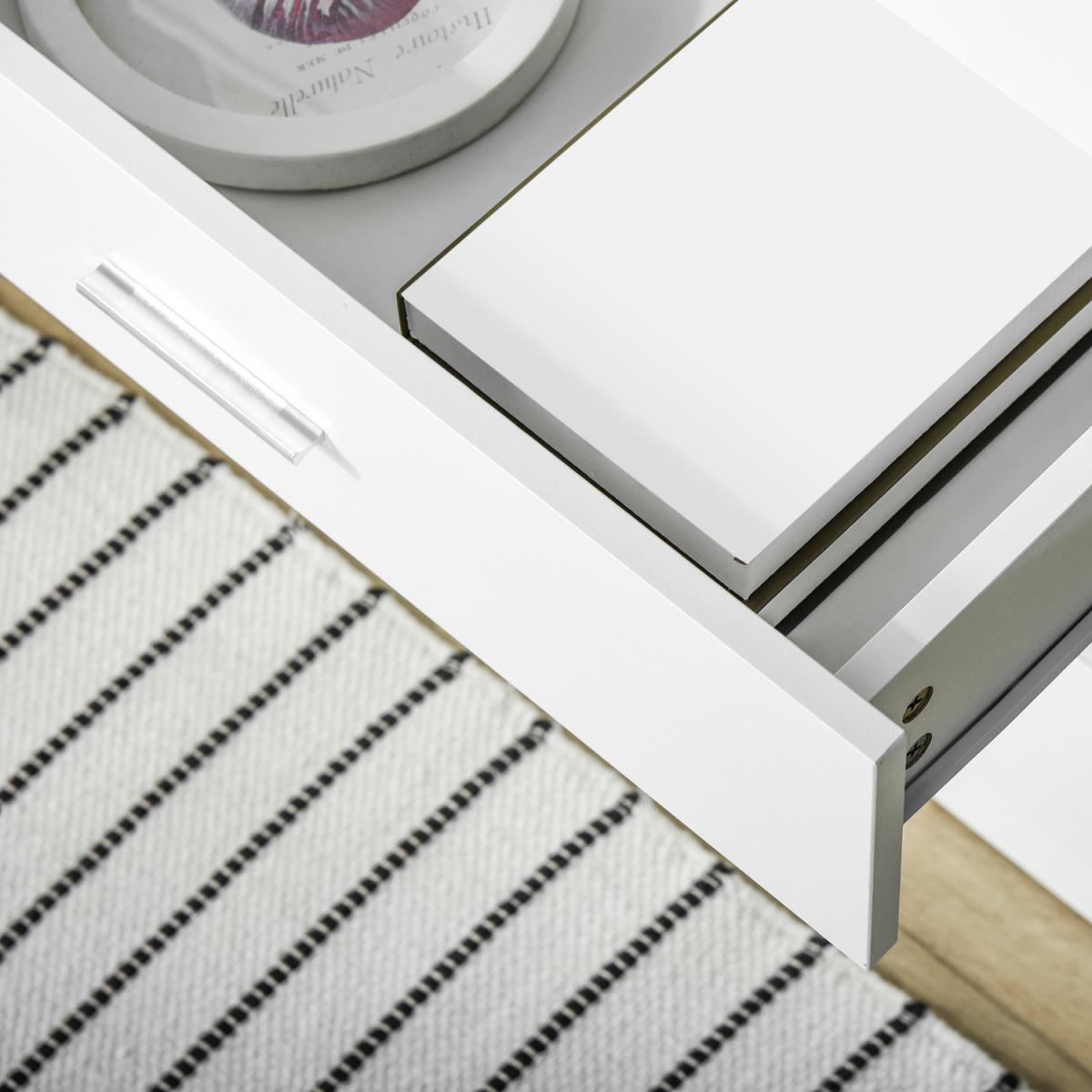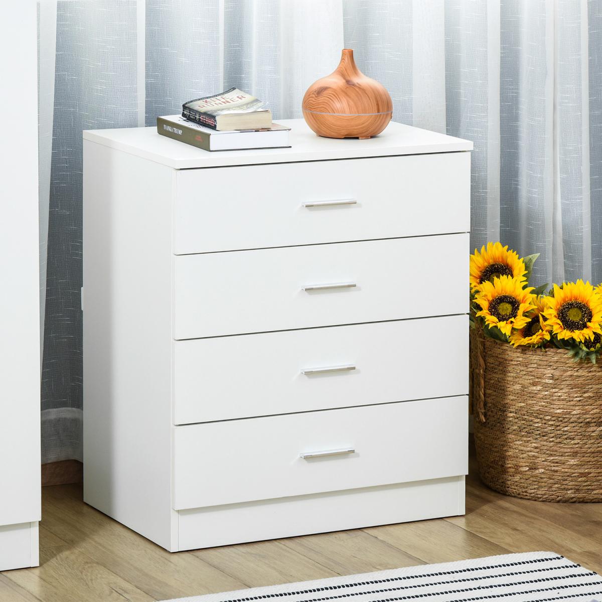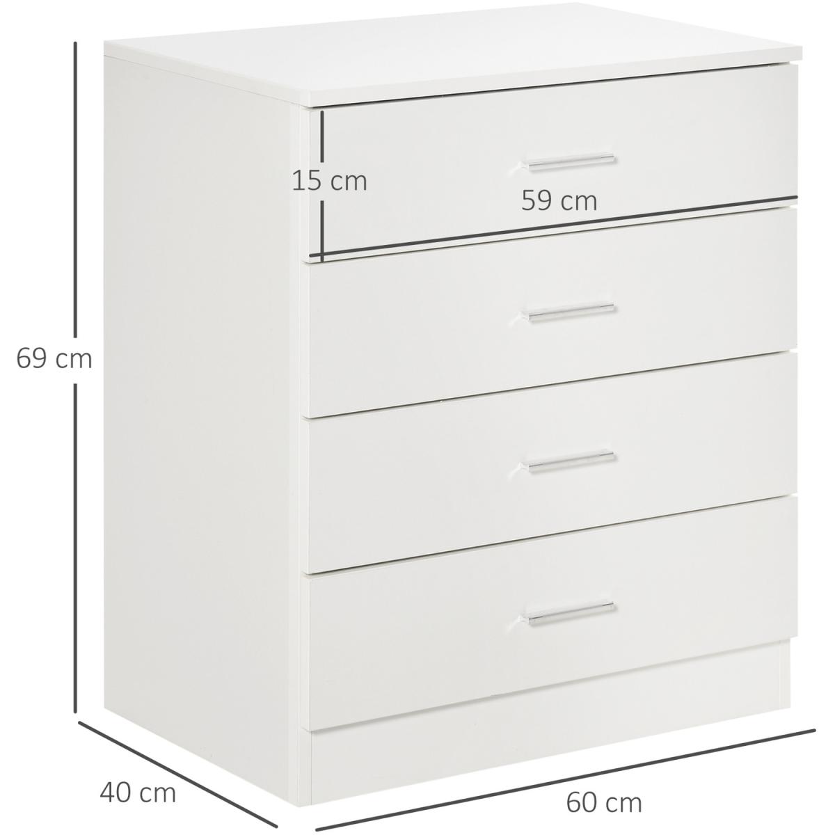 Simplicity is sophistication with this drawer chest from HOMCOM. A clean white colour, paired with the classic boxy shape and touch of silver-tone - thanks to the aluminium handles - means it's welcome absolutely anywhere you want it to be. Formed of four drawers: plenty of space to keep home tidy, such as clothes, books and more. Metal gliding rail inside each drawer for smooth opening and closing. Finished with a slightly thick base for elevation and steadiness.