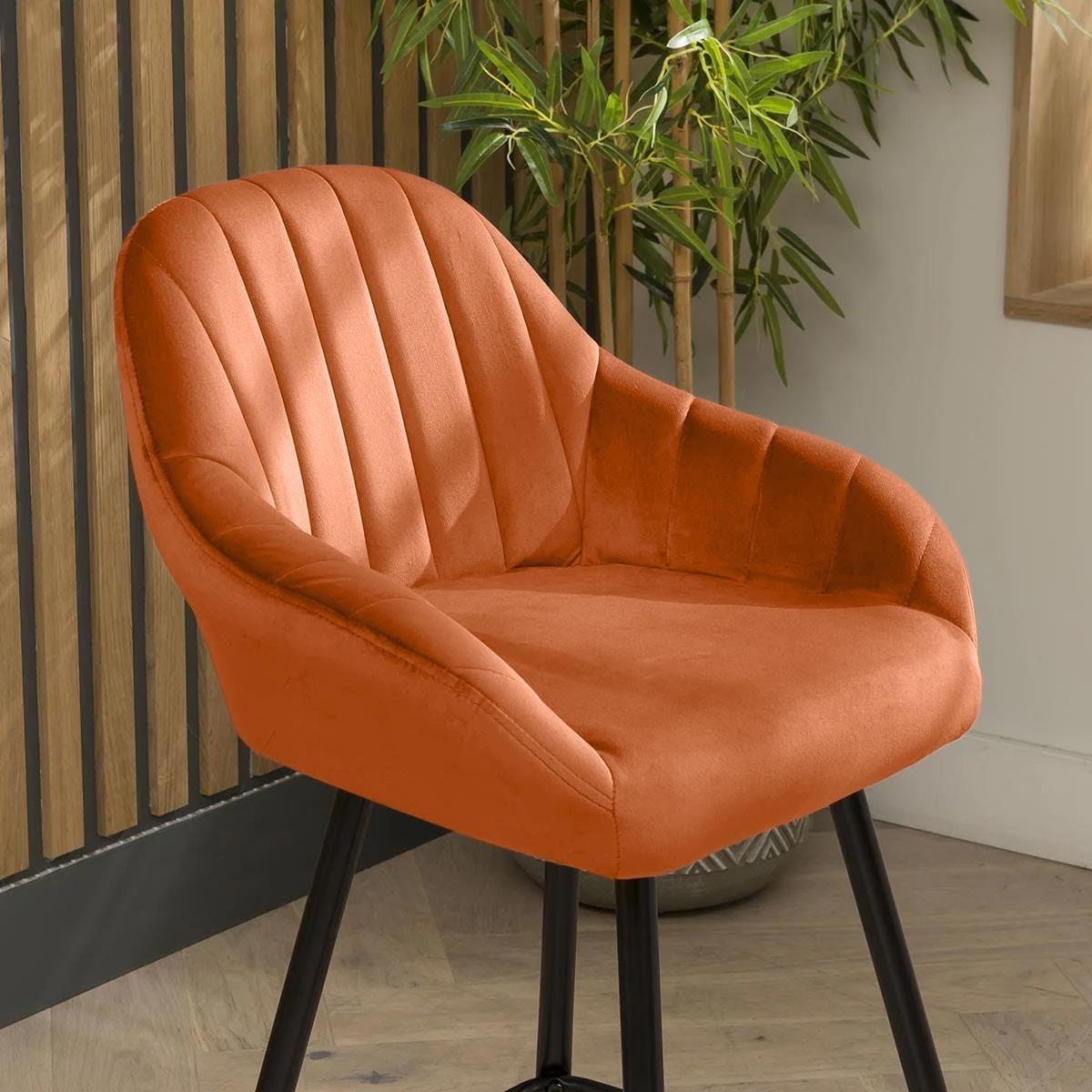 Elevate your home bar or kitchen island with this set of 4 Harper Orange Velvet Bar Stools with Backs and Quilted Line Detailing. The modern bar stools are crafted with attention to detail, the stools feature a luxurious orange velvet upholstery on the seat and backrest with sleek black metal legs and footrest. The Quilted Line Detailing on the seat not only adds a touch of elegance but also provides extra cushioning for unparalleled comfort during long gatherings or quick meals. The wrap-around style low arms offer a sense of security while you relax, making this bar stool perfect for leisurely chats with friends or enjoying a morning cup of coffee. Designed for durability and aesthetic appeal, the black metal legs offer a modern contrast to the plush velvet upholstery. The smooth finish on the legs not only complements the overall design but also ensures stability and support. The integrated footrest adds an extra layer of comfort, allowing you to fully unwind without any compromise. Upgrade your space with this set of Orange Velvet Bar Stools with backrests, Quilted Line Detailing, and sleek black metal legs. Whether you're entertaining guests or enjoying your daily meals, this bar stool provides the perfect blend of style, comfort, and functionality. W53cm D49cm H92cm Seat Height 66cm Set of 4 kitchen bar stools