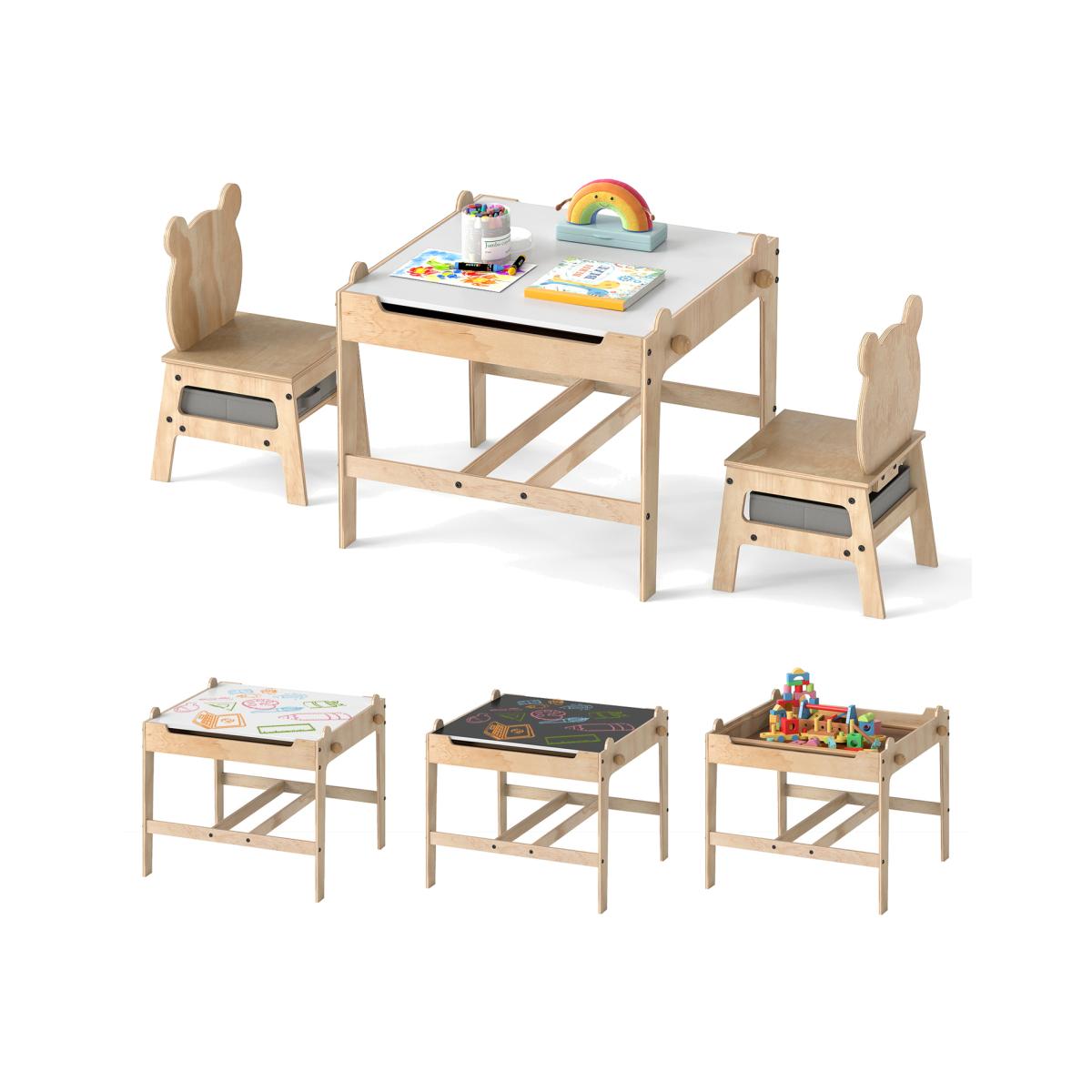 Introduce your kids to a world of creativity and fun with our versatile kids table & chairs set. The activity table features a reversible tabletop that allows kids to transition between a smooth whiteboard and a classic chalkboard surface. Beneath the table is a large hidden storage compartment for stashing toys, art supplies and books, keeping the play area tidy. Additionally, 2 removable and foldable fabric drawers offer extra space to store items. Adding further convenience, 2 solid wood sticks are positioned inside the desk - serving dual roles as paper roll holders and handy hooks. Crafted from solid wood composite board, this kids table and chair set is built to last. Moreover, the lovely panda/robot-shaped backrest adds a playful touch to any playroom or nursery.