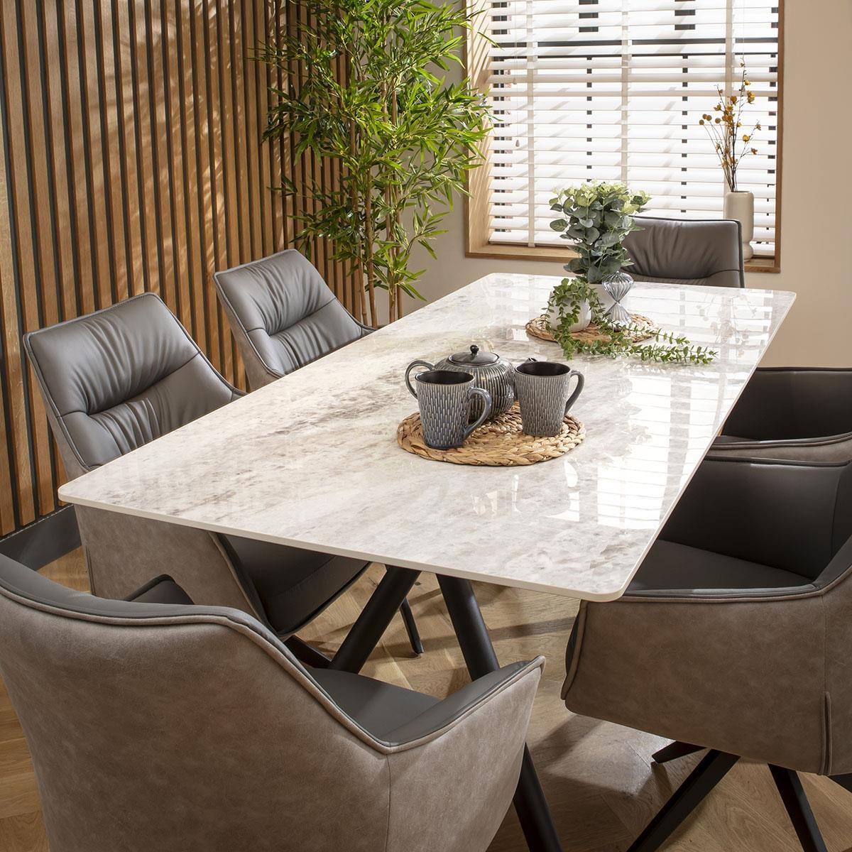 This set of 4 carver dining chairs with arms are a sophisticated addition for sleek dining spaces. The grey faux leather dining chairs feature a bold design and premium materials, including grey fabric outers and a rotating swivel base - making them a standout choice among modern swivel dining chairs. Crafted with a focus on premium build quality, the Millie carver dining chairs boast a modern silhouette complemented by a black powder-coated 4-point base. The chair features a 180-degree rotating seat with an auto-return function, ensuring the chair always returns to its original position. Excellent support and stability, combined with premium cushioning in the seat, ensures optimal comfort. This modern dining chair with arms features a luxurious combination of materials and colours. The inside seat part is covered in an elegant grey faux leather, which is not only stylish but also easy to clean. The outer chair is wrapped in a premium grey fabric, adding a touch of elegance to your dining room. Assembling your new dining room chair is straightforward and hassle-free. The chair's base needs to be attached to the seat part, a simple process that ensures the chair is secure and ready for use. With clear instructions and minimal tools required, you'll have your new swivel kitchen chairs ready in no time, enhancing your dining experience with both style and functionality. W85cm D61cm H64cm Seat Height 49cm Set of 4 Dining Chairs with Faux Leather Seat & Swivel Base