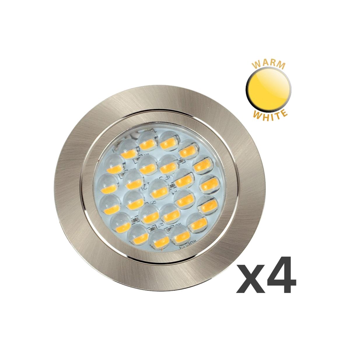 Pack of 4 modern LED caravan boat downlights in a brushed chrome finish. These sleek and stylish lights feature 24 SMD LED chips and give off a warm white light (2700. K). They are supplied with 300mm of fixed cable and 3m of extension cable. Suitable for use with 12V circuits. Please note these lights must NOT be connect to 240V supply.