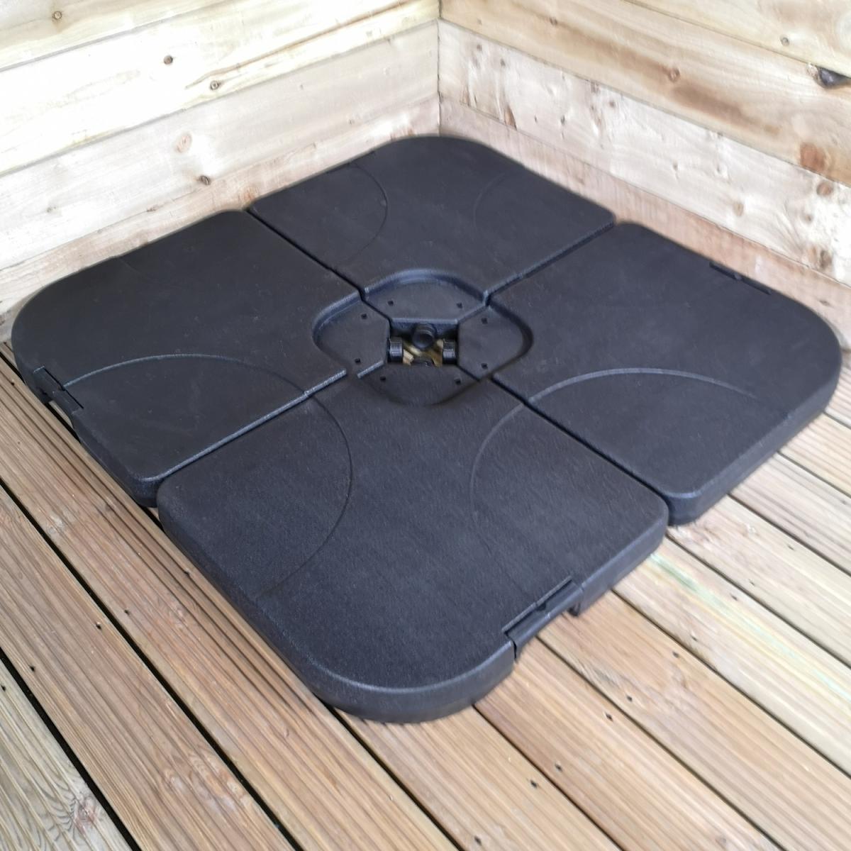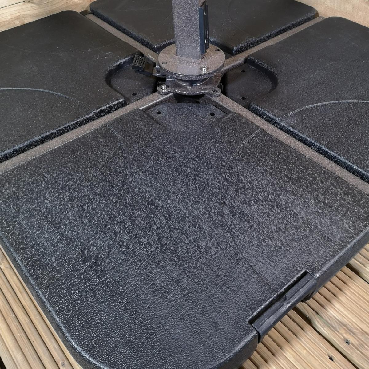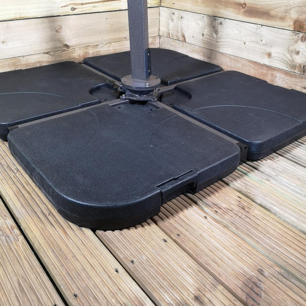 This set of weighted bases comes in four separate segments which seamlessly slot into your cantilever parasol to ensure it stays strong and sturdy all summer long and can be easily filled with either sand or water to ensure your parasol does not move. Features an all-black finish with a half-circle design with an easy-to-carry handle on each quadrant with screw caps. The outer plastic shell will not rust but must be filled with sand or water to offer stability.