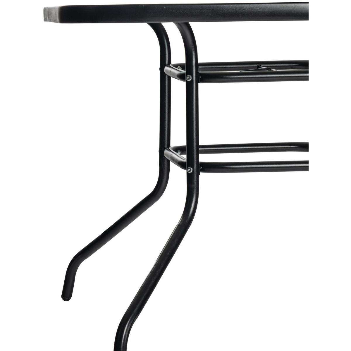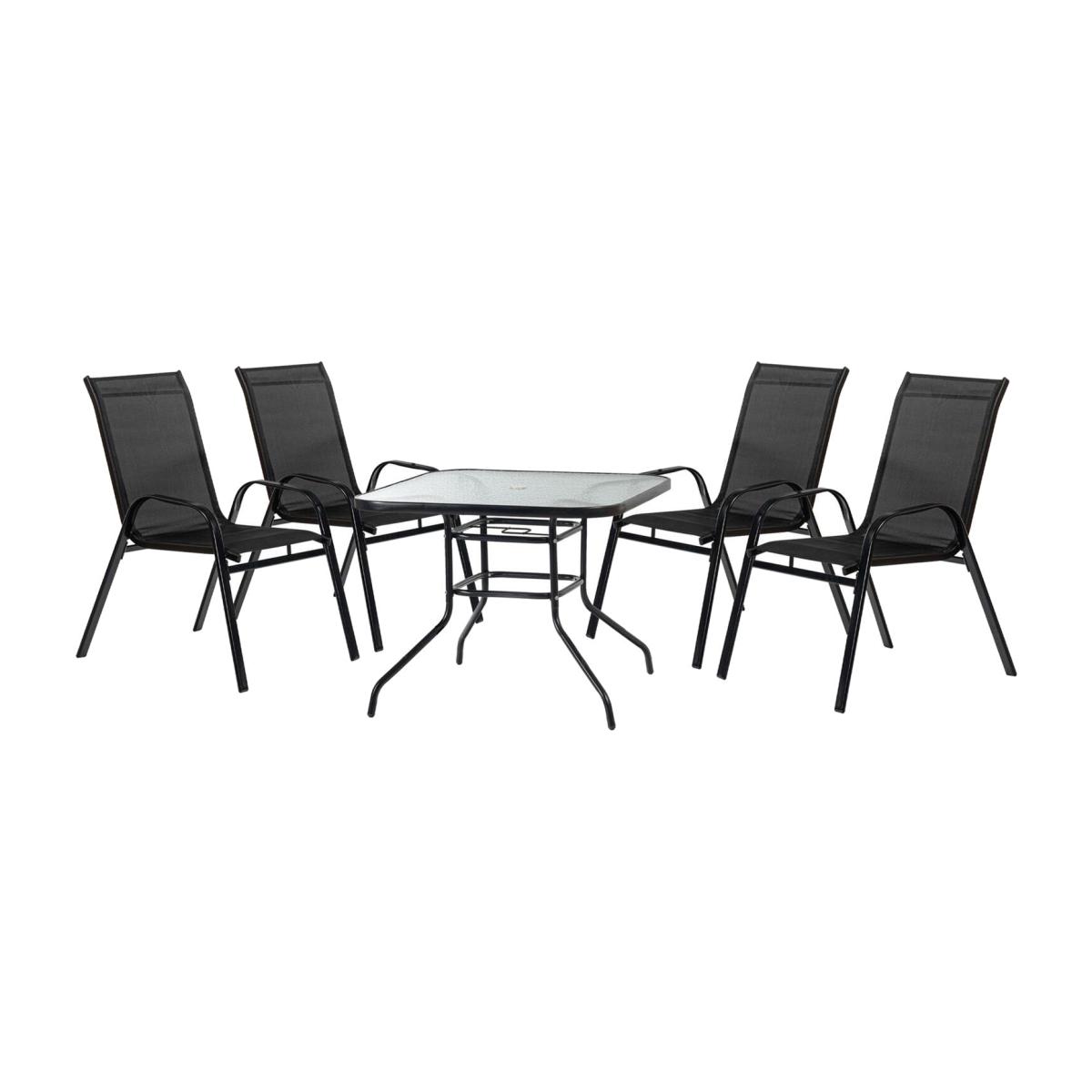 This Harbour Housewares Garden Furniture Set lets you transform your garden, patio or balcony into your very own trendy inner-city coffee bar or bistro, with a sleek, contemporary design built for basking in style beneath the Great British Summer sun!The powder-coated metal framework of this 5-piece combination offers season-long strength, support and stability while keeping everything light enough to move and manoeuvre with the minimum of fuss. Each chair comes fitted with a reinforced texteline bed that keeps you sitting comfortably without the need for additional cushions or support. The stylistic centrepiece of this set, however, is undoubtedly the table topped with tempered, textured glass that dances in the light to cast intricate reflections on the floor below. The use of glass also helps the surrounding area feel larger by keeping the maximum amount of floorspace visible - perfect for balconies or smaller patios!As a final piece de resistance, we've fitted each table with a parasol hole that allows you to quickly adjust and adapt to whatever surprises the British weather might spring!