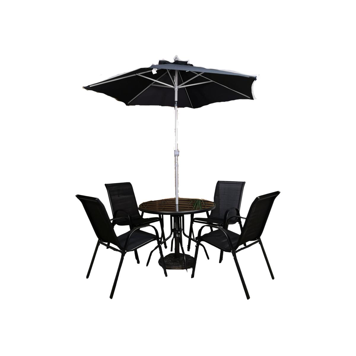 Relax and enjoy your leisure time this summer with this attractive glass top outdoor dining table and 4 chairs set with black parasol and base. This stunning set will become the focal point to your garden, terrace or patio area making it ideal for dining on or just enjoying drinks in the summer sun and has space for up to 4 seats. Having an outdoor patio furniture set can greatly enhance your outdoor living space and creates a comfortable and inviting space for you to relax, entertain, and enjoy nature. The set includes a black, round tempered glass top table with 4 chairs, black parasol and parasol base. Having a black steel set will blend seamlessly with its surroundings. It adds sophistication and a sleek, modern touch to your patio or garden. The frame of the table and chairs are made from steel and have been finished with a powder coating for added strength and durability. The chairs have a textilene backing and they can easily be stacked on top of each other when not in use for easy and convenient storage. With a black parasol and base included you can shield yourself from the sun. The umbrella parasol is designed to provide ample coverage allowing you to stay cool, comfortable and protected in your outdoor space. This garden parasol offers a sleek and modern design with it's Black canopy and Grey aluminium poles which will add that touch of sophistication to any outdoor setting. Wind the plastic crank handle to open and close the umbrella and the tilt function is activated by the press of a button. The cast iron effect parasol base has been made with strong resin materials that make a great addition to any garden decor. Choose the correct spacers and adjust the tightening knob for a secure fit for the parasol. The set is supplied flat packed and self assembly is required.