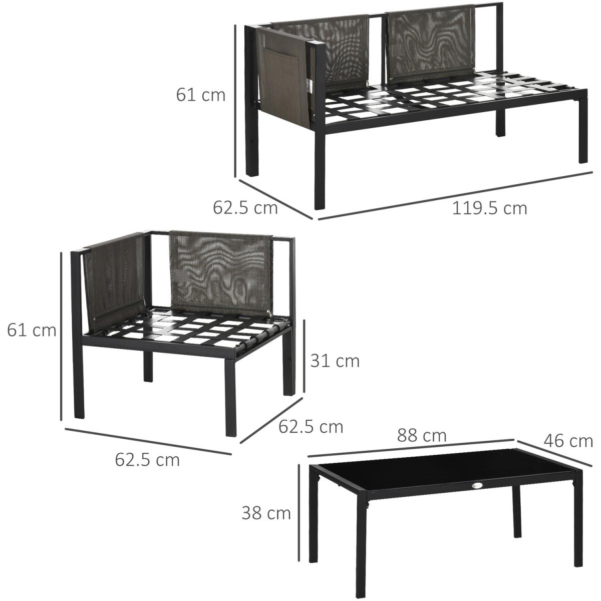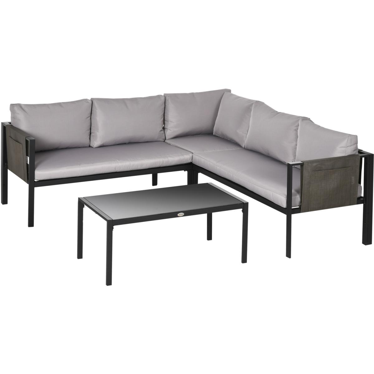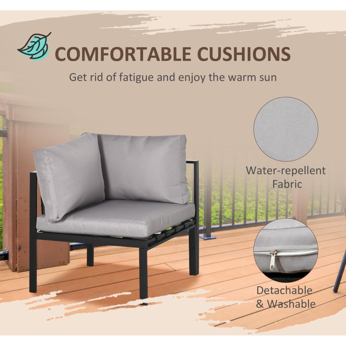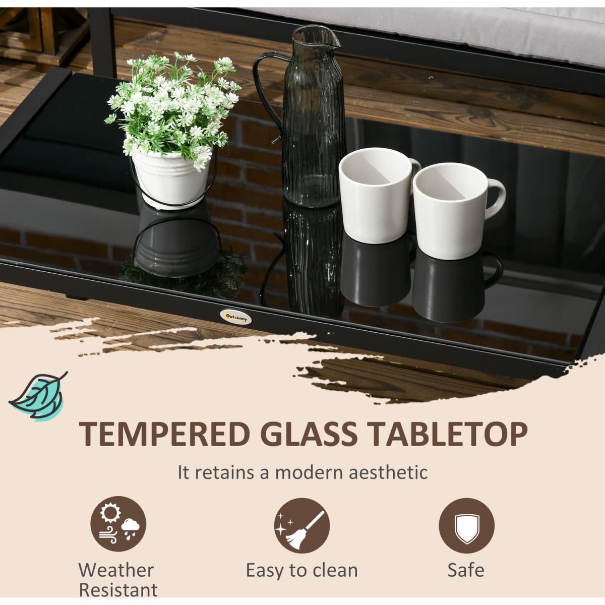 Gather round and relax in simplicity with this Outsunny set. Comes with four pieces - two loveseats, one corner seat and a dining table. Steel frames mean a strong, supportive structure. Thick padded seat and back cushions for comfort. Tempered glass table top for a beautiful finish.