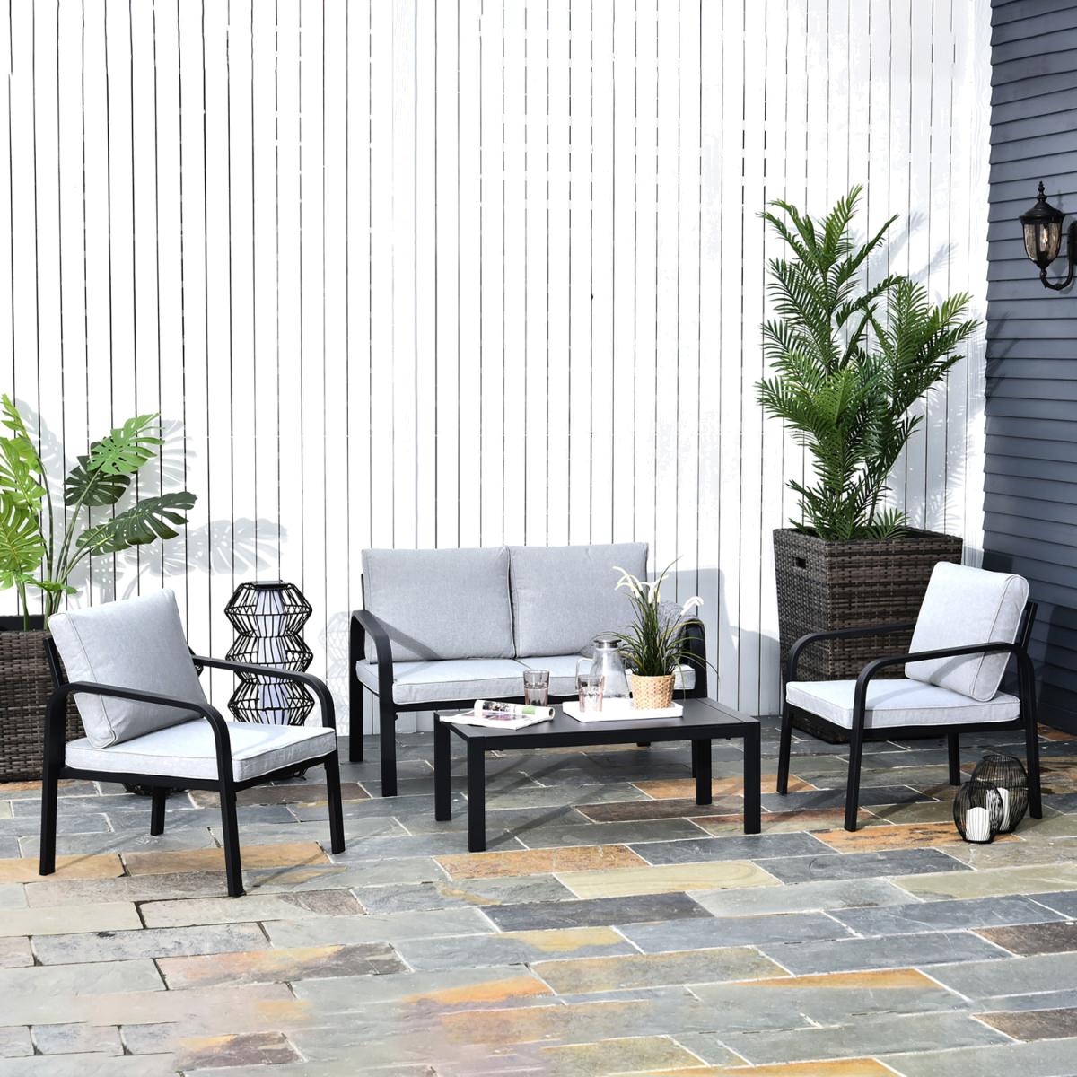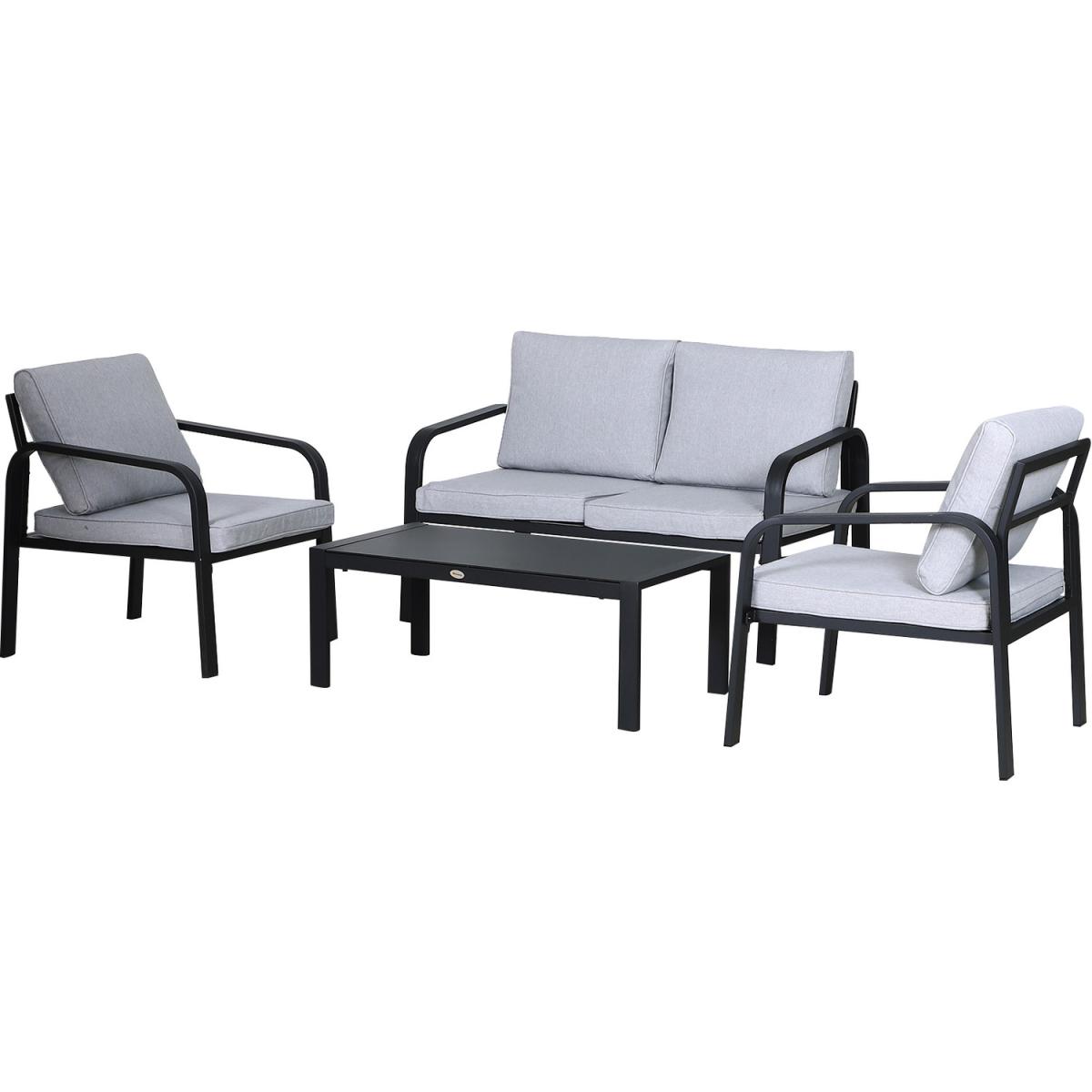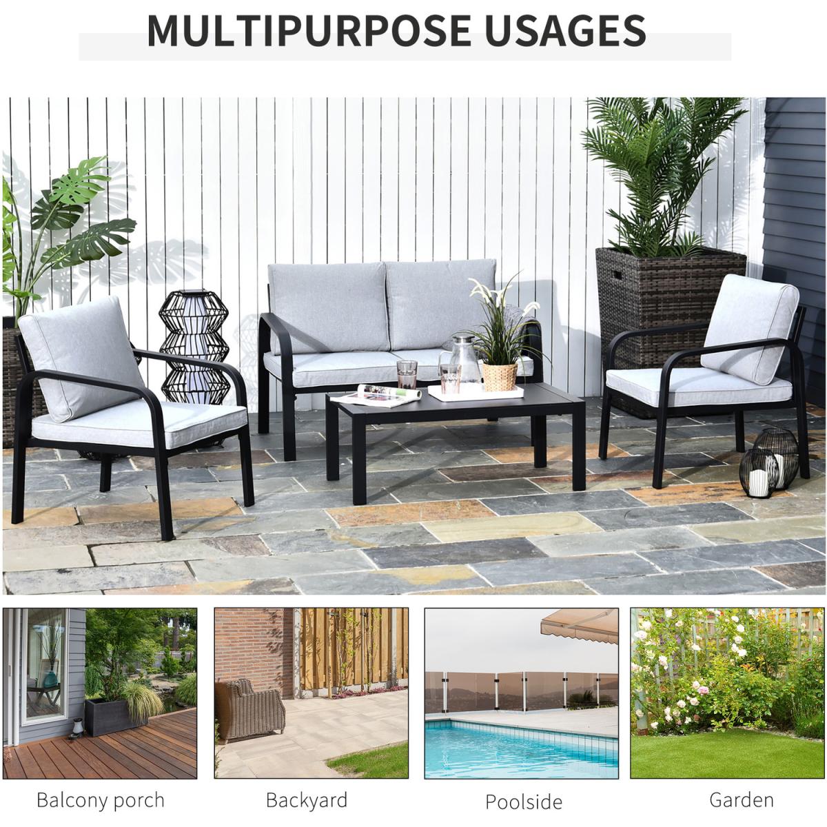 Let friends and family gather round in simple yet sleek style outdoors, thanks to this four-piece dining set from Outsunny. Fusing smooth curved lines in a bright white and grey colour scheme, it creates a contemporary look that will instantly liven up your garden and outdoor areas. The set consists of four pieces - two armchairs, a two-seater sofa and a dining table, with aluminium forming the frames for a tough and durable structure for longevity, with thick padded cushions on the seats and backs for enduring comfort as you relax. Tempered glass on the long table adds a beautiful finish, with protective pads on each foot for balance. Outdoor entertaining has never looked so beautiful.