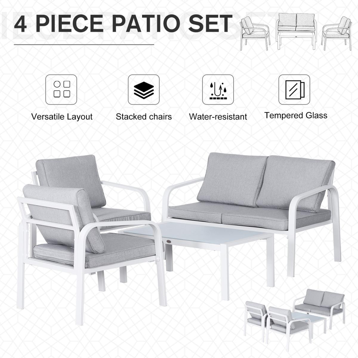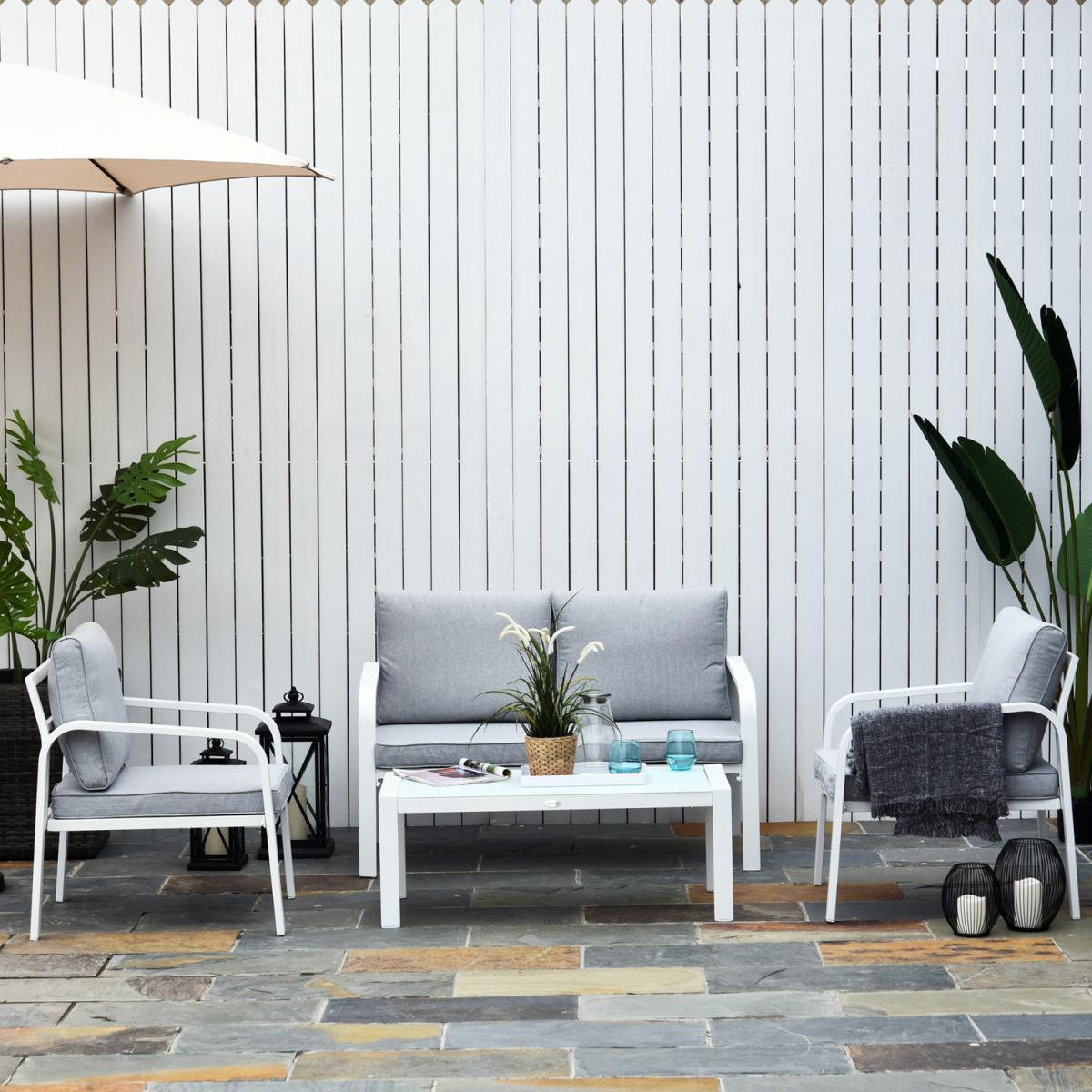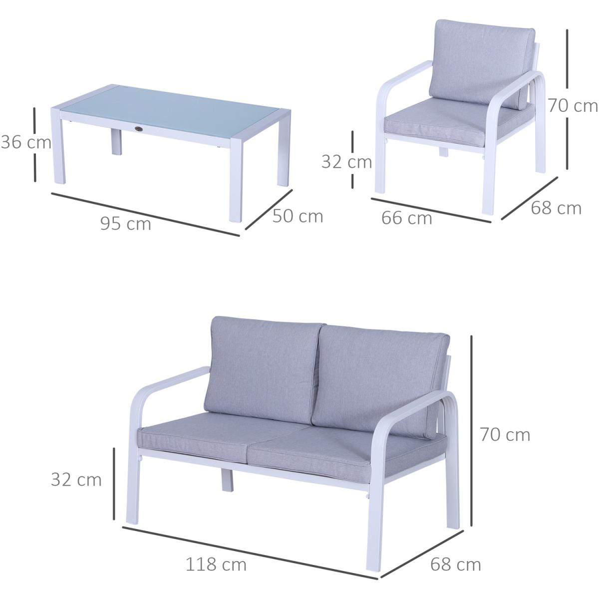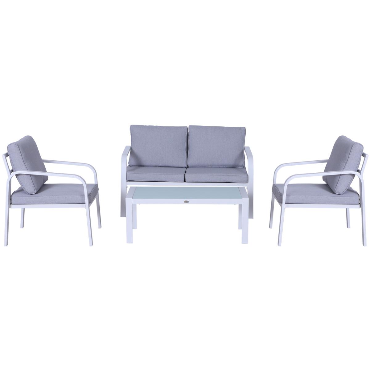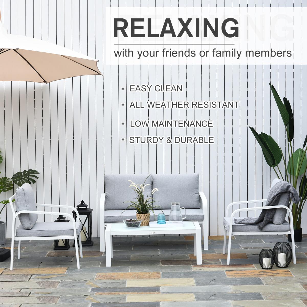 Let friends and family gather round in simple yet sleek style outdoors, thanks to this four-piece dining set from Outsunny. Fusing smooth curved lines in a bright white and grey colour scheme, it creates a contemporary look that will instantly liven up your garden and outdoor areas. The set consists of four pieces - two armchairs, a two-seater sofa and a dining table, with aluminium forming the frames for a tough and durable structure for longevity, with thick padded cushions on the seats and backs for enduring comfort as you relax. Tempered glass on the long table adds a beautiful finish, with protective pads on each foot for balance. Outdoor entertaining has never looked so beautiful.