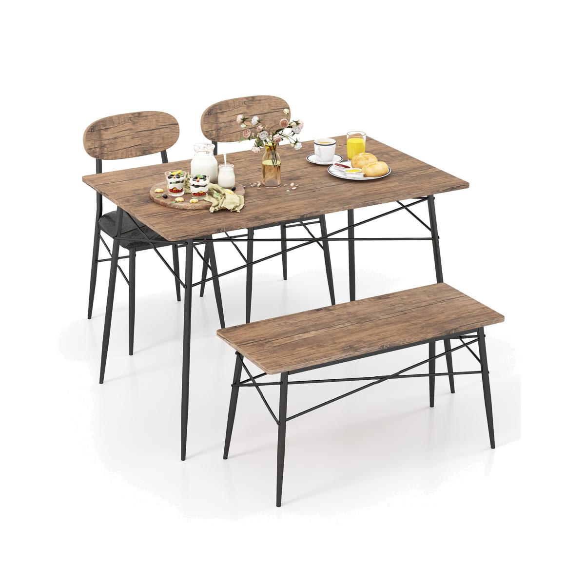 Upgrade your dining experience with our 4 piece dining table set today! The versatile dining table set consists of a dining table, bench, and 2 chairs, providing ample space for everyone to sit and enjoy their meals. And the wide tabletop enables you to engage in other activities. Meanwhile, the veneered MDF surface is also easy to clean. To better adapt to small spaces, the chairs and bench can be stowed under the table when not in use.