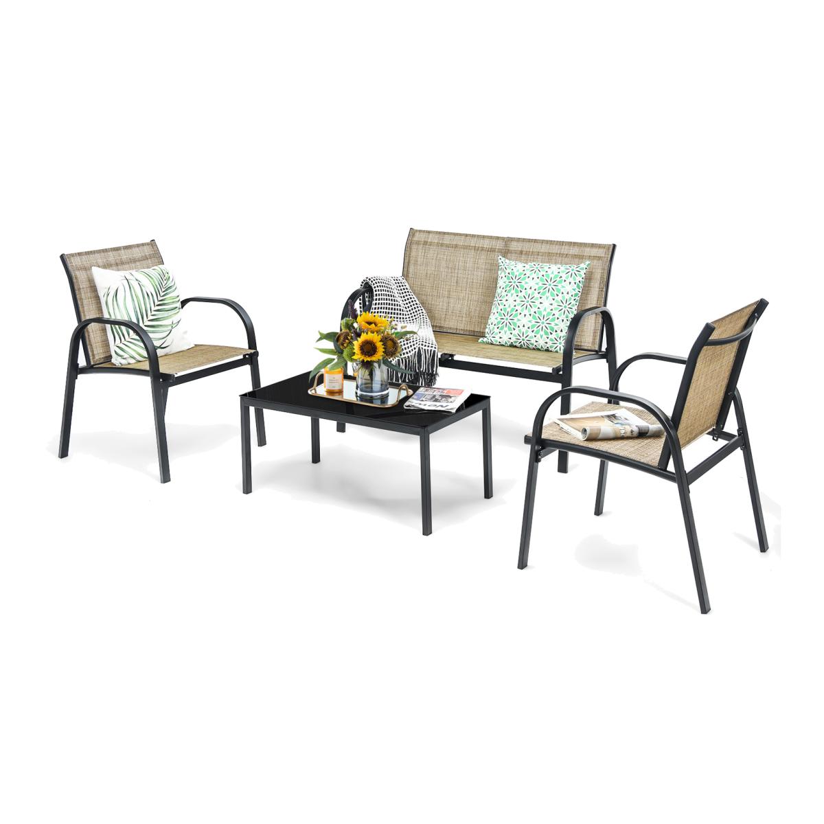 Our 4-piece patio furniture set includes a loveseat, 2 chairs, and a coffee table, which can accommodate up to 4 persons to eat or chat, creating a comfortable outdoor area for outdoor relaxation. The seat and back are made of breathable and weather-resistant mesh fabric, providing better ventilation and allowing for long-term outdoor use. And the supporting frame is made of rustproof powder-coated steel, which can effectively reduce the erosion of the frame by rain. 4-Piece Patio Furniture Set with Loveseat - Brown