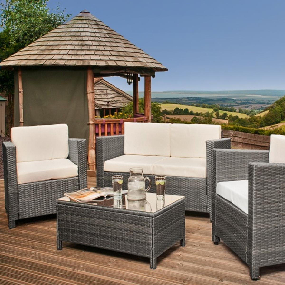 Featuring a contemporary design with comfortable cushioned seating, this rattan set makes a great addition to your patio, garden, or conservatory for entertaining guests or enjoying your morning breakfast in comfort. This set includes a wonderfully cushioned sofa and two armchairs with wide armrests with gently curving backrests for comfortable support and a low coffee table with a tempered glass top with interwoven frame finish. Made from high-quality poly-rattan material that is UV resistant to prevent colour fading and woven over a sturdy metal frame to provide durability over the years and requires no maintenance. The dining table features a scratch-resistant tempered glass top for safety and resilience.