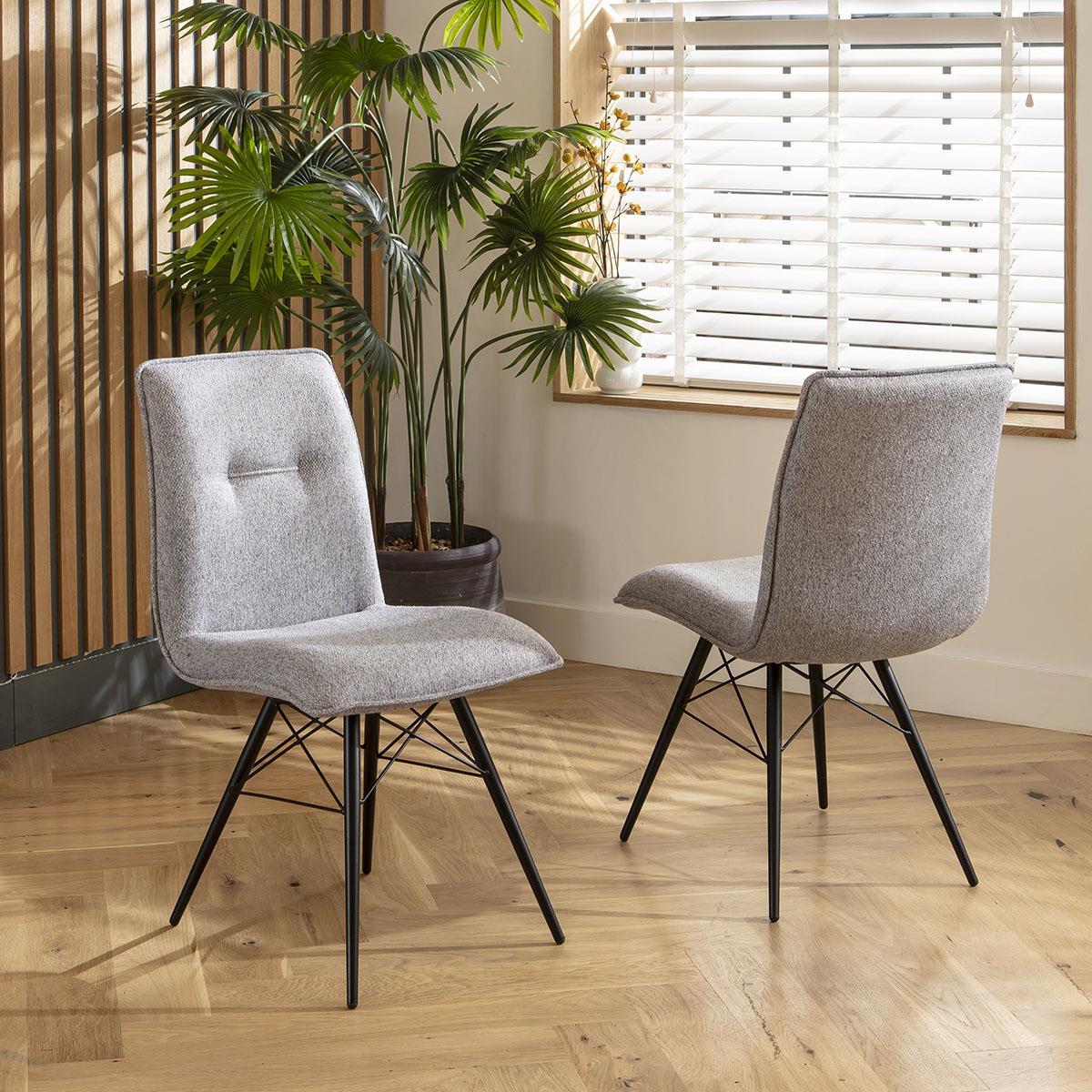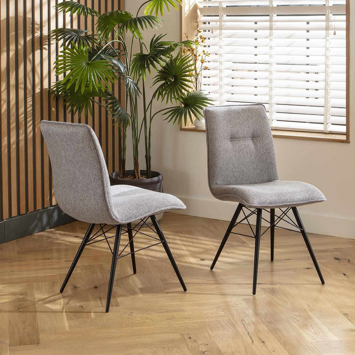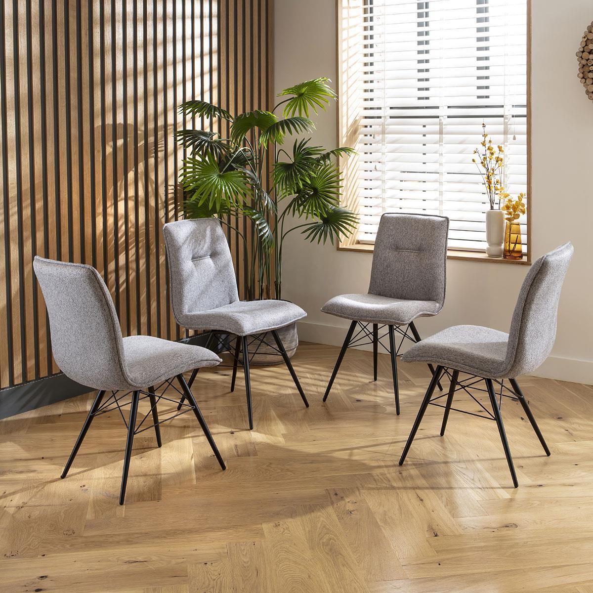 Elevate your dining experience with our premium grey dining chairs. Featuring a slim design and durable grey fabric, these modern dining chairs are perfect for any dining room or kitchen. With stylish stitched details, thick padding, and black powder-coated metal legs complete your space these fabric dining chairs. The Sally modern dining chairs are designed with a slim profile to fit seamlessly in any dining space. The piping detail around the seat part adds a touch of sophistication, while the stylish stitched detail on the backrest enhances the overall aesthetic. These dining room chairs in grey are perfect for a contemporary kitchen table setup. Crafted with durable grey woven fabric, these fabric dining chairs ensure longevity and style. The thick padding provides exceptional comfort for prolonged seating. The premium build quality ensures that these modern kitchen table chairs remain a staple in your home for years to come. The black metal legs of our dining chairs are powder-coated for a sleek, modern finish that resists wear and tear. These sturdy legs offer excellent stability and complement the overall design of the chairs. Perfect for adding a modern touch to any dining room or kitchen setup, these grey dining chairs are both functional and stylish. W50cm D63cm H89cm Seat Height 48cm Set of 4 Dining Chairs