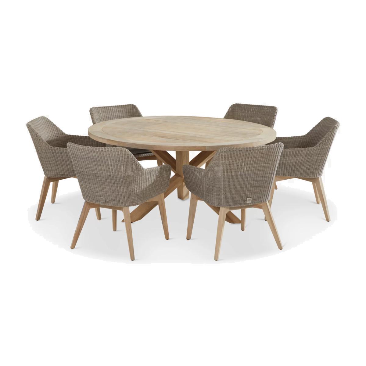 A contemporary dining set for up to six people, this Avila set includes six dining chairs and a round Louvre dining table, for the garden or conservatory. The rope-like design on the chairs is handwoven with 4 Seasons Outdoor's Hularo weave, made from synthetic wicker that's both UV-resistant and water-resistant. This type of wicker is easy to clean, durable and resistant to UV rays, salt water, lotions, chlorine and alcohol. The foam-filled seat cushions give you comfortable support and the covers are removable and machine washable for easy cleaning. The table top is made of weather-resistant FSC-certified teak wood, sourced from sustainably managed forests. Key benefits: Six dining armchairs and 6-seater dining table FSC-certified teak wood table top and chair legs Rope-like Hularo weave on robust powder-coated stainless steel chair frames Seat cushions with machine washable covers Weather-resistant, UV-resistant Matches furniture in the Avila range