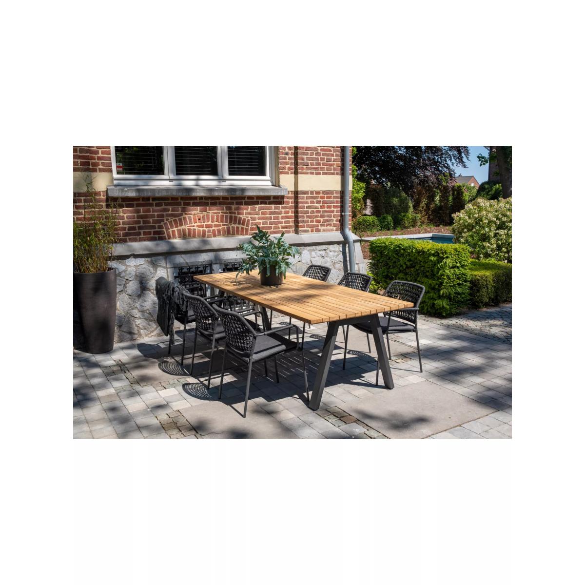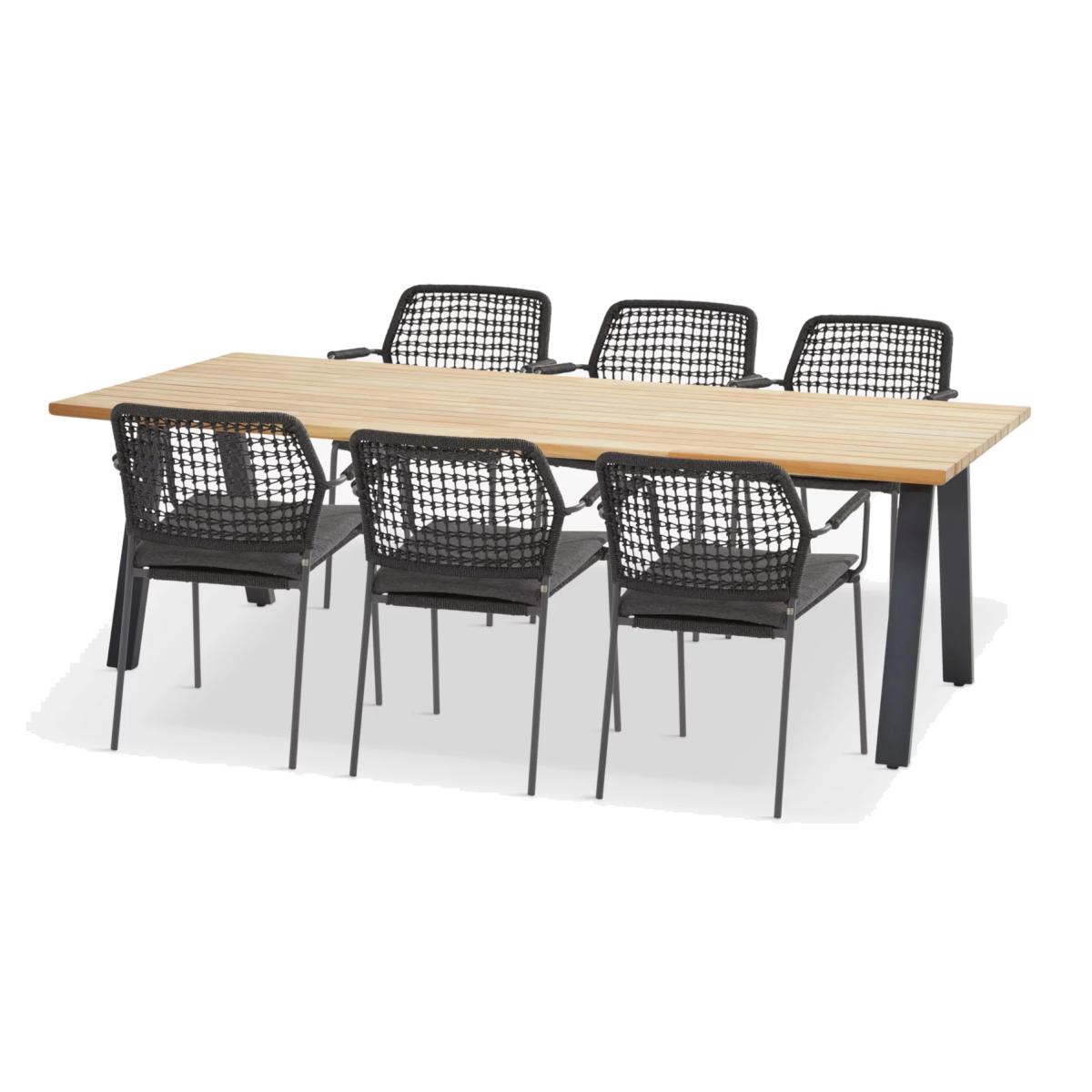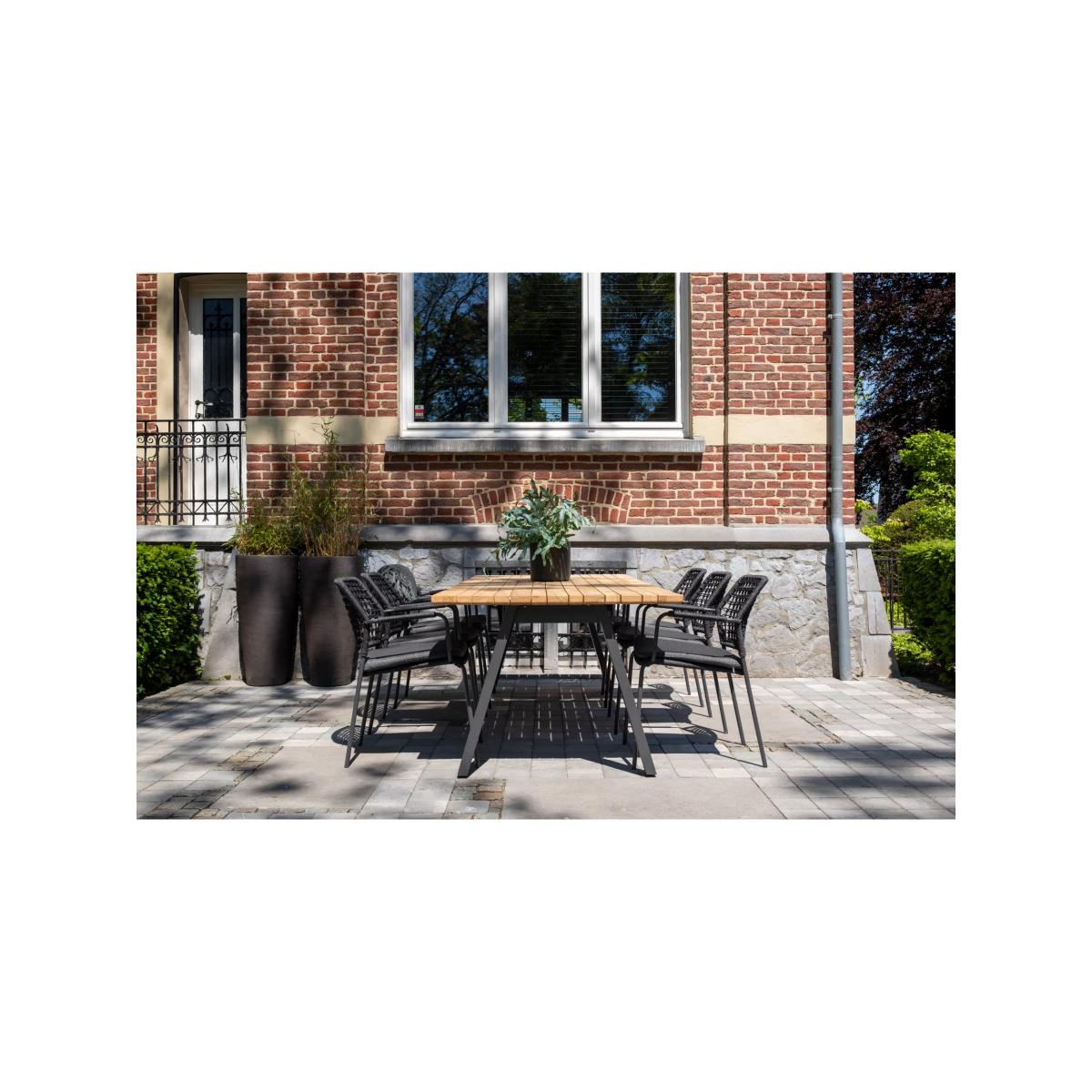 Contemporary and weather-resistant six-seater garden dining set from 4 Seasons Outdoor. The set includes six Barista garden dining armchairs and a rectangular Ambassador dining table. The table has an FSC-certified teak wood slatted top and angled stainless steel legs in a powder-coated anthracite finish. The rope-like design on the armchairs is handwoven with a high-quality, durable weave. All the rope materials have a polypropylene base or weave assuring the rope remains taut. The rope contains no hazardous materials and can be fully recycled at the end of its lifetime. The foam-filled seat cushions give you comfortable support and the covers are removable and machine-washable for easy cleaning. The sturdy chair legs are made of powder-coated stainless steel. Key features: Six Barista garden dining chairs Rectangular 240cm Ambassador dining table with an FSC-certified teak wood top Stainless steel table legs in a powder-coated anthracite finish Sturdy powder-coated stainless steel chair frames with rope-like durable weaves Seat cushions with machine washable covers Weather-resistant for outdoor use Garden furniture care: To keep your outdoor furniture in the best condition, store it in a cool, dry, well-ventilated spot indoors over the winter. If it’s staying outside, use an outdoor furniture cover whenever the weather is wet or unseasonal. Make sure furniture is clean and dry before storing it away and keep cushions in a clean and dry place when not in use. By choosing this product you are supporting responsible management of the world's forests. The Forest Stewardship Council® (FSC®) is a global, not-for-profit organisation that helps take care of forests and the people and wildlife that call them home. To learn more, visit fsc.org.