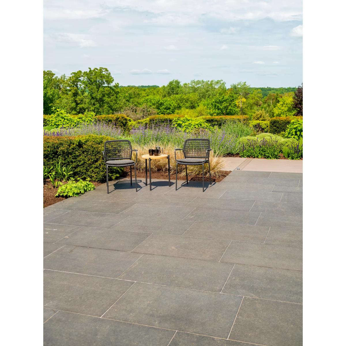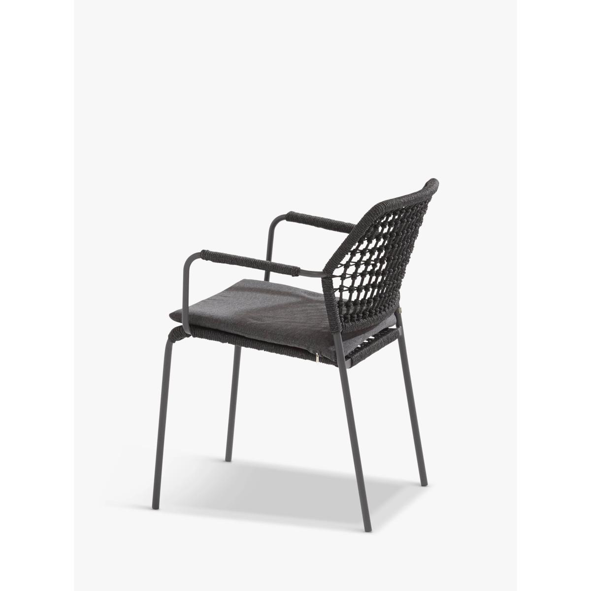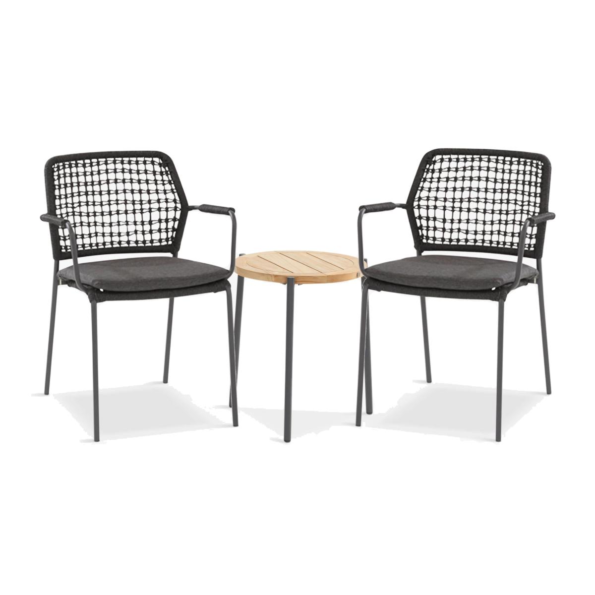 Contemporary and weather-resistant two-seater garden bistro set from 4 Seasons Outdoor. The set includes two Barista garden dining armchairs and a round Yoga bistro table with sturdy yet lightweight aluminium legs in a protective powder-coated finish and a naturally weather-resistant teak wood top. The rope-like design on the armchairs is handwoven with a high-quality, durable weave. All the rope materials have a polypropylene base or weave assuring the rope remains taut. The rope contains no hazardous materials and can be fully recycled at the end of its lifetime. The foam-filled seat cushions give you comfortable support and the covers are removable and machine-washable for easy cleaning. The sturdy chair legs are made of powder-coated stainless steel. Key features: Two Barista garden dining chairs Round 45cm Yoga bistro table with an FSC-certified teak wood top Aluminium table legs in a powder-coated anthracite finish Sturdy powder-coated stainless steel chair frames with rope-like durable weaves Seat cushions with machine washable covers Weather-resistant for outdoor use Garden furniture care: To keep your outdoor furniture in the best condition, store it in a cool, dry, well-ventilated spot indoors over the winter. If it’s staying outside, use an outdoor furniture cover whenever the weather is wet or unseasonal. Make sure furniture is clean and dry before storing it away and keep cushions in a clean and dry place when not in use. By choosing this product you are supporting responsible management of the world's forests. The Forest Stewardship Council® (FSC®) is a global, not-for-profit organisation that helps take care of forests and the people and wildlife that call them home. To learn more, visit fsc.org.