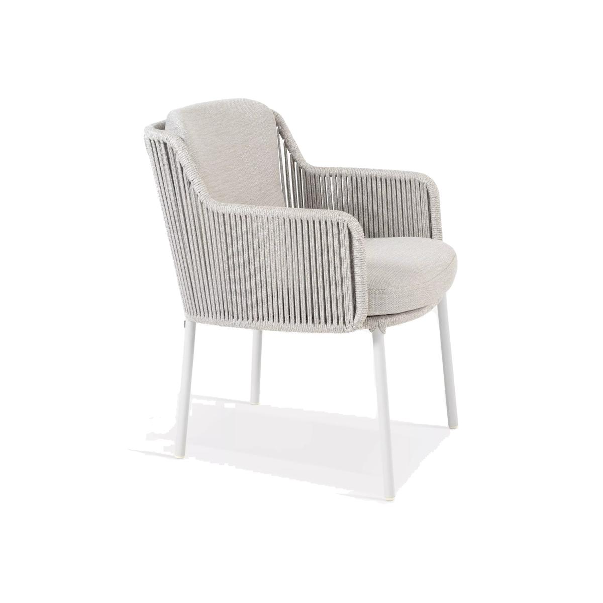Contemporary and weather-resistant pair of Bernini garden dining chairs from 4 Seasons Outdoor. The rope-like design on the armchairs is handwoven with a high-quality, durable weave. All the rope materials have a polypropylene base or weave, ensuring the rope remains taut. The rope contains no hazardous materials and can be fully recycled at the end of its lifetime. The foam-filled seat and backrest cushions give you comfortable support and the covers are removable and machine-washable for easy cleaning. The sturdy chair frames and legs are made of powder-coated stainless steel. Key features: Pair of Bernini garden dining chairs Sturdy powder-coated stainless steel frames and legs Rope-like durable weave on the chairs Seat and backrest cushions with machine washable covers Weather-resistant Fully assembled for immediate use Garden furniture care: To keep your outdoor furniture in the best condition, store it in a cool, dry, well-ventilated spot indoors over the winter. If it’s staying outside, use an outdoor furniture cover whenever the weather is wet or unseasonal. Make sure furniture is clean and dry before storing it away, and keep cushions in a clean and dry place when not in use.