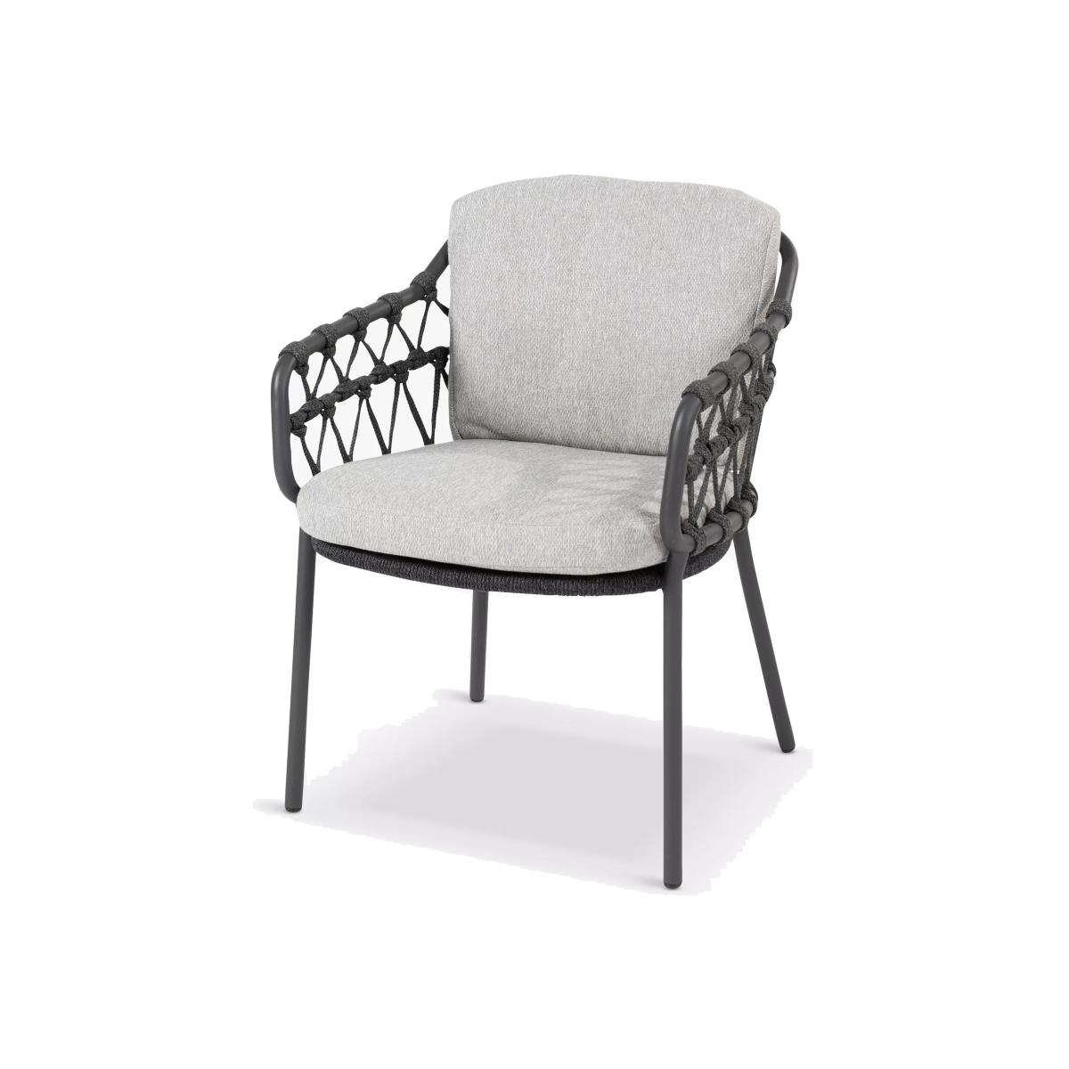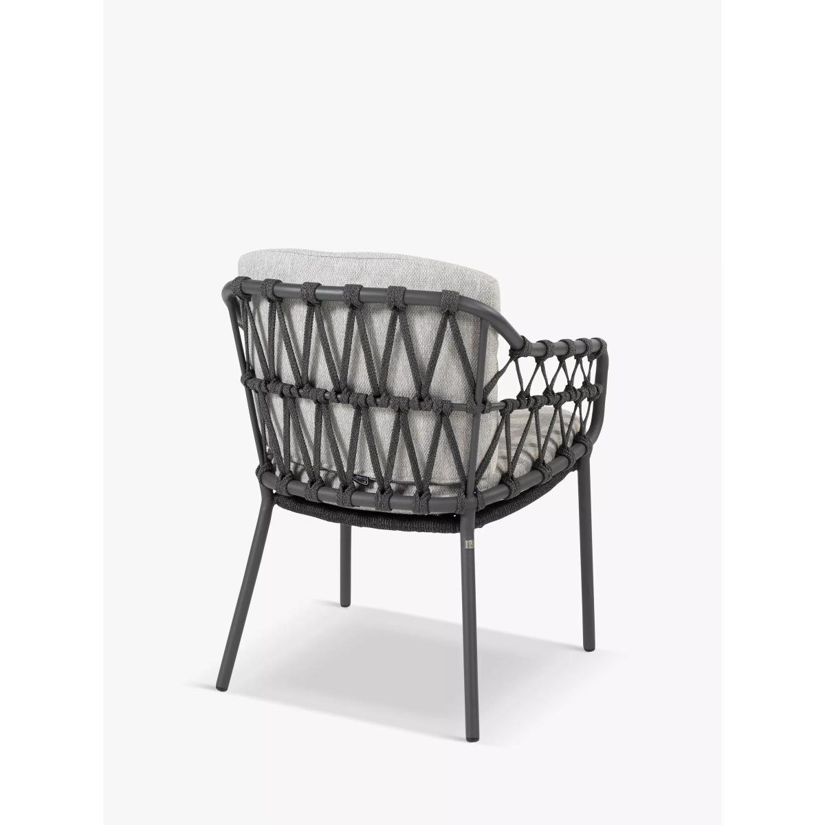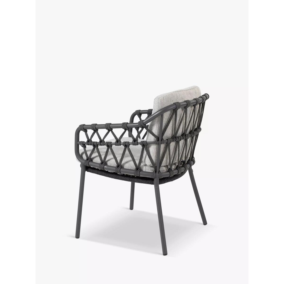 Contemporary and weather-resistant pair of Calpi garden dining chairs from 4 Seasons Outdoor. The knotted rope-style design on the chairs is handwoven with a high-quality, durable weave. All the rope materials have a polypropylene base or weave, ensuring the rope remains taut. The rope contains no hazardous materials and can be fully recycled at the end of its lifetime. The foam-filled seat and backrest cushions give you comfortable support and the covers are removable and machine-washable for easy cleaning. The sturdy chair frames and legs are made of powder-coated stainless steel. Key features: Pair of Calpi garden dining armchairs Powder-coated stainless steel frame and chair legs in anthracite Knotted rope-style durable weave on the chairs Seat cushions with machine washable covers Weather-resistant Fully assembled for immediate use Garden furniture care: To keep your outdoor furniture in the best condition, store it in a cool, dry, well-ventilated spot indoors over the winter. If it’s staying outside, use an outdoor furniture cover whenever the weather is wet or unseasonal. Make sure furniture is clean and dry before storing it away, and keep cushions in a clean and dry place when not in use.