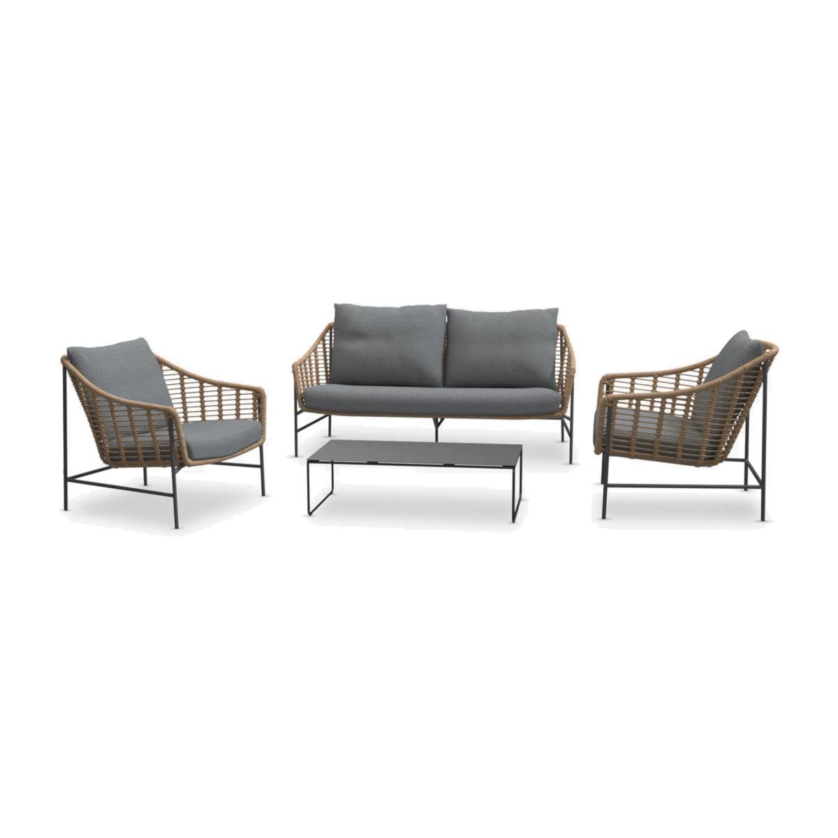 A contemporary lounging set for up to four people, this Cottage set includes a pair of lounging chairs, a wide two-seater sofa and a rectangular metal coffee table, for the garden or conservatory. The rope-like design on the chairs and sofa is handwoven with 4 Seasons Outdoor's Hularo weave, made from synthetic wicker that's both UV-resistant and water-resistant. This type of wicker is easy to clean, durable and resistant to UV rays, salt water, lotions, chlorine and alcohol. The foam-filled seat and backrest cushions give you comfortable support and the covers are removable and machine washable for easy cleaning. Key benefits: Pair of lounging armchairs, 2-seater sofa and rectangular coffee table Robust metal frames and table Rope-like Hularo weave chairs Seat and backrest cushions with machine washable covers Weather-resistant, UV-resistant Matches garden furniture in the Cottage range Want to see it first? You may want to see and get a feel for the product in one of our shops before ordering. We'll be able to tell you where the range you'd like to view is on display.