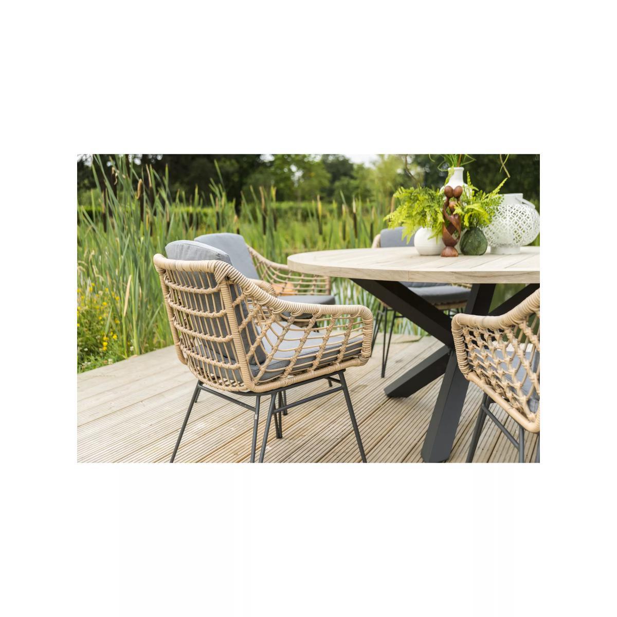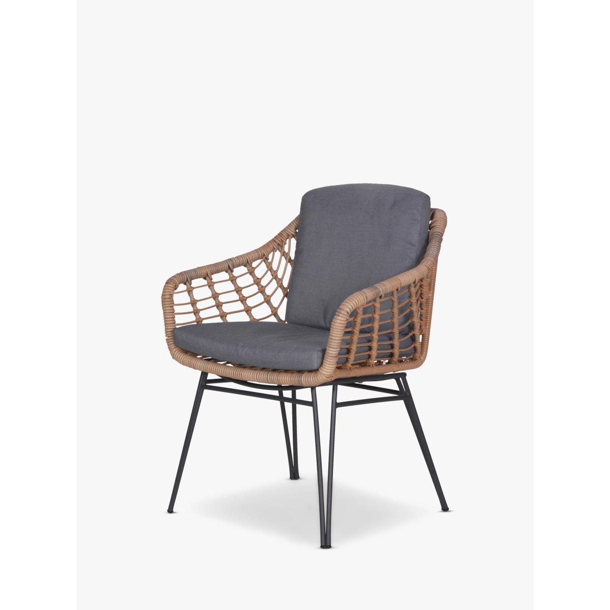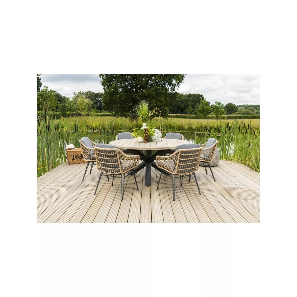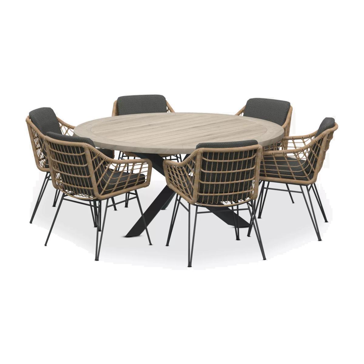 A contemporary dining set for up to six people, this Cottage set includes six dining chairs and a round dining table, for the garden or conservatory. The rope-like design on the chairs is handwoven with 4 Seasons Outdoor's Hularo weave, made from synthetic wicker that's both UV-resistant and water-resistant. This type of wicker is easy to clean, durable and resistant to UV rays, salt water, lotions, chlorine and alcohol. The foam-filled seat and backrest cushions give you comfortable support and the covers are removable and machine washable for easy cleaning. The table top is made of weather-resistant FSC-certified teak wood, sourced from sustainably managed forests. Key benefits: Six dining armchairs and 6-seater dining table FSC-certified teak wood table top Robust metal frames Rope-like Hularo weave chairs Seat and backrest cushions with machine washable covers Weather-resistant, UV-resistant Matches garden furniture in the Cottage range Want to see it first? You may want to see and get a feel for the product in one of our shops before ordering. We'll be able to tell you where the range you'd like to view is on display.