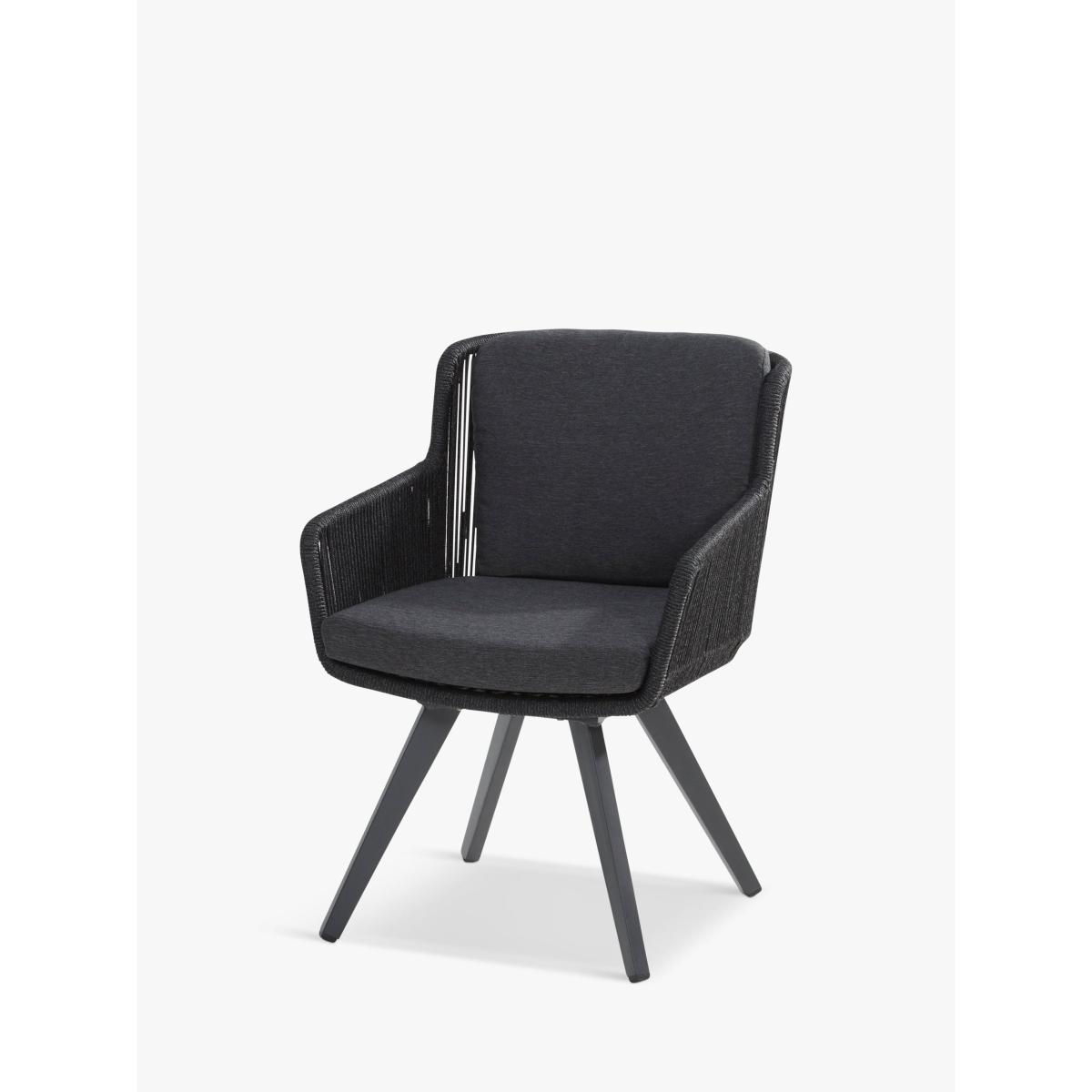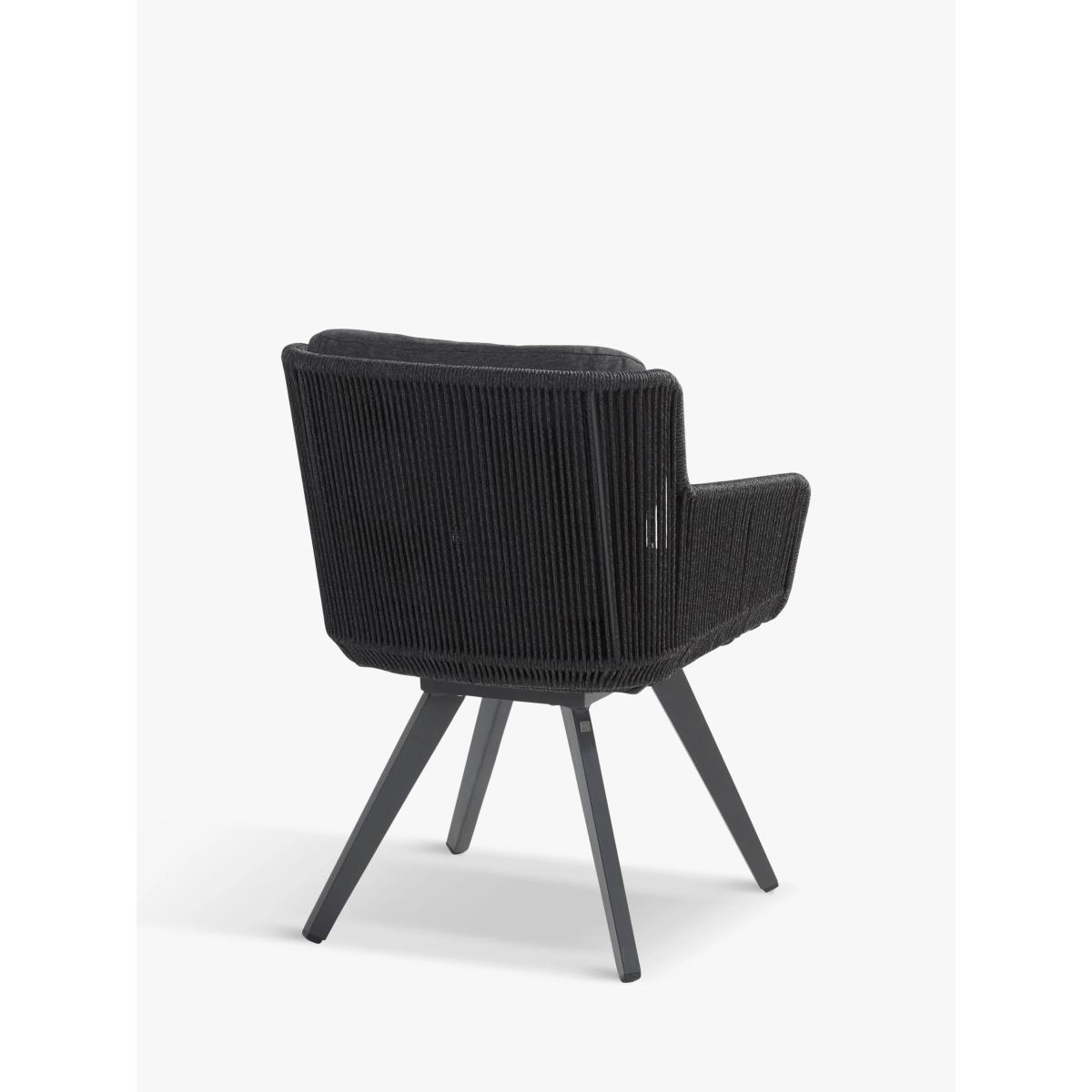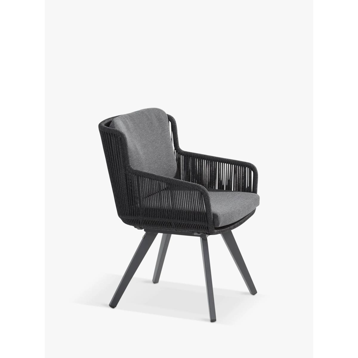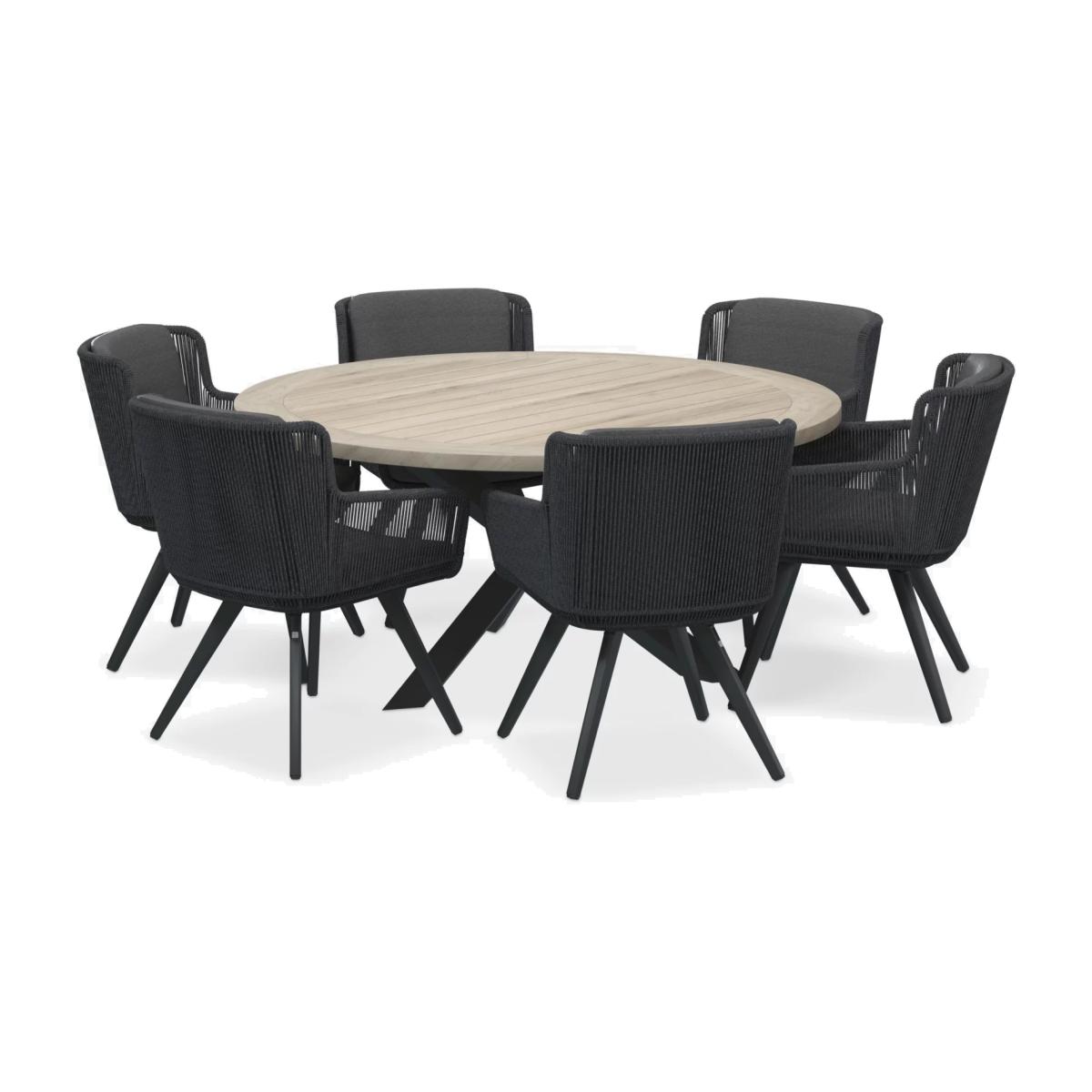 A contemporary dining set for up to six people, this weather-resistant 4 Seasons Outdoor set includes six Flores dining chairs and a round Louvre dining table, for the garden or conservatory. The rope-like design on the chairs is handwoven with a high-quality, durable weave. All the rope materials have a polypropylene base or weave assuring the rope remains taut. The rope contains no hazardous materials and can be fully recycled at the end of its lifetime. The foam-filled seat and backrest cushions give you comfortable support and the covers are removable and machine washable for easy cleaning. The table top is made of weather-resistant FSC-certified teak wood, sourced from sustainably managed forests. Key benefits: Six dining armchairs and 6-seater round dining table FSC-certified teak wood table top Robust aluminium frames Rope-like synthetic weave chairs Seat and backrest cushions with machine washable covers Weather-resistant Seat height: 49cm