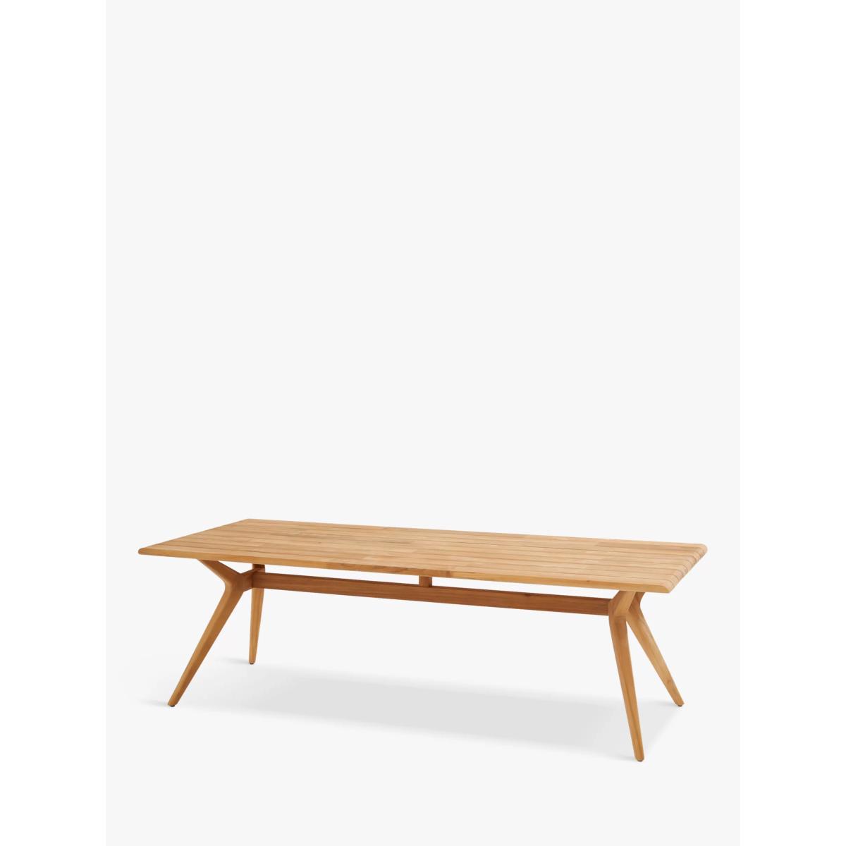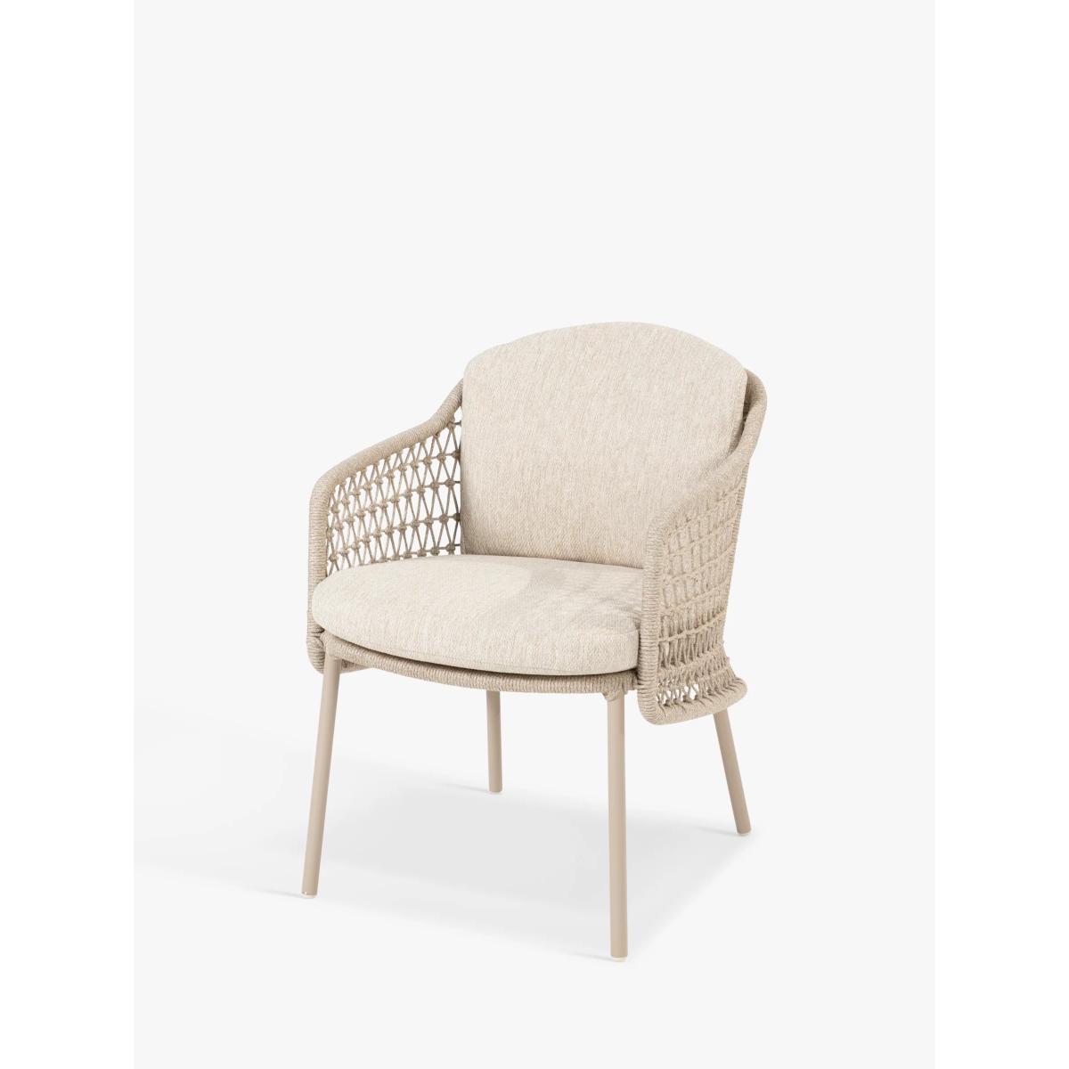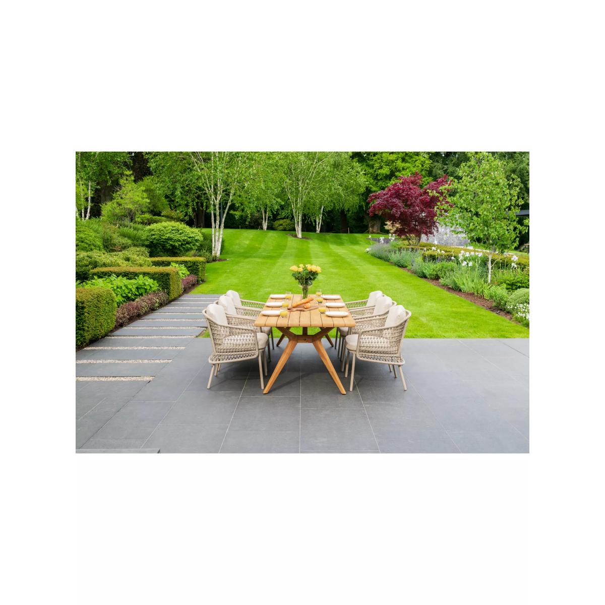 Contemporary and weather-resistant six-seater garden dining set from 4 Seasons Outdoor. The set includes six Puccini dining armchairs and a rectangular Belair table, a retro-inspired design made of naturally weather-resistant FSC-certified teak wood with conical legs and subtly rounded corners on the tabletop. The rope-like design on the Puccini chairs is handwoven with a high-quality, durable weave. All the rope materials have a polypropylene base or weave assuring the rope remains taut. The rope contains no hazardous materials and can be fully recycled at the end of its lifetime. The foam-filled seat and backrest cushions give you comfortable support and the covers are removable and machine-washable for easy cleaning. The sturdy chair legs are made of powder-coated stainless steel. Key features: Six Puccini garden dining chairs 240cm rectangular Belair dining table made of FSC-certified teak wood Sturdy powder-coated stainless steel chair frames with rope-like durable weaves Seat and backrest cushions with machine washable covers Weather-resistant for outdoor use Garden furniture care: To keep your outdoor furniture in the best condition, store it in a cool, dry, well-ventilated spot indoors over the winter. If it’s staying outside, use an outdoor furniture cover whenever the weather is wet or unseasonal. Make sure furniture is clean and dry before storing it away and keep cushions in a clean and dry place when not in use. By choosing this product you are supporting responsible management of the world's forests. The Forest Stewardship Council® (FSC®) is a global, not-for-profit organisation that helps take care of forests and the people and wildlife that call them home. To learn more, visit fsc.org.