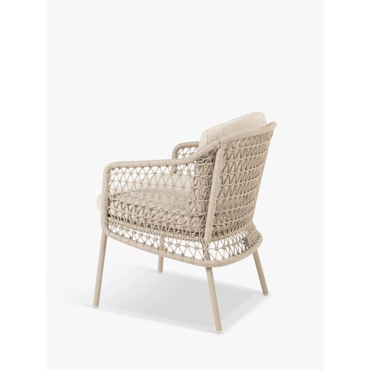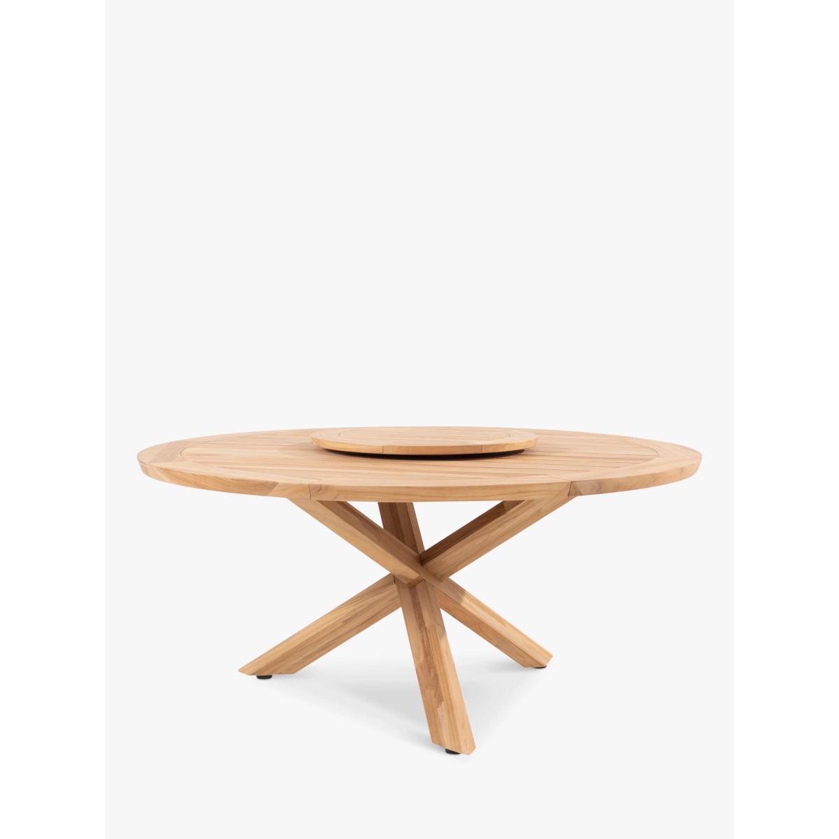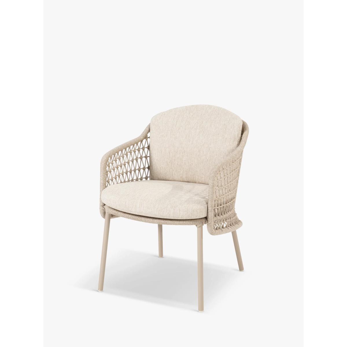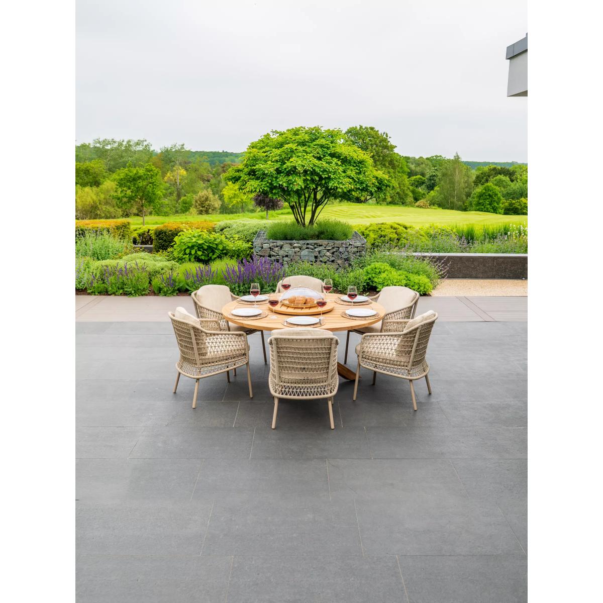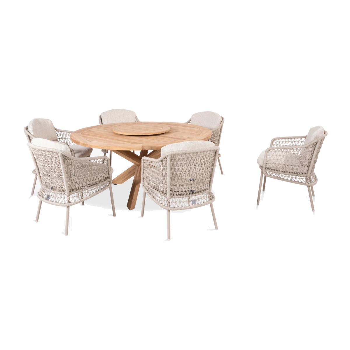 Contemporary and weather-resistant six-seater garden dining set from 4 Seasons Outdoor. The set includes six Puccini dining armchairs and a round Prado dining table with a Lazy Susan in the centre. The table is made of FSC-certified teak wood with cross-base legs and a slatted top. The rope-like design on the Puccini chairs is handwoven with a high-quality, durable weave. All the rope materials have a polypropylene base or weave assuring the rope remains taut. The rope contains no hazardous materials and can be fully recycled at the end of its lifetime. The foam-filled seat and backrest cushions give you comfortable support and the covers are removable and machine-washable for easy cleaning. The sturdy chair legs are made of powder-coated stainless steel. Key features: Six Puccini garden dining chairs 160cm round Prado dining table made of FSC-certified teak wood Sturdy powder-coated stainless steel chair frames with rope-like durable weaves Seat and backrest cushions with machine washable covers Weather-resistant for outdoor use Garden furniture care: To keep your outdoor furniture in the best condition, store it in a cool, dry, well-ventilated spot indoors over the winter. If it’s staying outside, use an outdoor furniture cover whenever the weather is wet or unseasonal. Make sure furniture is clean and dry before storing it away and keep cushions in a clean and dry place when not in use. By choosing this product you are supporting responsible management of the world's forests. The Forest Stewardship Council® (FSC®) is a global, not-for-profit organisation that helps take care of forests and the people and wildlife that call them home. To learn more, visit fsc.org.