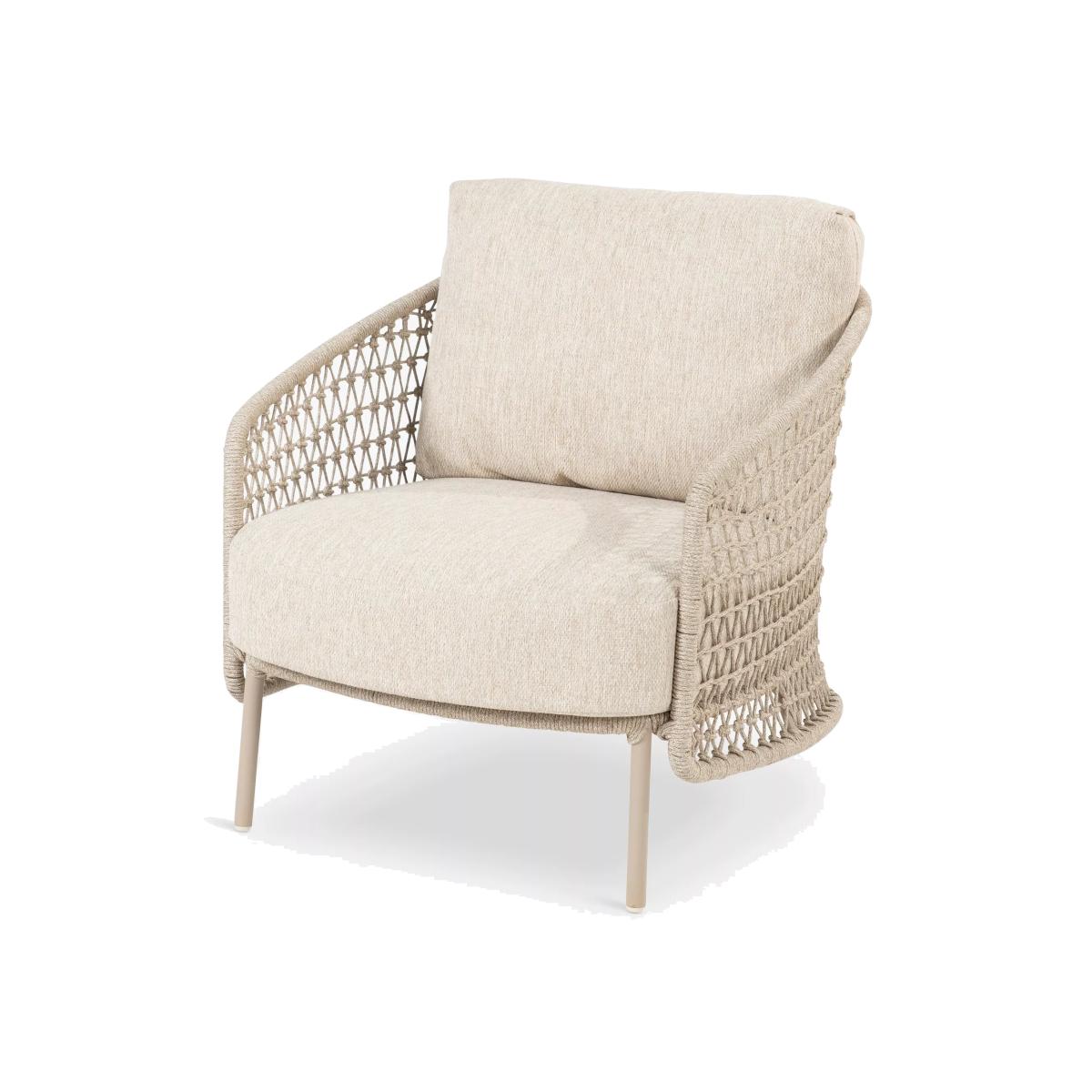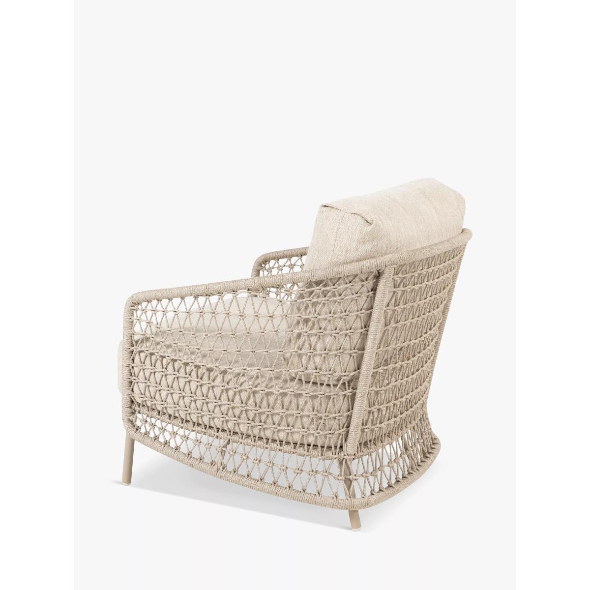 Contemporary and weather-resistant Puccini outdoor living chair from 4 Seasons Outdoor. The rope-like design on the armchair is handwoven with a high-quality, durable weave. All the rope materials have a polypropylene base or weave, ensuring the rope remains taut. The rope contains no hazardous materials and can be fully recycled at the end of its lifetime. The foam-filled seat and backrest cushions give you comfortable support and the covers are removable and machine-washable for easy cleaning. The sturdy chair legs are made of powder-coated stainless steel. Key features: Puccini garden living chair Sturdy powder-coated stainless steel legs Rope-like durable weave on the chair Plump seat and backrest cushions with machine washable covers Weather-resistant Fully assembled for immediate use Garden furniture care: To keep your outdoor furniture in the best condition, store it in a cool, dry, well-ventilated spot indoors over the winter. If it’s staying outside, use an outdoor furniture cover whenever the weather is wet or unseasonal. Make sure furniture is clean and dry before storing it away, and keep cushions in a clean and dry place when not in use.