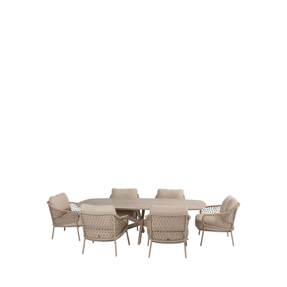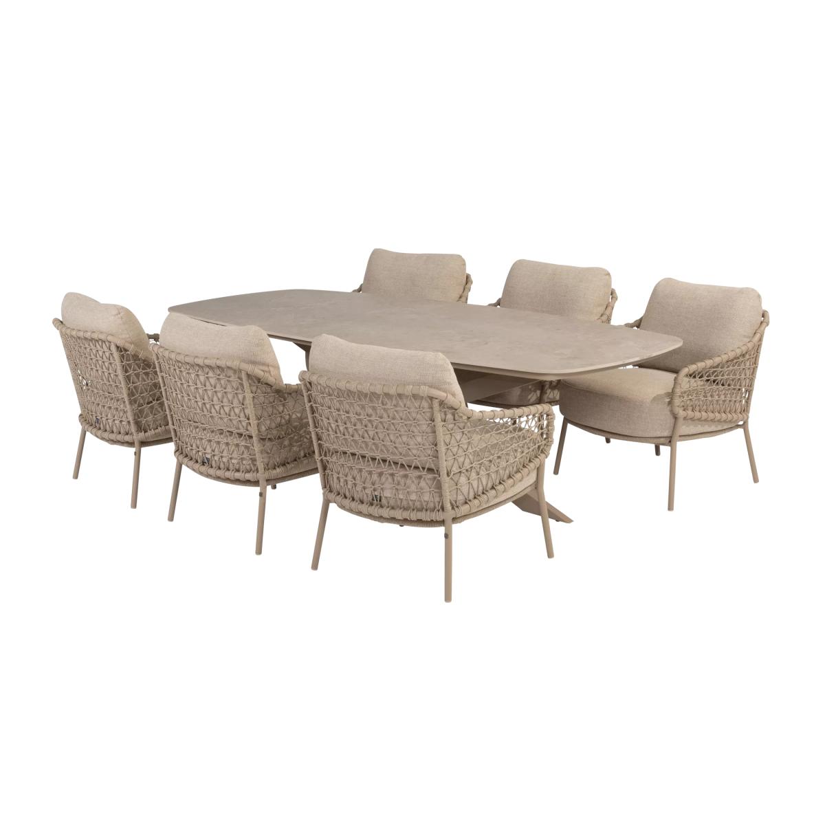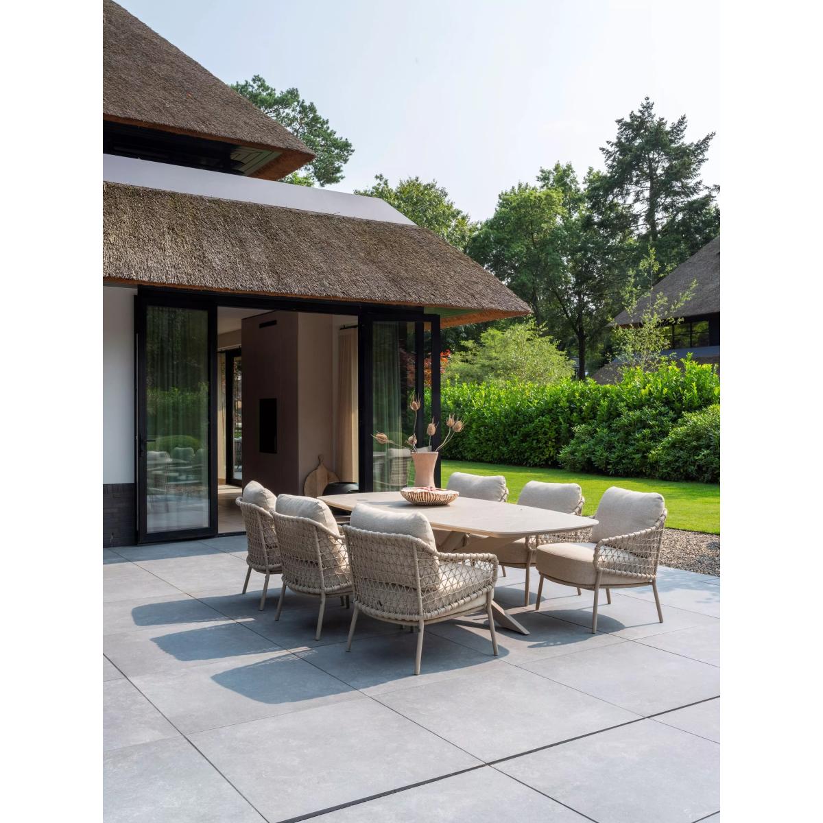The organic design of the Sardinia range from 4 Seasons Outdoor is Mediterranean-inspired with its soft beige colours and round shapes creating an idyllic space to sit comfortably. This relaxed garden set includes six Sardinia low dining chairs and a barrel-shaped Nevada dining table with a ceramic Sabia Panna top which is durable and low-maintenance. The rope-like design on the chairs is handwoven with a high-quality, durable weave. All the rope materials have a polypropylene base or weave, ensuring the rope remains taut. The rope contains no hazardous materials and can be fully recycled at the end of its lifetime. The foam-filled seat and backrest cushions give you comfortable support and the covers are removable and machine-washable for easy cleaning. The sturdy chair frames are made of lightweight yet robust powder-coated aluminium. Key features: Six Sardinia garden low dining chairs Barrel-shaped Nevada dining table with a Sabia Panna ceramic top Sturdy powder-coated aluminium chair frames with rope-like durable weaves Seat and backrest cushions with machine washable covers Weather-resistant for outdoor use Garden furniture care: To keep your outdoor furniture in the best condition, store it in a cool, dry, well-ventilated spot indoors over the winter. If it’s staying outside, use an outdoor furniture cover whenever the weather is wet or unseasonal. Make sure furniture is clean and dry before storing it away, and keep cushions in a clean and dry place when not in use.