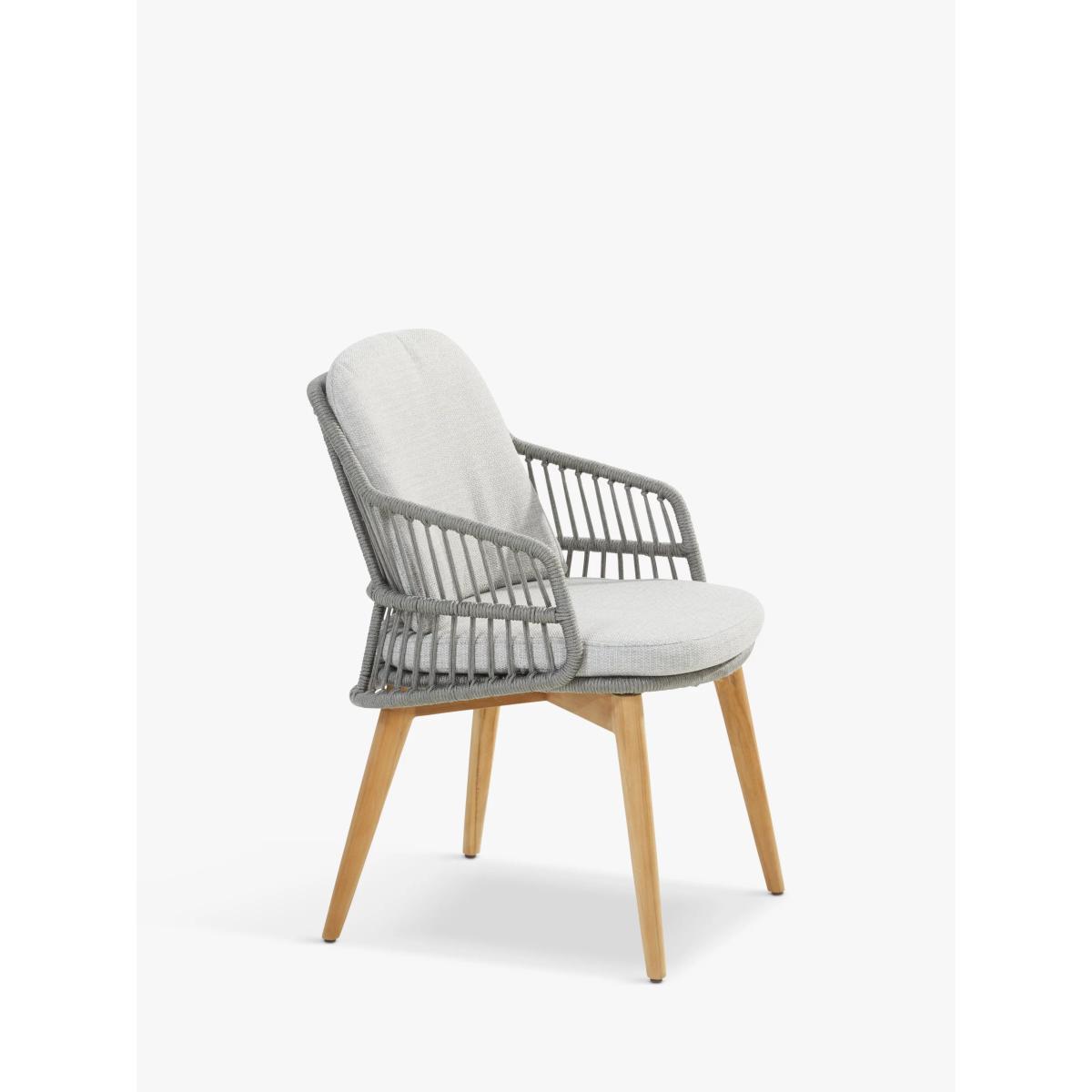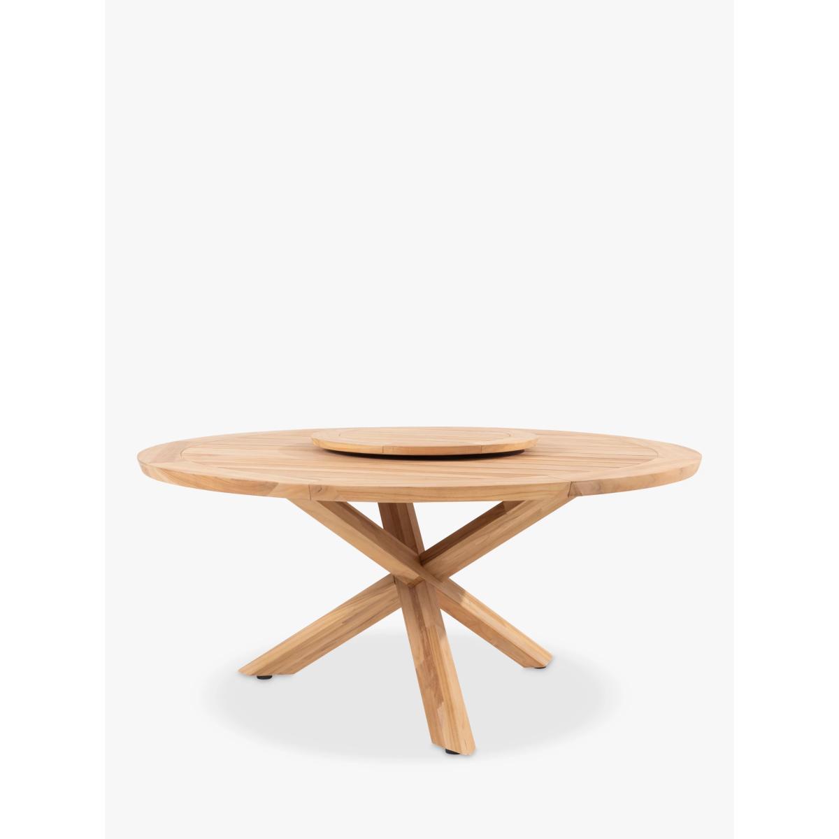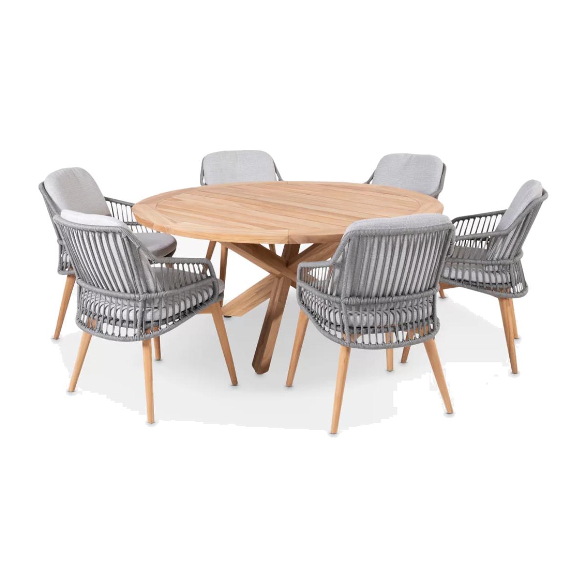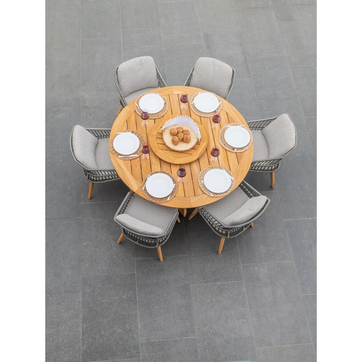Contemporary and weather-resistant six-seater garden dining set from 4 Seasons Outdoor. The set includes six Sempre dining armchairs and a round Prado dining table with a Lazy Susan in the centre. The table is made of FSC-certified teak wood with cross-base legs and a slatted top. The airy and organic rope-like design on the chairs is handwoven with a high-quality, durable weave. All the rope materials have a polypropylene base or weave assuring the rope remains taut. The rope contains no hazardous materials and can be fully recycled at the end of its lifetime. The foam-filled seat and two backrest cushions give you comfortable support and the covers are removable and machine-washable for easy cleaning. The legs are made of naturally weather-resistant FSC-certified teak wood. Key features: Six Sempre garden dining chairs 160cm round Prado dining table made of FSC-certified teak wood FSC-certified teak wood chair legs and rope-like durable weaves Seat and backrest cushions with machine washable covers Weather-resistant for outdoor use Garden furniture care: To keep your outdoor furniture in the best condition, store it in a cool, dry, well-ventilated spot indoors over the winter. If it’s staying outside, use an outdoor furniture cover whenever the weather is wet or unseasonal. Make sure furniture is clean and dry before storing it away and keep cushions in a clean and dry place when not in use. By choosing this product you are supporting responsible management of the world's forests. The Forest Stewardship Council® (FSC®) is a global, not-for-profit organisation that helps take care of forests and the people and wildlife that call them home. To learn more, visit fsc.org.