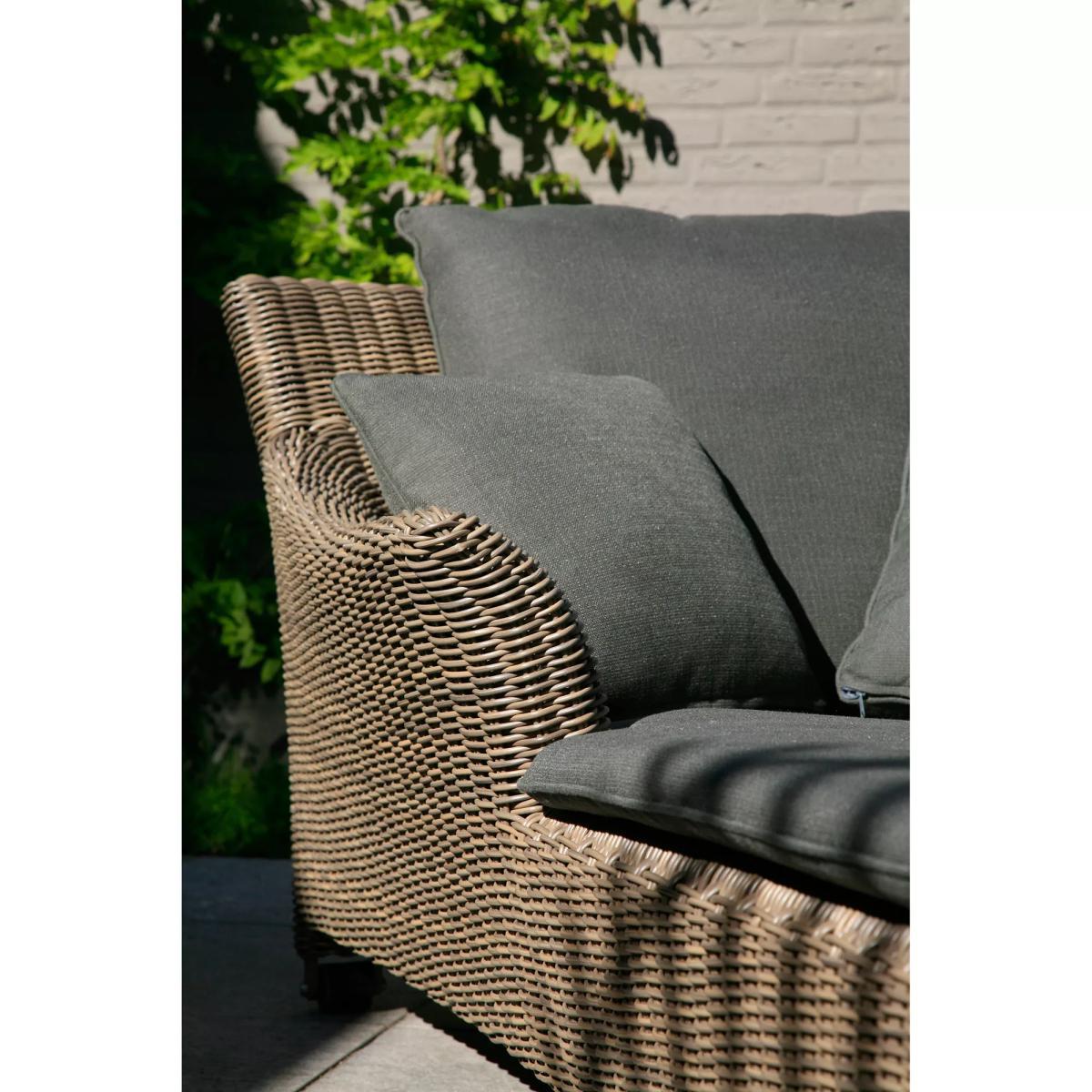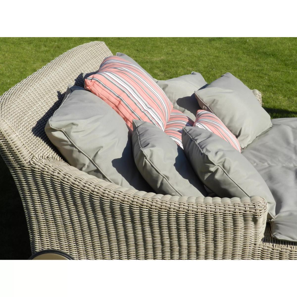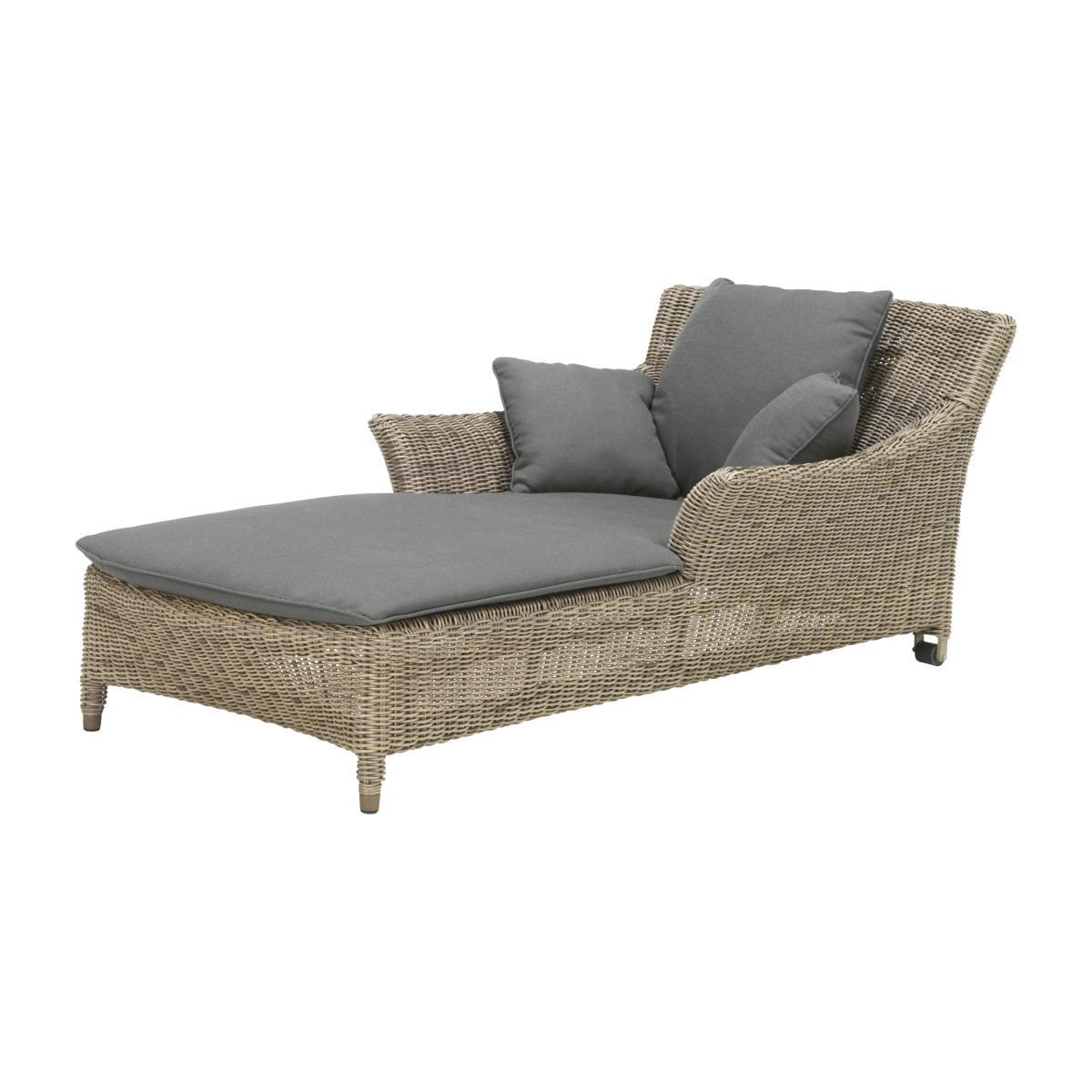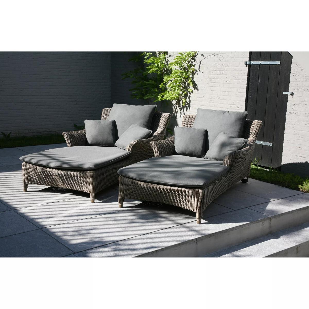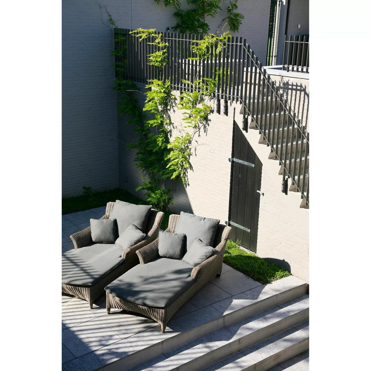 Generous proportions and four sumptuous cushions make the Valentine sunbed an appealing addition to your garden lounge set-up. Lean back and enjoy hours of relaxation, with the large size allowing two people to enjoy this comfortable sun bed at once. 4 Seasons Outdoor’s pure synthetic wicker material is easy to clean, durable and resistant to UV rays, salt water, lotions, chlorine and alcohol. It is colourfast and contains no hazardous substances; it can also be fully recycled. Tested for 5,000 hours (representative of 5 years of outdoor use), the colour shows no visible changes. The cushions arriving with this product are weatherproof, so you can leave them out in a shower or two. Thanks to special foam filling, the water quickly flows through the cushions, while the Dacron material ensures that the cushions retain their shape. The cushions are also UV-resistant and fungus-free, as well as being environmentally friendly and recyclable. To clean and maintain the cushion covers, wash without chemicals at 40°C. Tumble drying and ironing permitted. To protect the cushions against dirt and dust, store them inside when not in use. Guarantee: The sun lounger weave comes with a 10-year guarantee and the cushions come with a 3-year guarantee. Please note: not all our ranges are on display in our shops.
