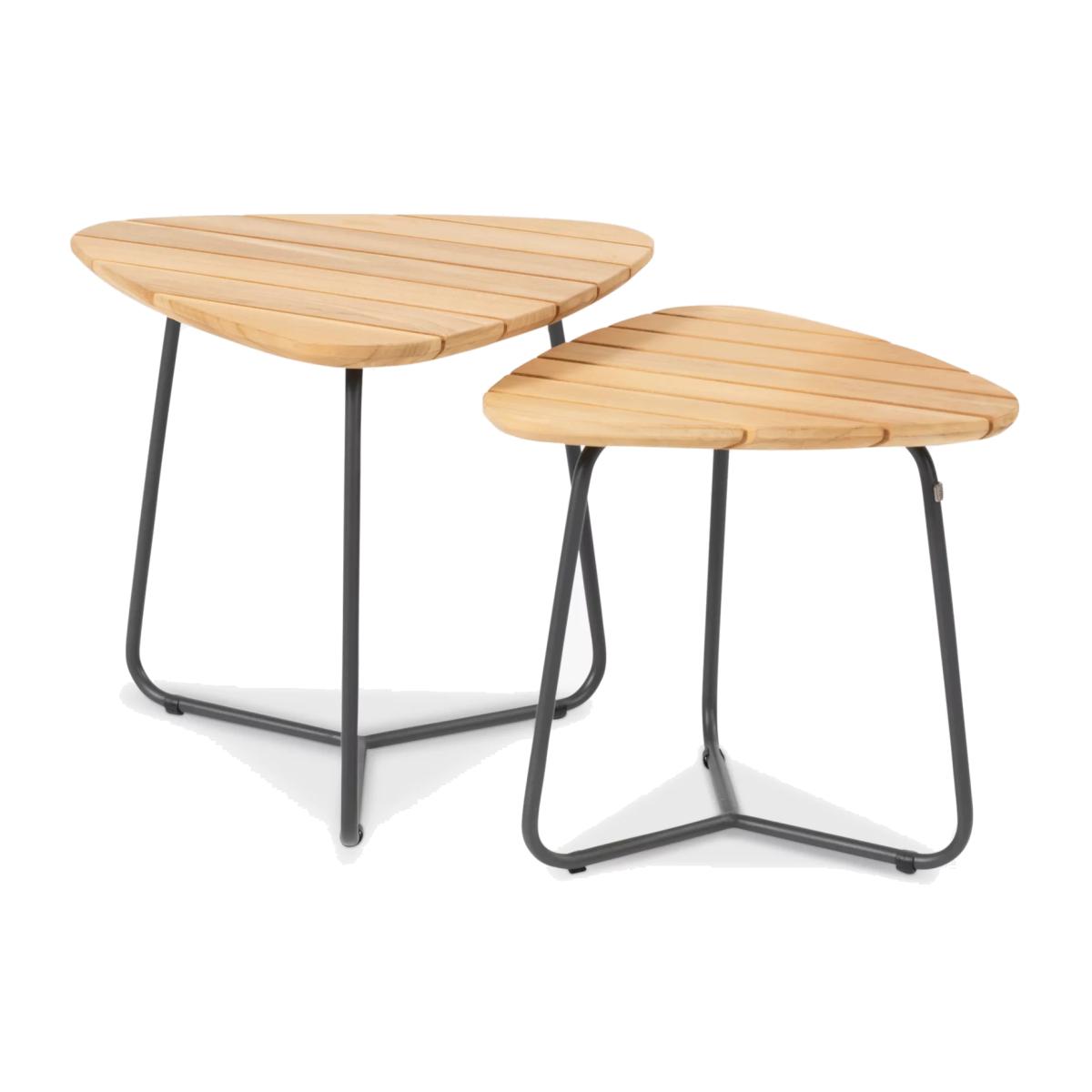 Pair of triangular Verdi coffee tables from 4 Seasons Outdoor, ideal for complementing garden lounge sets. Suitable for outdoor use, this design has slatted tops made of naturally weather-resistant solid teak wood. The sturdy powder-coated stainless steel frames and legs come with protective feet. Garden furniture care: To keep your outdoor furniture in the best condition, store it in a cool, dry, well-ventilated spot indoors over the winter. If it’s staying outside, use an outdoor furniture cover whenever the weather is wet or unseasonal. Make sure furniture is clean and dry before storing it away. By choosing this product you are supporting responsible management of the world's forests. The Forest Stewardship Council® (FSC®) is a global, not-for-profit organisation that helps take care of forests and the people and wildlife that call them home. To learn more, visit fsc.org.