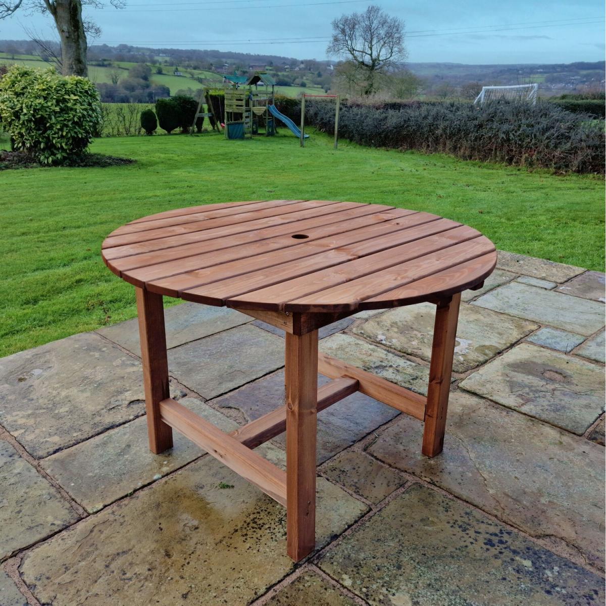 I’m a fan of this round garden table for its simple, sturdy timber construction and versatile size - it fits neatly on a small patio or lawn without overwhelming the space. Its natural finish works equally well in a relaxed country setting, a seaside-themed courtyard or a modern garden with minimalist planting. To style it, layer a woven outdoor rug beneath and add colourful seat pads or cushions to your chairs for comfort and visual interest. A large parasol through the centre hole makes it ready for sunny days, while a cluster of small potted herbs or succulents down the middle brings in texture. Swap in seasonal tableware and lanterns to suit summer barbecues or autumnal evenings.