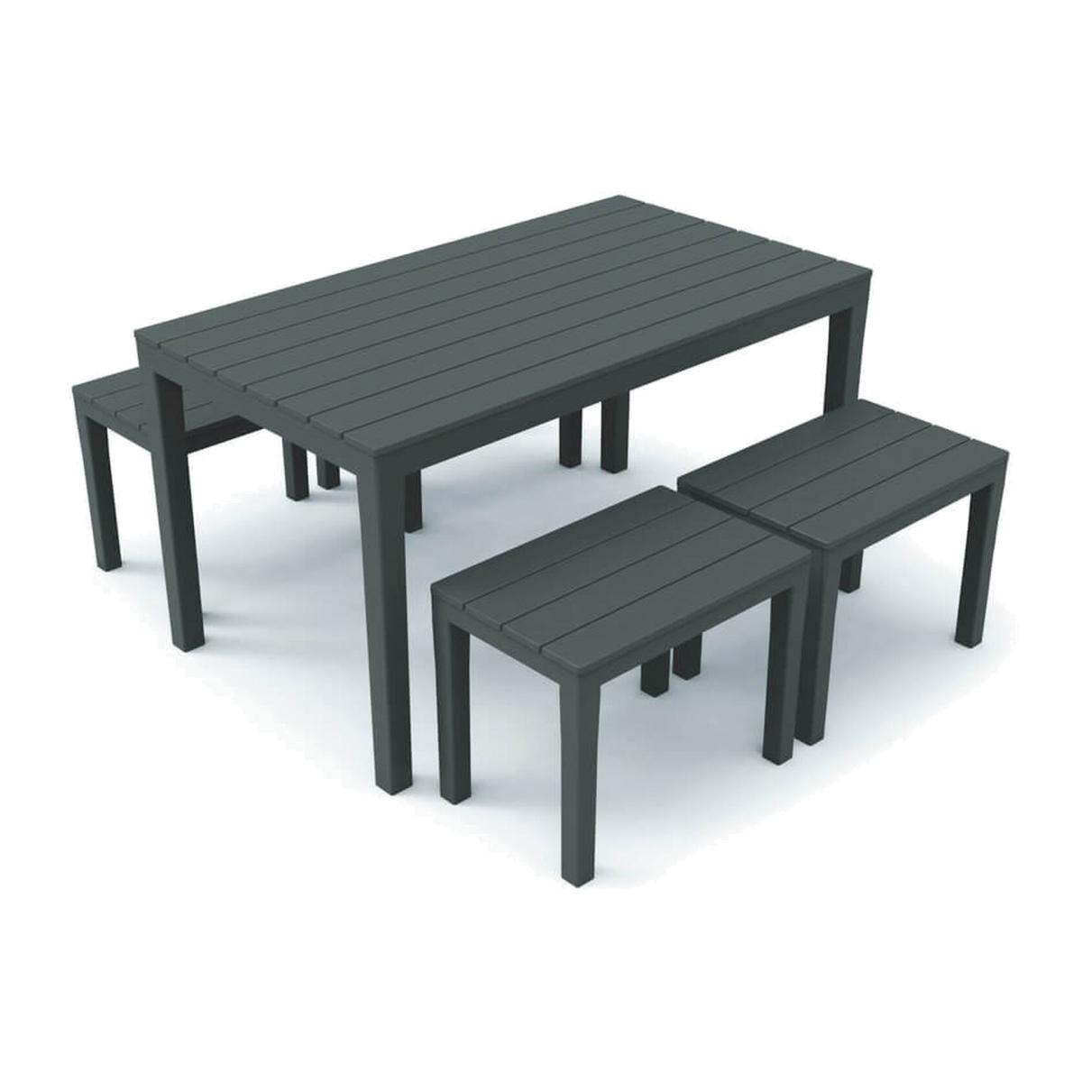 I love how this set offers both style and practicality, making it perfect for outdoor and casual indoor spaces alike. The grey finish is versatile and lends itself well to contemporary, coastal, or Scandinavian interiors, adding a sleek yet understated touch. It works particularly well in patios, terraces, or open-plan living areas where flexible seating and surface space are needed. For styling, consider pairing it with neutral cushions or throws to add comfort, or place it alongside colourful greenery or lanterns for a cosy, inviting setting. Since the benches tuck neatly under the table, it’s ideal for compact spaces or for a clean, minimalist aesthetic when not in use.