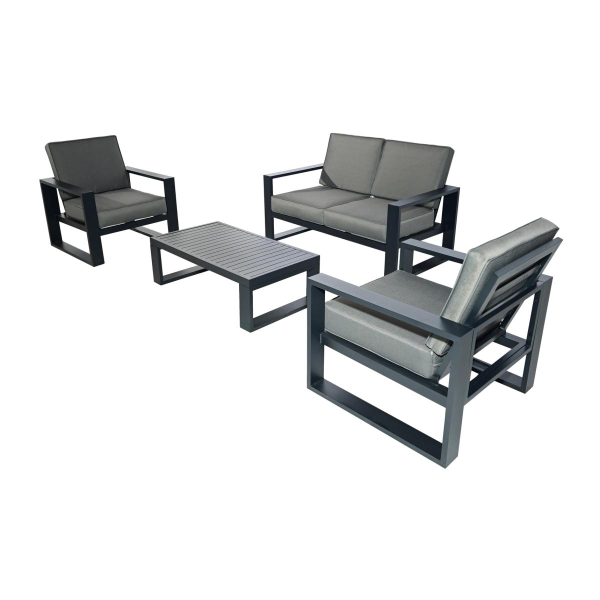 Create an elegant backyard and entertaining space with the Patio Aluminum Sofa by Furniture One! This collection offers the perfect blend of streamlined, minimalist seating and luxuriously comfortable deep seating. All of the same comfort with none of the maintenance! Durable aluminium frames and all-weather seat padding are made to endure in any outdoor setting, rain or shine. It's a beautiful addition whether in your garden, patio, porch, poolside, or other outdoor space! 4 Seater Aluminium Garden Furniture Set with Coffee Table Pad Cushion - Grey / 1 Coffee Table, 2 Armchairs, Loveseat