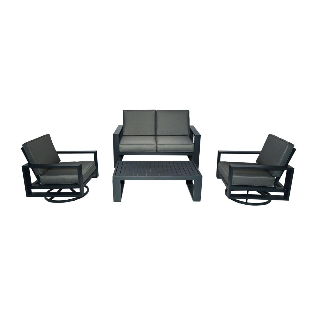 Create an elegant backyard and entertaining space with the Patio Aluminum Sofa by Furniture One! This collection offers the perfect blend of streamlined, minimalist seating and luxuriously comfortable deep seating. All of the same comfort with none of the maintenance! Durable aluminium frames and all-weather seat padding are made to endure in any outdoor setting, rain or shine. It's a beautiful addition whether in your garden, patio, porch, poolside, or other outdoor space! 4 Seater Aluminium Garden Furniture Set with Coffee Table Pad Cushion - Grey / 1 Coffee Table, 2 Swivel Chairs, Loveseat