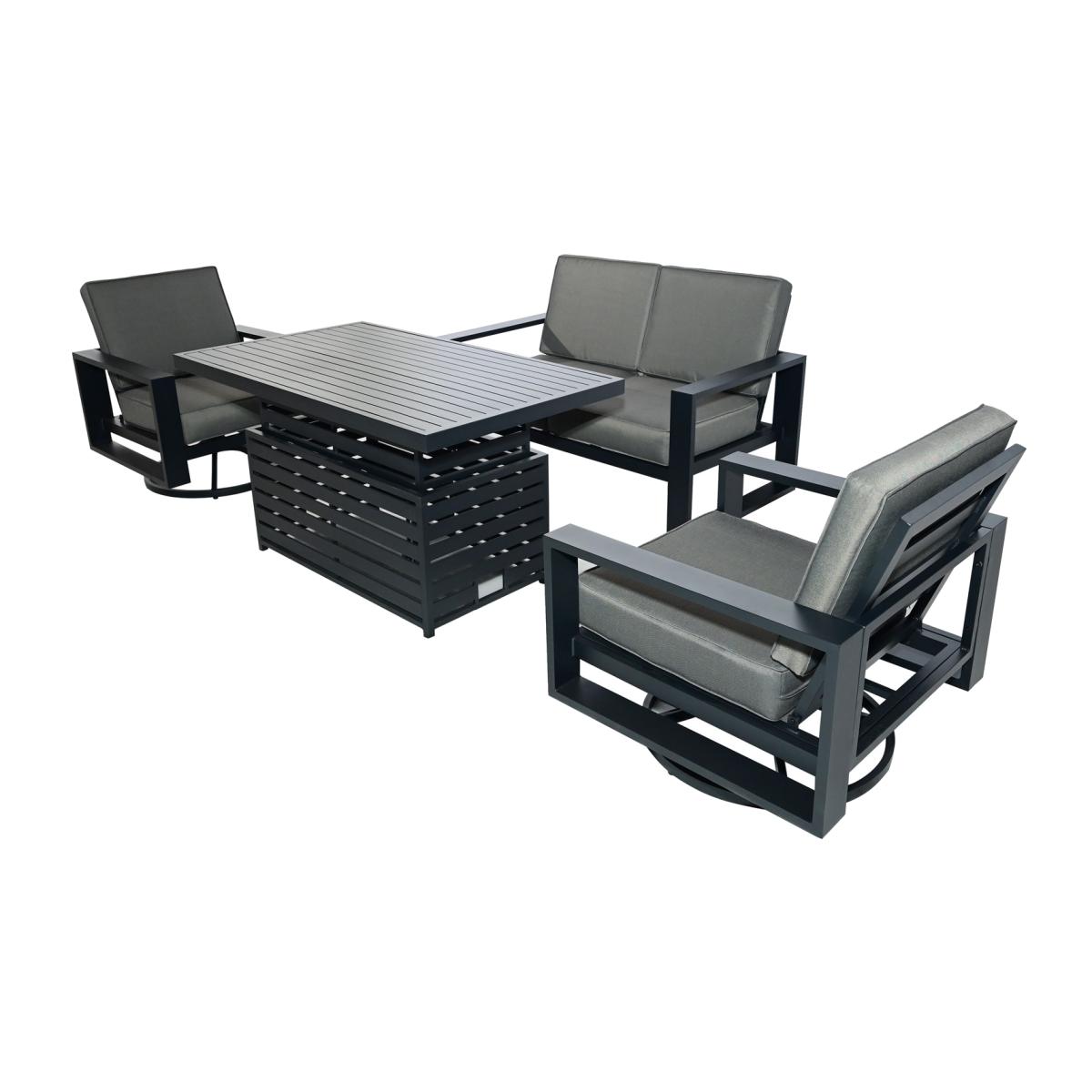 Create an elegant backyard and entertaining space with the Patio Aluminum Sofa by Furniture One ! This collection offers the perfect blend of streamlined, minimalist seating and luxuriously comfortable deep seating. All of the same comfort with none of the maintenance! Durable aluminum frames and all-weather seat padding are made to endure in any outdoor setting, rain or shine. It's a beautiful addition whether in your garden, patio, porch, poolside, or other outdoor space! 4 Seater Aluminium Garden Sofa with Height-Adjustable Table - Grey / 1 Height-Adjustable Table, 2 Swivel Chairs, Loveseat