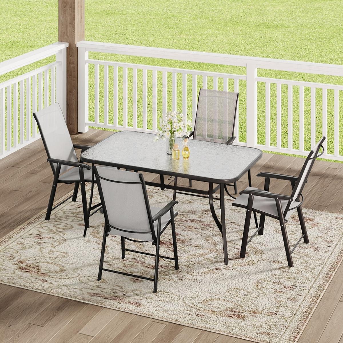 Enjoy summer afternoons with this elegant garden set. The glass table features a rippled, cooling surface. Four folding fabric chairs offer comfort and support. A central parasol hole helps protect you from the sun. Stylish and practical for balconies, gardens, or patios. 4 Seater Bistro Set with 1 Glass Table and 4 Foldable Chairs - Black / 1 x 150CM Glass Table and 2 x Chairs