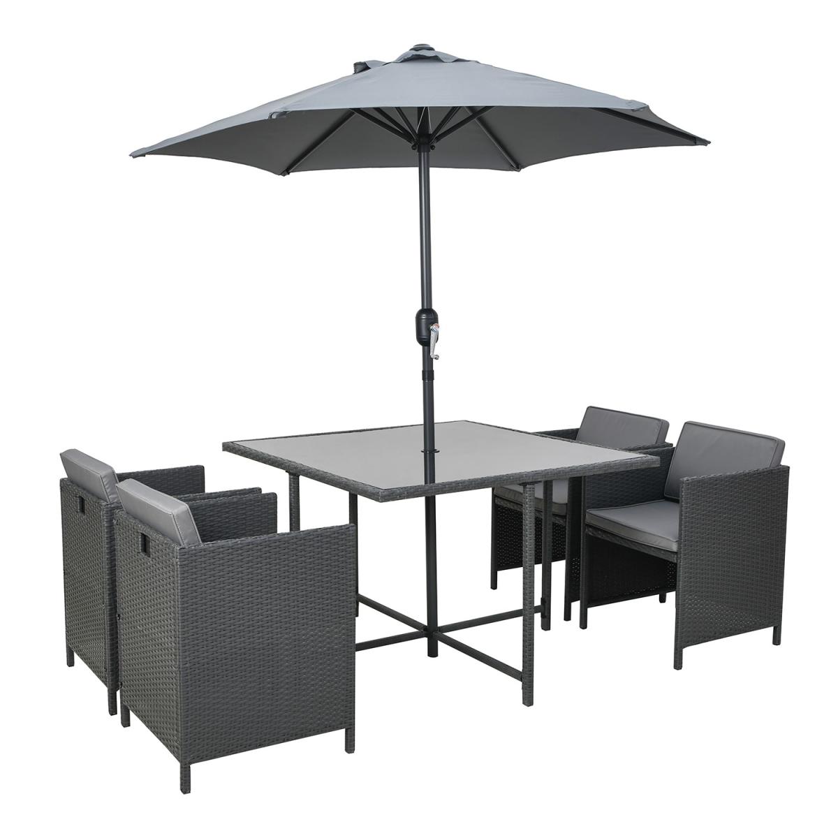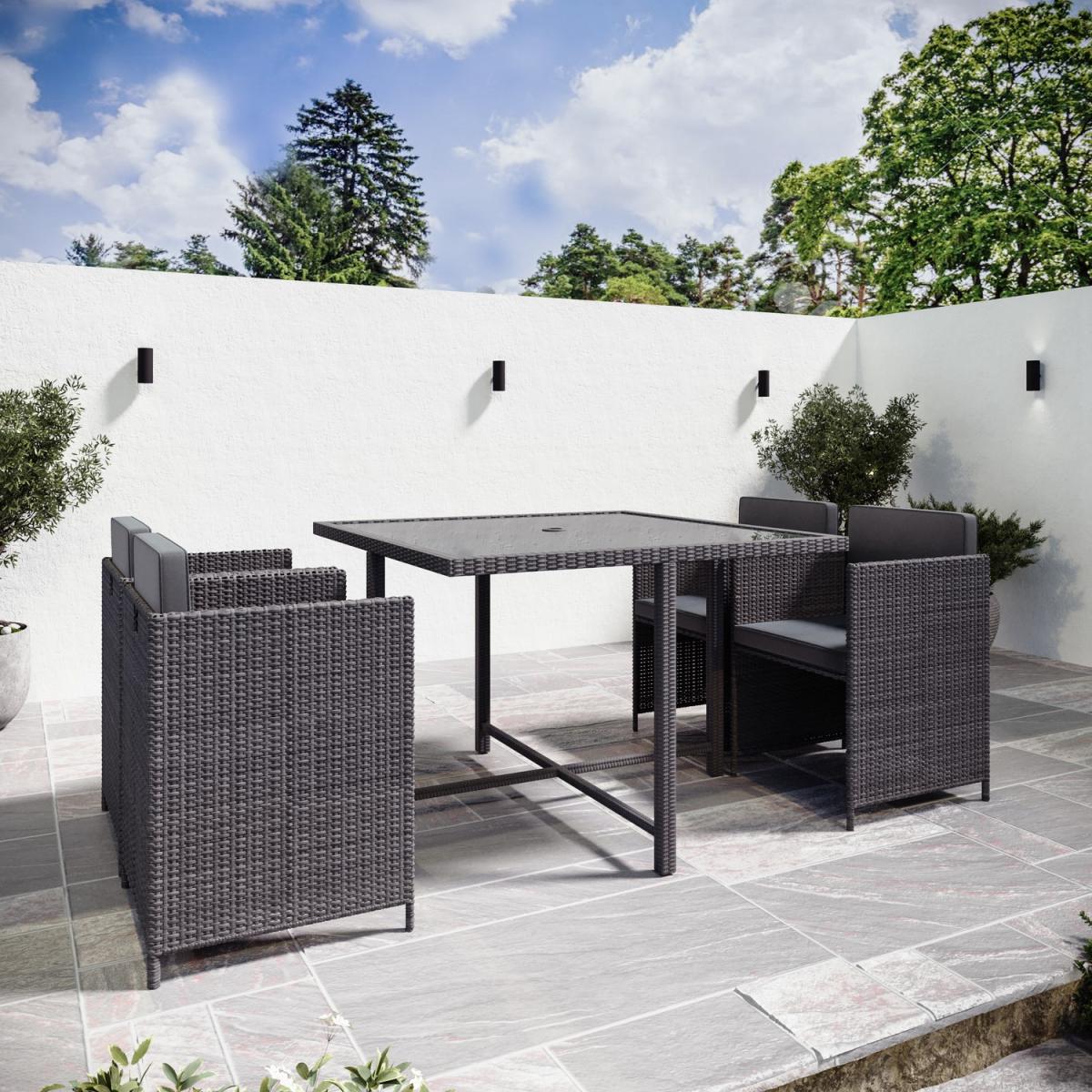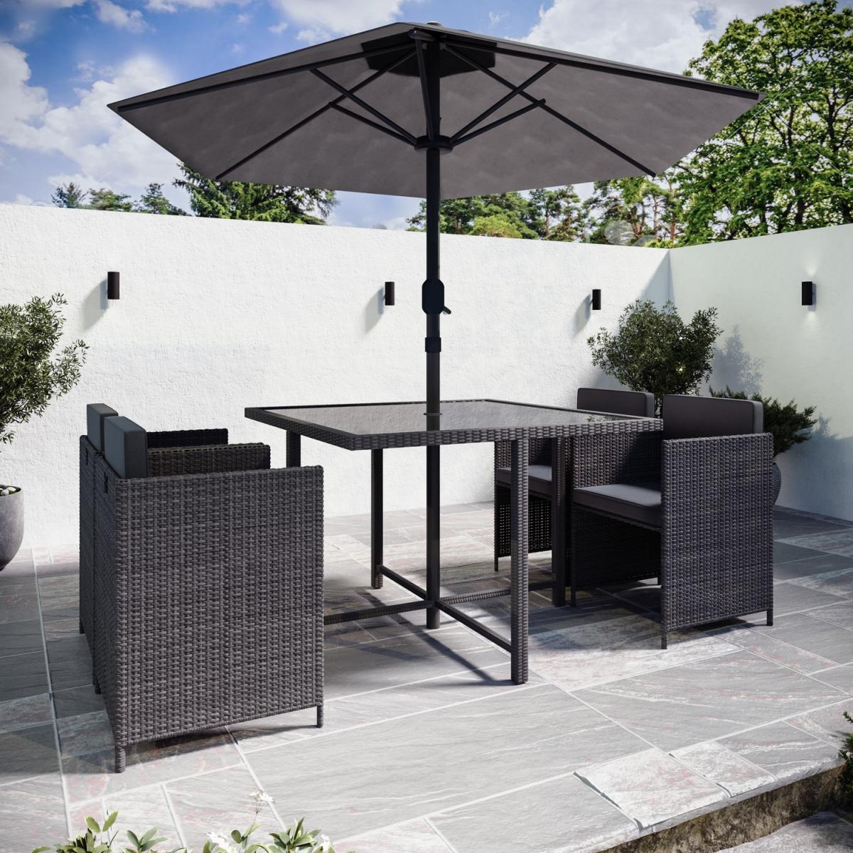 When not in use, the chairs tuck neatly under the table for a sleek, compact look. Low-maintenance and built to withstand the elements, ensuring year-round durability. Easy to clean and highly durable, with a parasol hole for added convenience. Plush, removable foam-filled seat and back cushions for added comfort. Provides sun protection and shade with an easy-to-use crank system. Strong, stable construction, designed for long-term outdoor use. Upgrade your outdoor dining experience with this stylish, compact 4-seater rattan cube dining set, designed with convenience in mind. The clever cube structure allows you to store the chairs underneath when not in use, saving space and maintaining a tidy outdoor area. Made from high-quality, weather-resistant rattan in a charcoal contemporary rattan weave, this durable and low-maintenance set is practical, elegant and effortlessly complements any outdoor décor. In addition, the included parasol with crank handle offers shade on sunny days and protection from a light shower and slots easily into the parasol hole in the centre of the table. This garden set is a must-have for any patio, decking, or garden space. Table dimensions:W110 x D110 x H74 cm Each chair dimensions:W53 x D53 x H66 cm Parasol dimensions: W200 x D200 x H220cm Max supported weight per seat: 110kg Overall weight: 51.5kg Seats: 4 Cushion thickness: 5cm Colour: Charcoal Finish: Powder coated, rattan weaving, tempered glass tabletop and upholstery Material: Synthetic flat rattan, powder coated steel (table / chair frames), glass (tabletop), polyester fabric (upholstery / parasol) and foam filled (cushions) Assembly required: Yes Number of boxes: 4