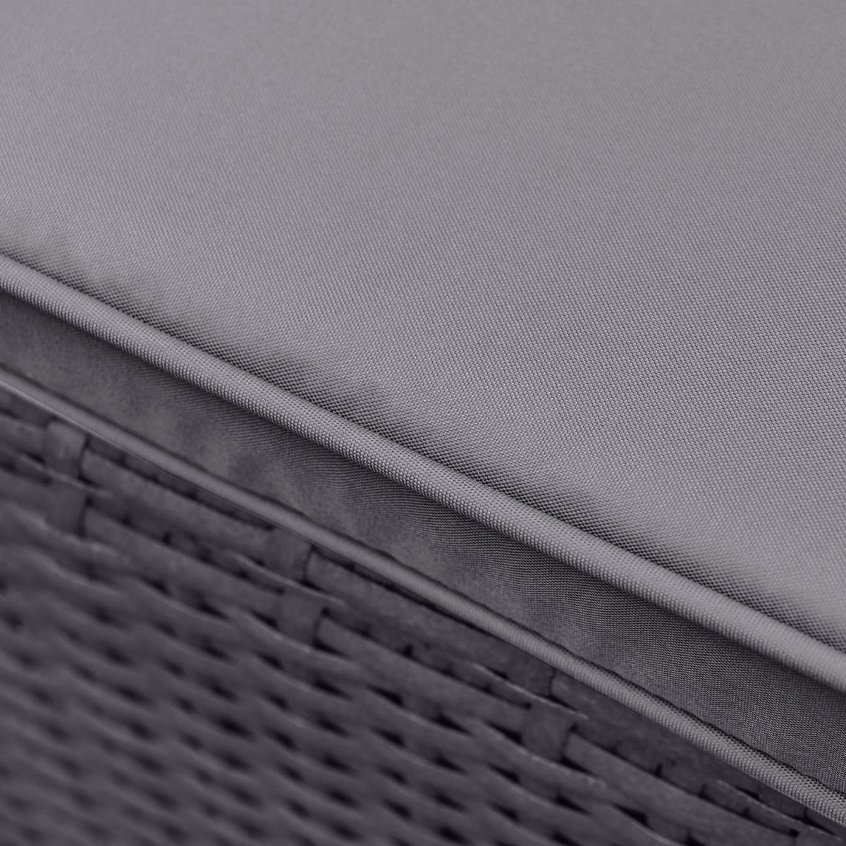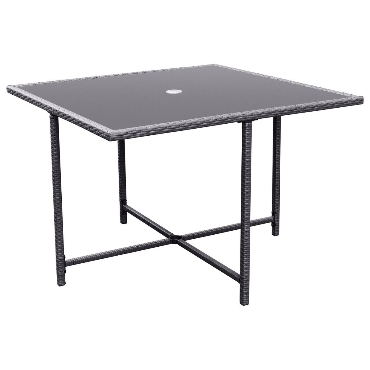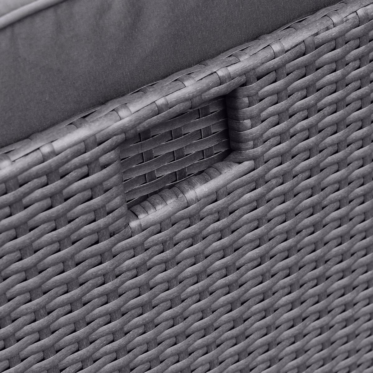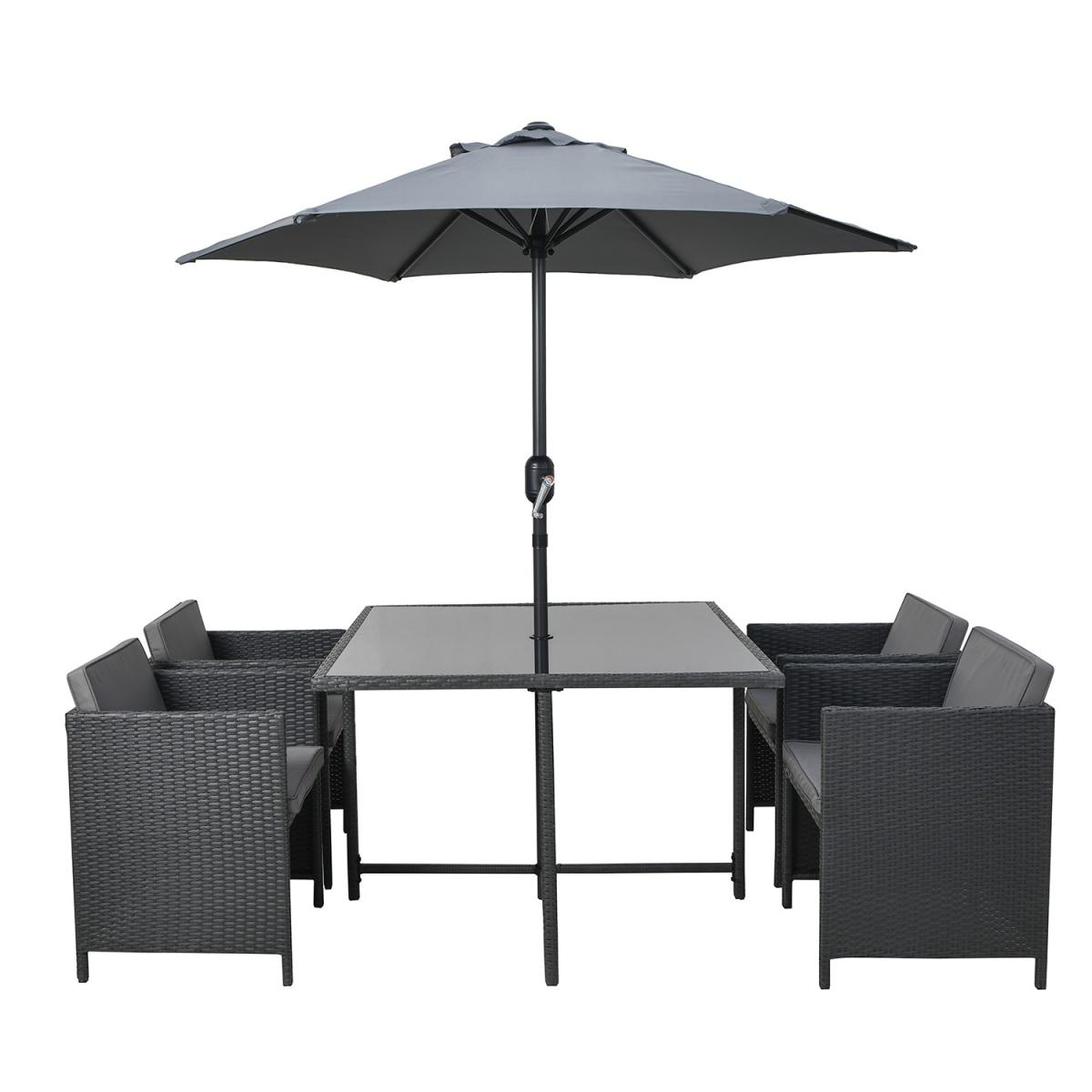 When not in use, the chairs tuck neatly under the table for a sleek, compact look. Low-maintenance and built to withstand the elements, ensuring year-round durability. Easy to clean and highly durable, with a parasol hole for added convenience. Plush, removable foam-filled seat and back cushions for added comfort. Provides sun protection and shade with an easy-to-use crank system. Strong, stable construction, designed for long-term outdoor use. Upgrade your outdoor dining experience with this stylish, compact 4-seater rattan cube dining set, designed with convenience in mind. The clever cube structure allows you to store the chairs underneath when not in use, saving space and maintaining a tidy outdoor area. Made from high-quality, weather-resistant rattan in a charcoal contemporary rattan weave, this durable and low-maintenance set is practical, elegant and effortlessly complements any outdoor décor. In addition, the included parasol with crank handle offers shade on sunny days and protection from a light shower and slots easily into the parasol hole in the centre of the table. This garden set is a must-have for any patio, decking, or garden space. Table dimensions:W110 x D110 x H74 cm Each chair dimensions:W53 x D53 x H66 cm Parasol dimensions: W200 x D200 x H220cm Max supported weight per seat: 110kg Overall weight: 51.5kg Seats: 4 Cushion thickness: 5cm Colour: Charcoal Finish: Powder coated, rattan weaving, tempered glass tabletop and upholstery Material: Synthetic flat rattan, powder coated steel (table / chair frames), glass (tabletop), polyester fabric (upholstery / parasol) and foam filled (cushions) Assembly required: Yes Number of boxes: 4