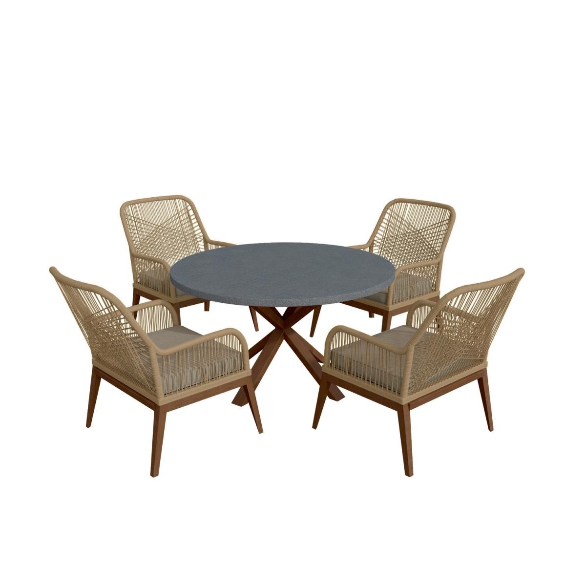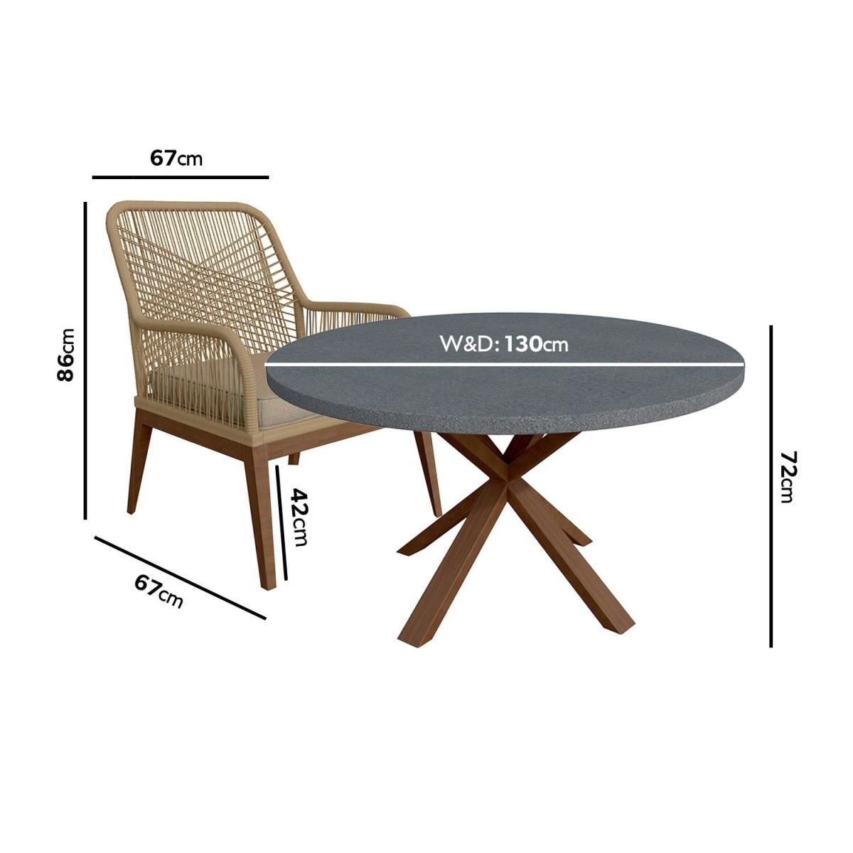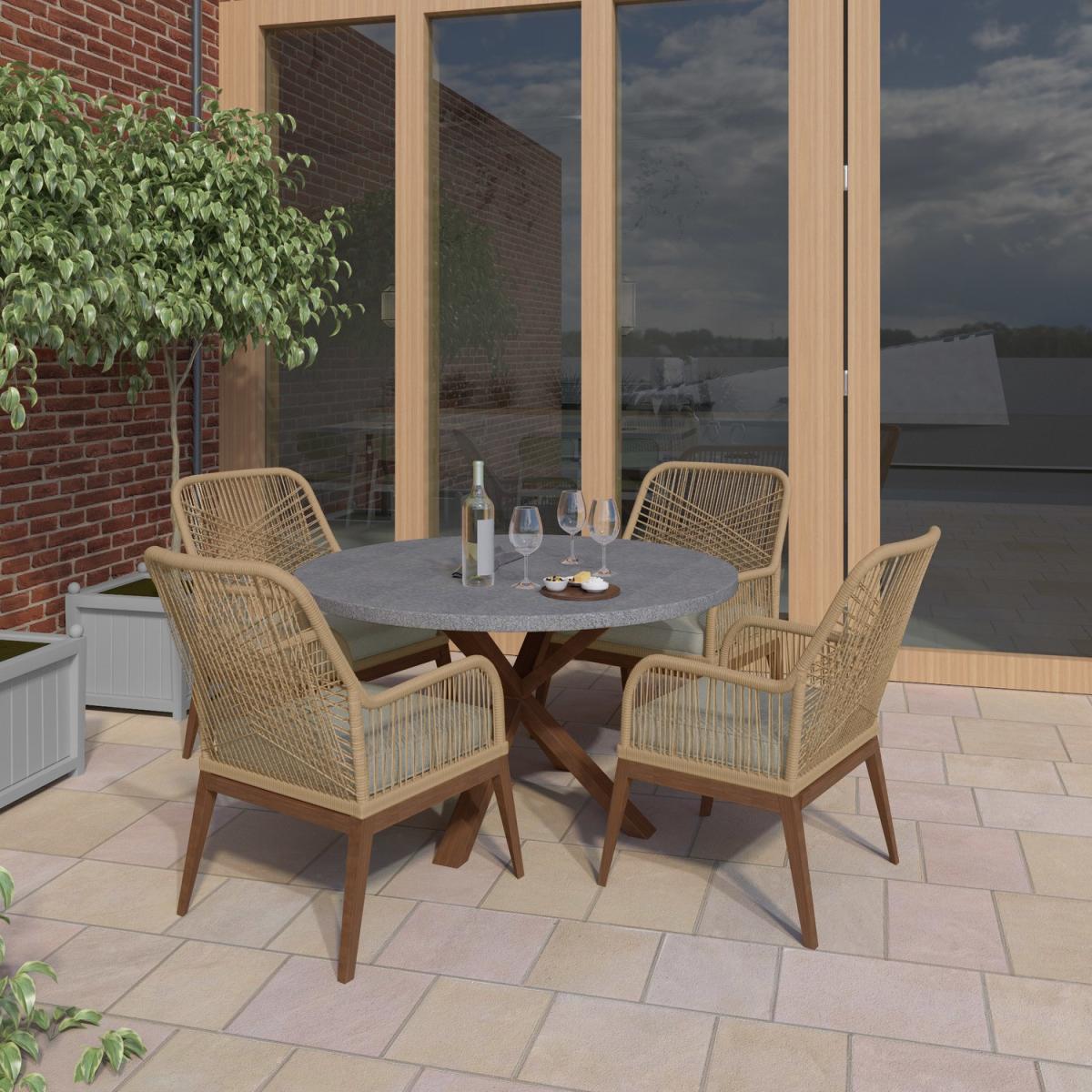 Features we love Contemporary rope chairs with tapered wooden legs. With stone-effect table top and; striking starburst frame. Can comfortably fit up to four people around the table. Curved armrests provide added comfort and support. With thick waterproof and; weatherproof seat cushions All about me. Enjoy intimate dining with this stylish dining set. The beige and brown add warmth to any outdoor or indoor space. It features impressive seating thanks to the intricate rope design on the chairs and a contrasting wooden table with a stone effect top; it’s sure to be a hit with guests. It's weather-resistant too making it a durable addition to your garden. Enhance the life of your garden furniture-. This product has been designed to be used outdoors. To make the most of your furniture we recommend that you store it indoors move it in a sheltered position or protect it by covering it up in bad weather and over the winter period. Why not invest in one of our garden stores to help keep upholstery (cushions) dry and prevent any mould or mildew from forming. Need to know. Table dimensions. W130 x D130 x H73 cm Chair dimensions. W60 x D68 x H90 cm Table weight. 50kg Chair weight. 8.5kg Seats. 6 people Colour. Beige mix (rope) brown and; grey Finish. Stone effect table top rope and; upholstery (chairs) Material. Aluminium (frame) rope fabric (chairs / cushions) and acacia timber (base) and; polystone table top (table) For use. Indoors (suitable for wooden floors) and; outdoors Assembly required. Yes What's in the box? 4 x Armchairs1 x Table.