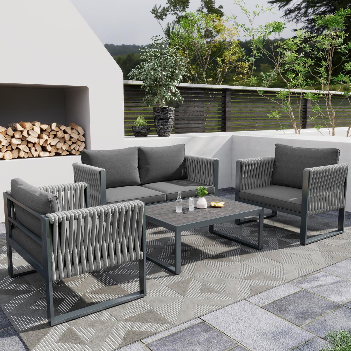 Enhance your outdoor space with this elegant garden furniture set, which blends modern aesthetics with vintage charm. The collection includes a spacious double sofa, two generously sized single sofas, and a functional coffee table designed for both style and comfort. Built with a lightweight galvanized iron frame featuring a protective anti-rust coating, this set withstands outdoor elements while maintaining its appeal. The hand-woven thick rope armrests offer durability against UV rays and weather, adding a touch of artisanal craftsmanship. Thoughtful details like adjustable footrests ensure stability on any surface while protecting your flooring. Complete with luxurious 10 cm thick cushions, this set provides exceptional comfort for relaxing outdoors. Perfect for creating a sophisticated and inviting garden retreat that combines practicality with timeless design.