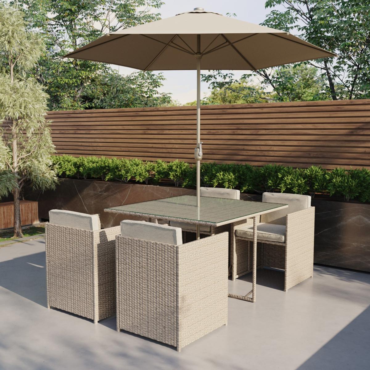 All about me Make the most of your garden with this modern 4-seater dining cube set. It's practical thanks to its compact design; when you're not using, the seats tuck neatly under the table, forming a tidy cuboid shape, saving you on garden space. In addition, it includes a parasol with an easy crank mechanism to protect you from sun and light showers. It slots easily into the parasol hole in the centre of the table, so there's no need to worry about securing a freestanding one. It'll make a fab addition to your garden all year round. Enhance the life of your garden furniture- This product has been designed to be used outdoors. To make the most of your furniture, we recommend that you store it indoors, move it to a sheltered position or protect it by covering it up in bad weather and over the winter period. Why not invest in one of our garden stores? They keep upholstery, such as cushions, dry to prevent mould or mildew from forming. Need to know Table dimensions: W115 x D115 x H74 cm Each chair dimensions: W56 x D56 x H68 cm Max supported weight per seat: 120kg Overall weight: 57.7kg Seats: 4 Tabletop thickness: 5mm Cushion thickness: 5cm Colour: Natural and cream (upholstery) Finish: Rattan & upholstery Material:Synthetic woven rattan, powder-coated steel (frames), polyester fabric (upholstery), foam fill (cushions) and tempered glass (tabletop) For use: Indoors & outdoors (suitable for wooden floors) Assembly required:Yes Total number of boxes: 3 What's included? 1 x Table 4 x Chairs 4 x Seat cushions 4 x Seat cushions 1 x Parasol 1 x Parasol cover