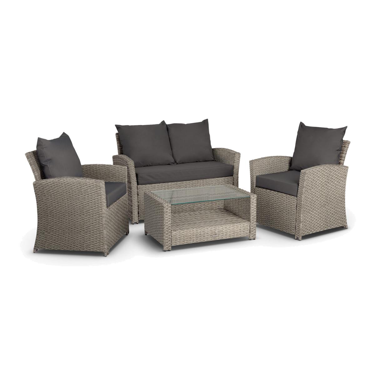 Ideal for lazy al fresco breakfasts on sunny days or evening drinks with family and friends, this stylish 4-piece rattan garden set will add a touch of elegance to your garden or conservatory. Made from durable PE rattan in a traditional basket weave style, this weather resistant and hardwearing set can be left outdoors all year round, just bring the cushions inside during bad weather to keep them looking their best. Comprising two high backed armchairs and matching sofa, the deep filled cushions add an extra layer of comfort and luxury to this fabulous set. The PE cushion covers are removable and fully washable, ideal for keeping this furniture set looking brand-new season after season. A welcome addition to any outside space, the long table with tempered glass top offers ample space to store books and magazines. The PE rattan has a smart and contemporary grey colourway and coordinates beautifully with the other items in the Von Haus range, including outdoor sofa sets, dining sets and ottomans. Simple assembly required. Comes complete with instructions that will guide you through every step of construction, ideal if you want hassle-free gorgeous garden furniture.
